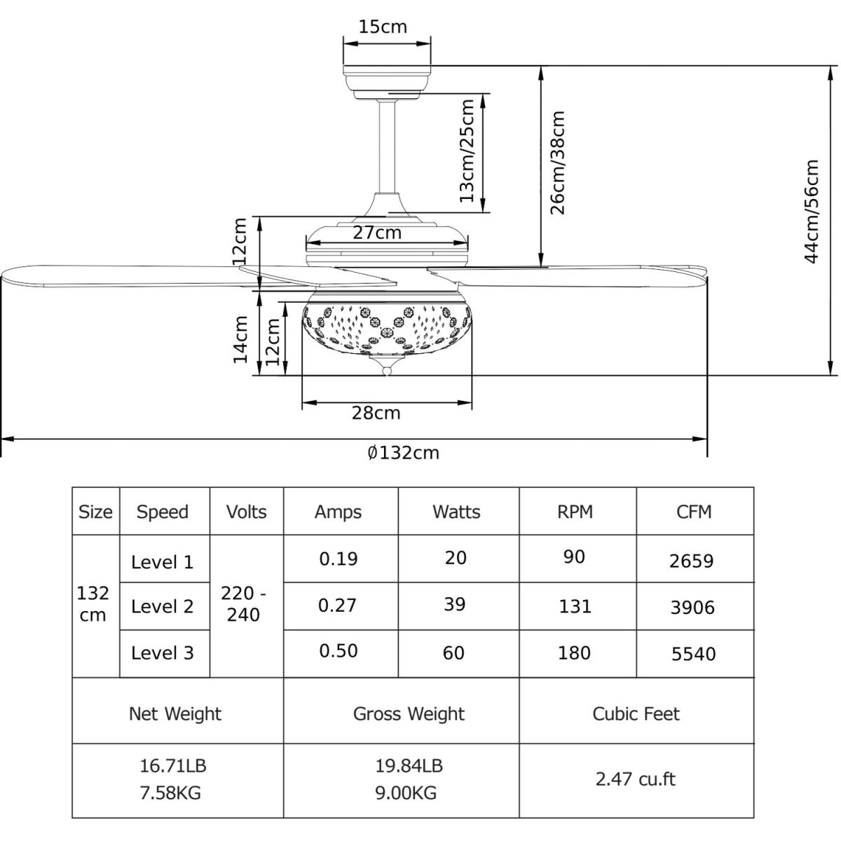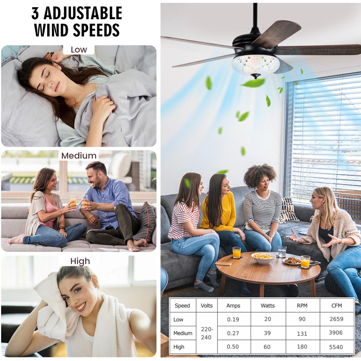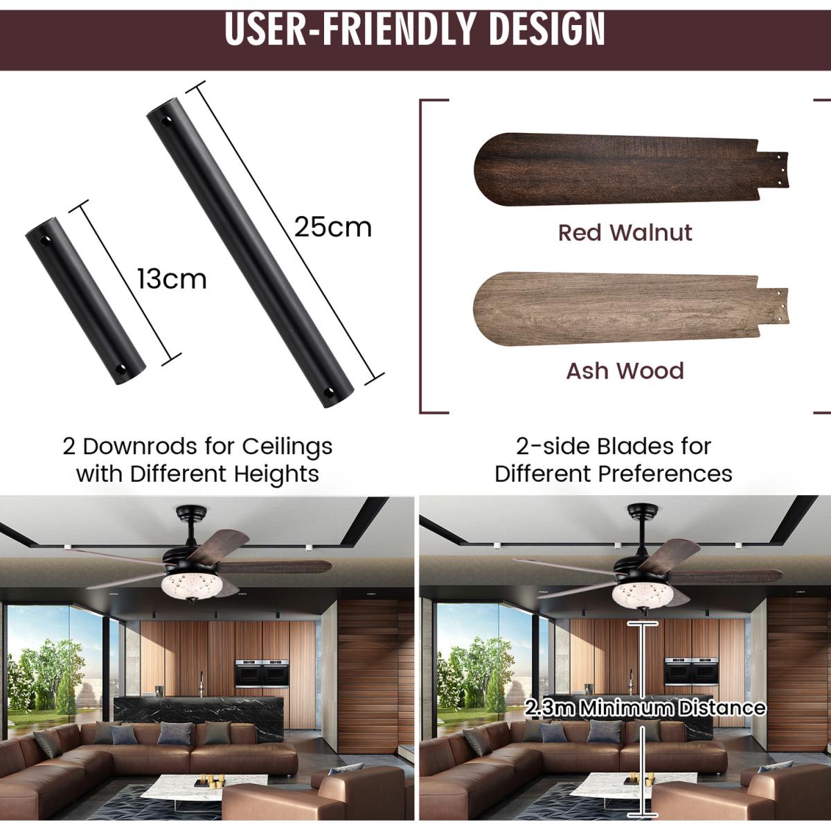 If you are looking for a retro ceiling fan, ours is perfect for you! Designed with a retro appearance, this ceiling fan will be the perfect decoration in your home. As for practicability, equipped with a reversible motor to make the dual-finish blades run clockwise and counterclockwise for summer and winter use. And you can curl up on the sofa to use the handy remote control to operate this ceiling fan. 3 adjustable wind speeds and 4 hours timer satiate your various needs. Besides, the 2 downrods (13cm/25cm) and 2 mounting options (downrod and angled) make this home ceiling fan fit most ceilings.