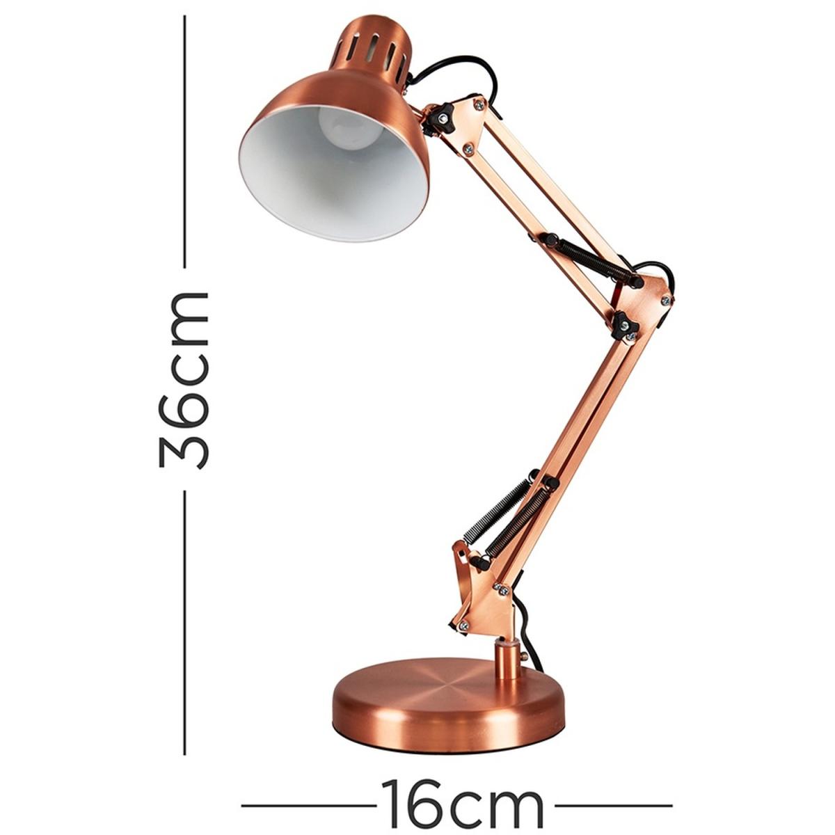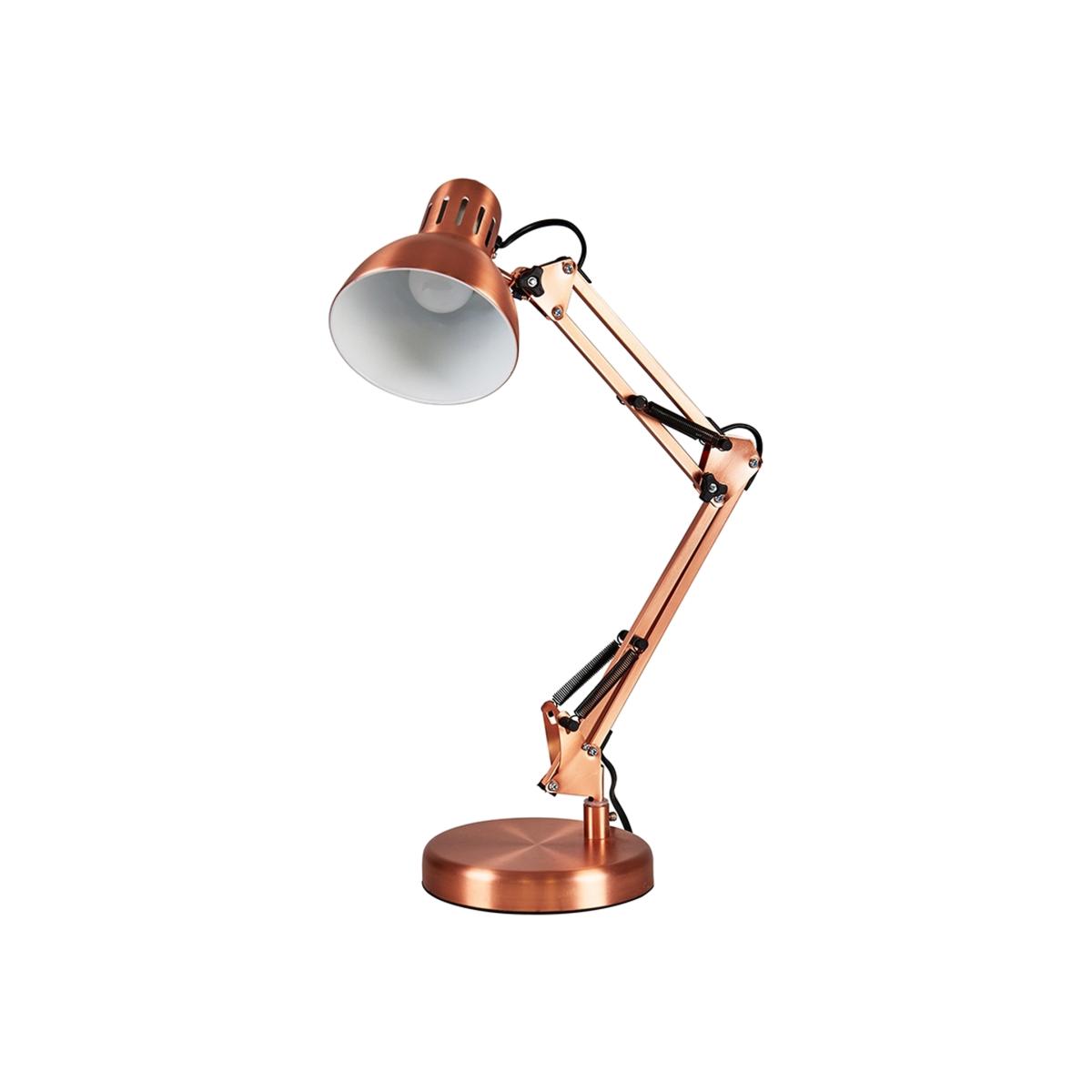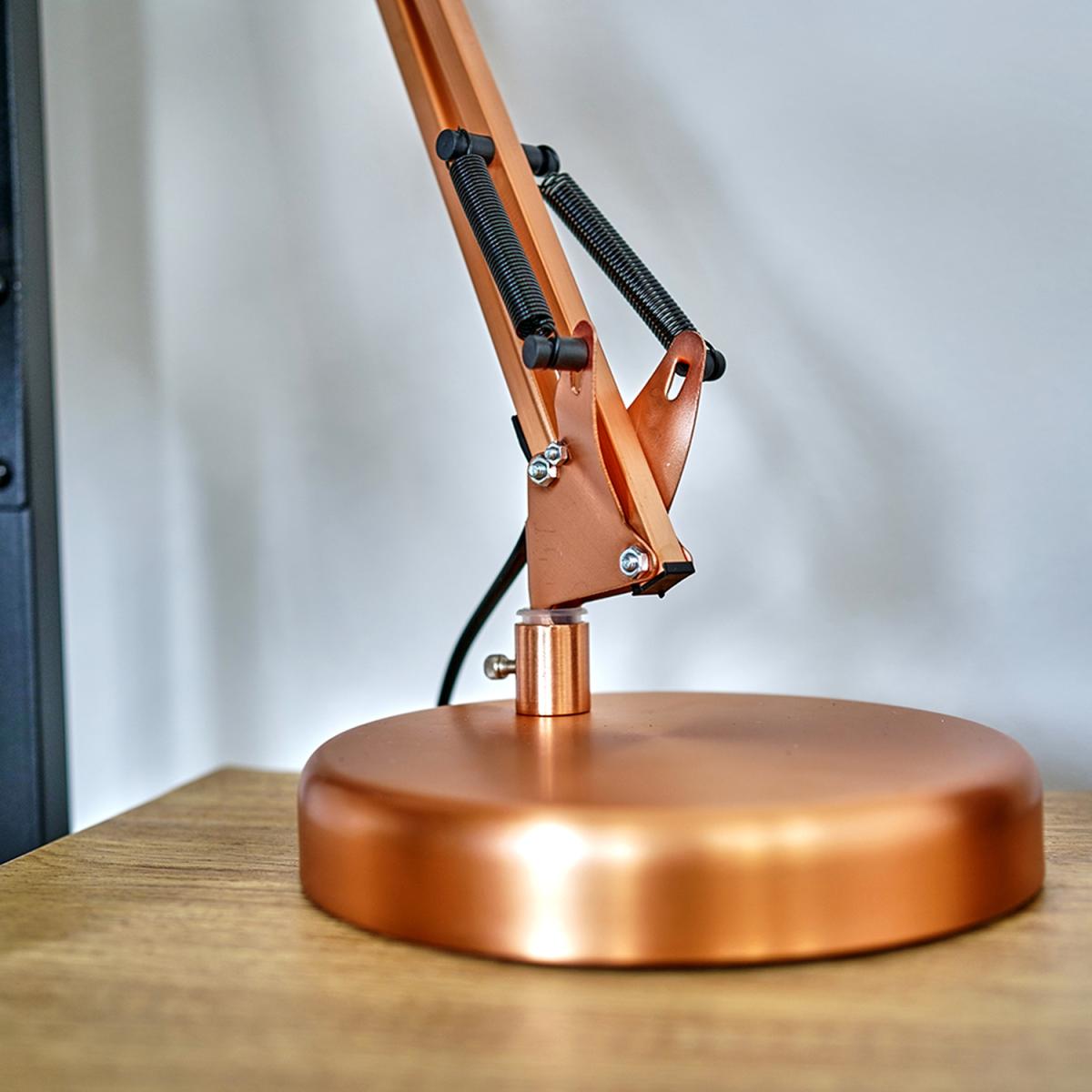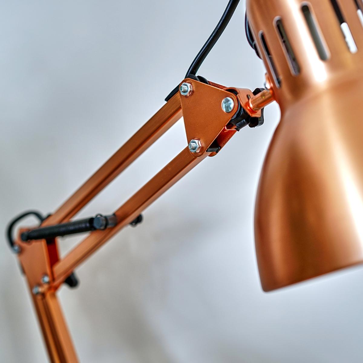 This desk lamp in a brushed copper metal finish is everything you need to transform your ordinary room into an example of modern interior design. Featuring intricate detailed joints for easy adjustments, a cover shaped base adding depth and sturdiness to the lamp, and a dome head that adds to a contemporary feel to the product. This table desk lamp is perfect for any home or work space, inspired heavily by 'Luxo', lamp made famous by Pixar in 1986. A theme-defining element that creates a relaxing, ambient atmosphere. Ideal for studying, bedside reading and more.