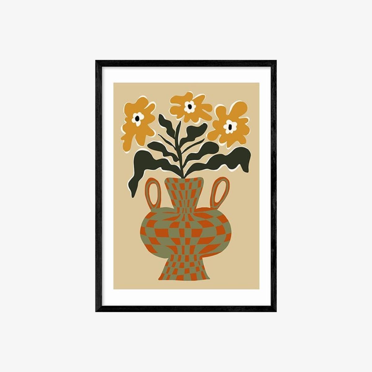 Let the home bloom in with these vintage flowers in a green and orange retro-checkered pot. With its warm colour and abstract shape, this flowerpot will add a floral twist with a retro flair. Only giclee printing processes are used for this print resulting in the highest quality museum-level colours and sharpness. Choose between a number of different coloured frames and three sizes for the perfect print for your space.