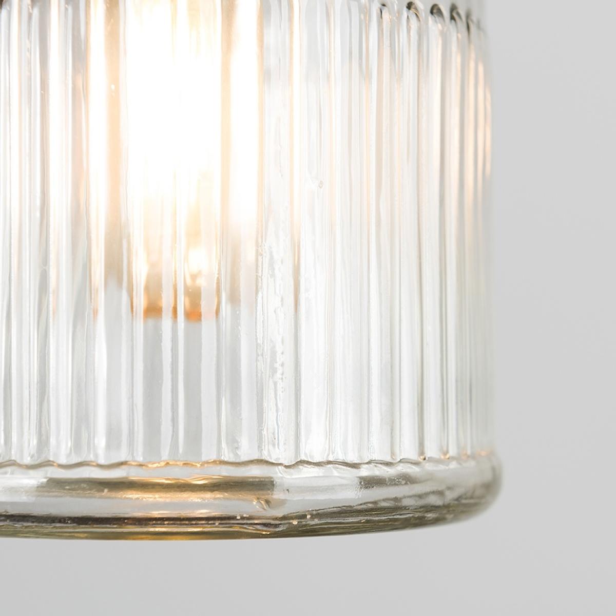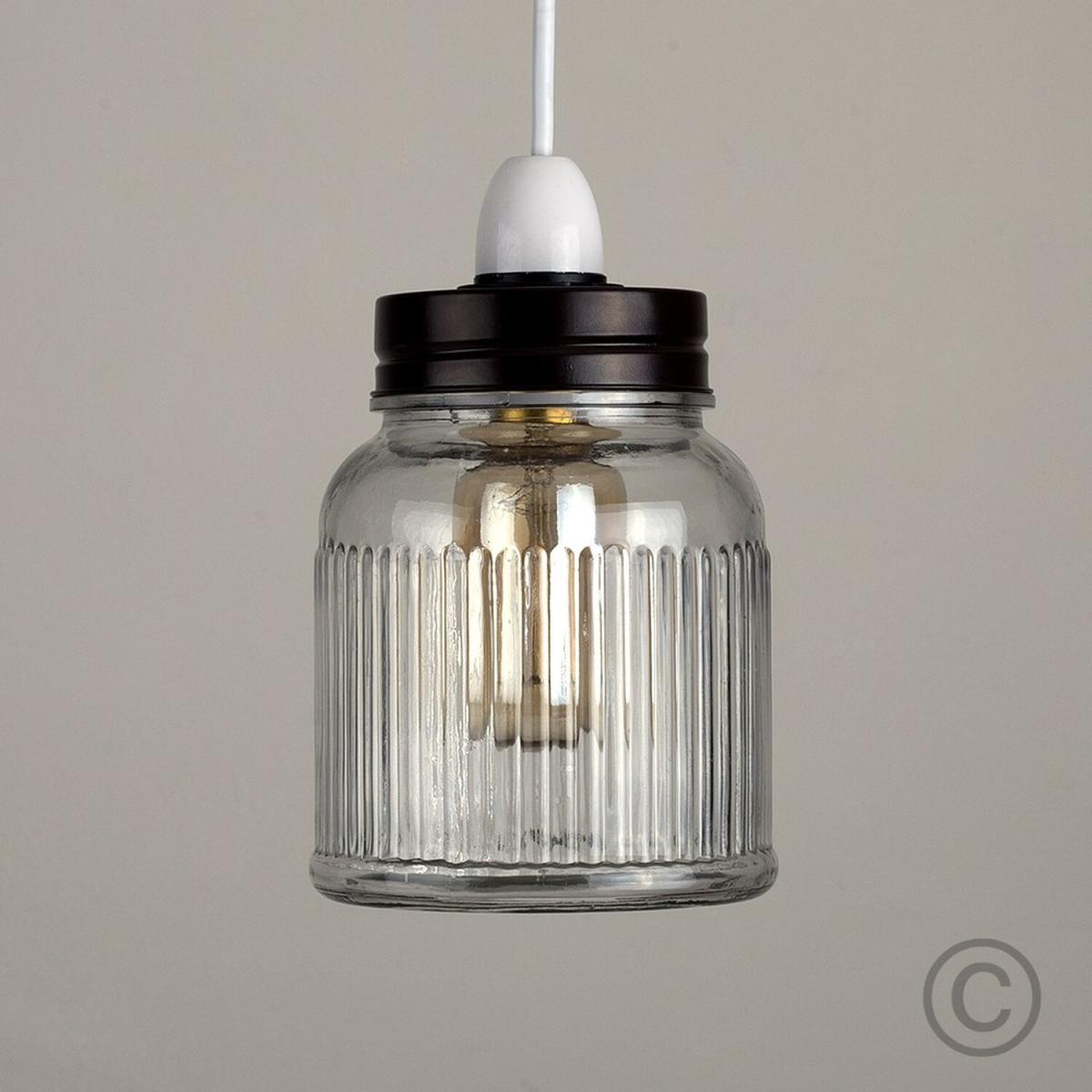 Retro style jar ceiling pendant light shade in a clear textured ribbed pattern glass finish. Ideal for living rooms, bedrooms, dining rooms and hallways. Easily fits to a ceiling light socket - no electrical installation required. Ceiling lights are usually the main source of illuminating a room but with the many styles on offer today, also become a main focal point or talking point. The right fitting can make a real style statement and complete your living space look. The ideal bulb to use with this item is a 40w BC (bayonet cap) bulb.