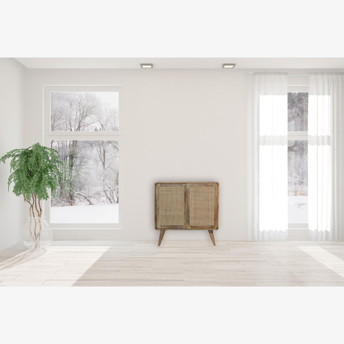 This stylish Nordic Close-knit cabinet combines a woven door front with a smooth oak-ish finish body and legs. Constructed from 100 solid mango legs it features 3 spacious drawers perfect for storage, a shiny knob son the drawers, and nordic style legs. Make full use of this cabinet in the living room and partner it with the rest of the collection.