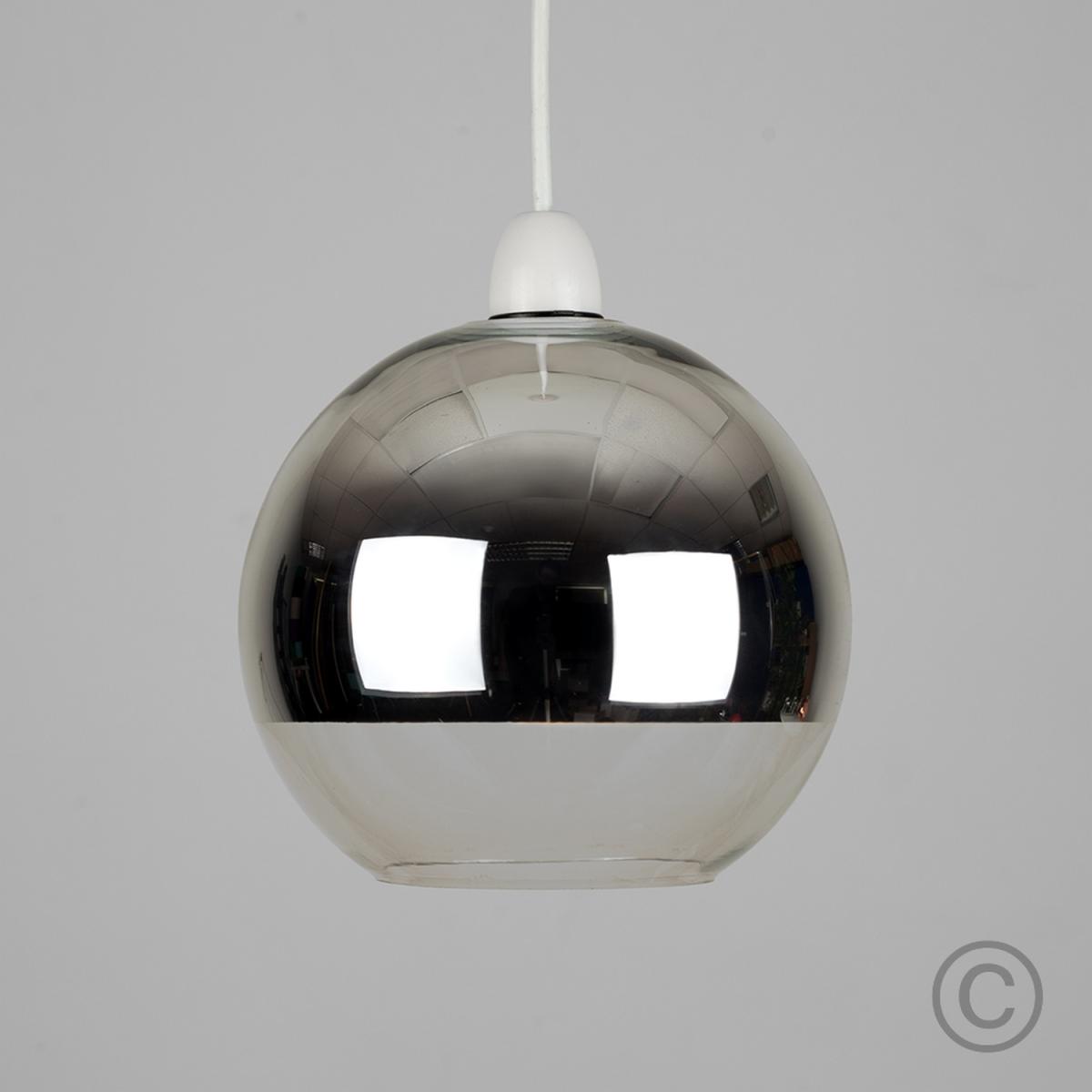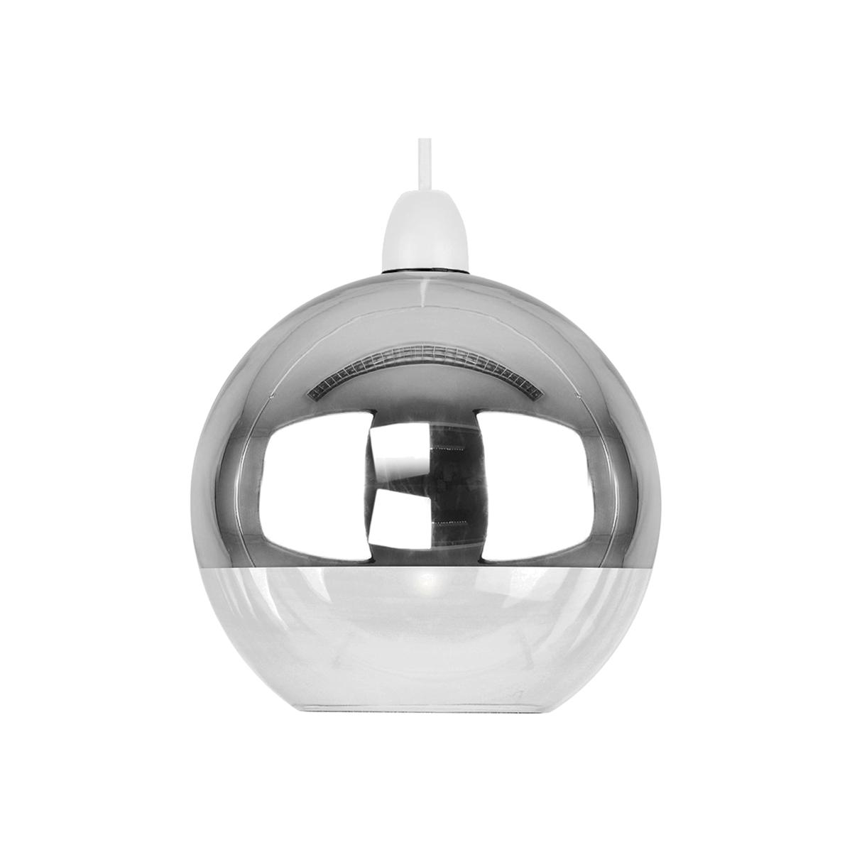 Modern ceiling pendant light shade in a stunning combination of clear and chrome effect glass. This superb light shade features an unusual two tone globe design. This looks great either on it own or in a series of two or more. Ideal for living rooms, bedrooms, dining rooms and hallways. Easily fits to a standard ceiling light socket - no electrical installation required. 1 x 40w BC B22 GLS Bulb Is Required - Not Supplied.