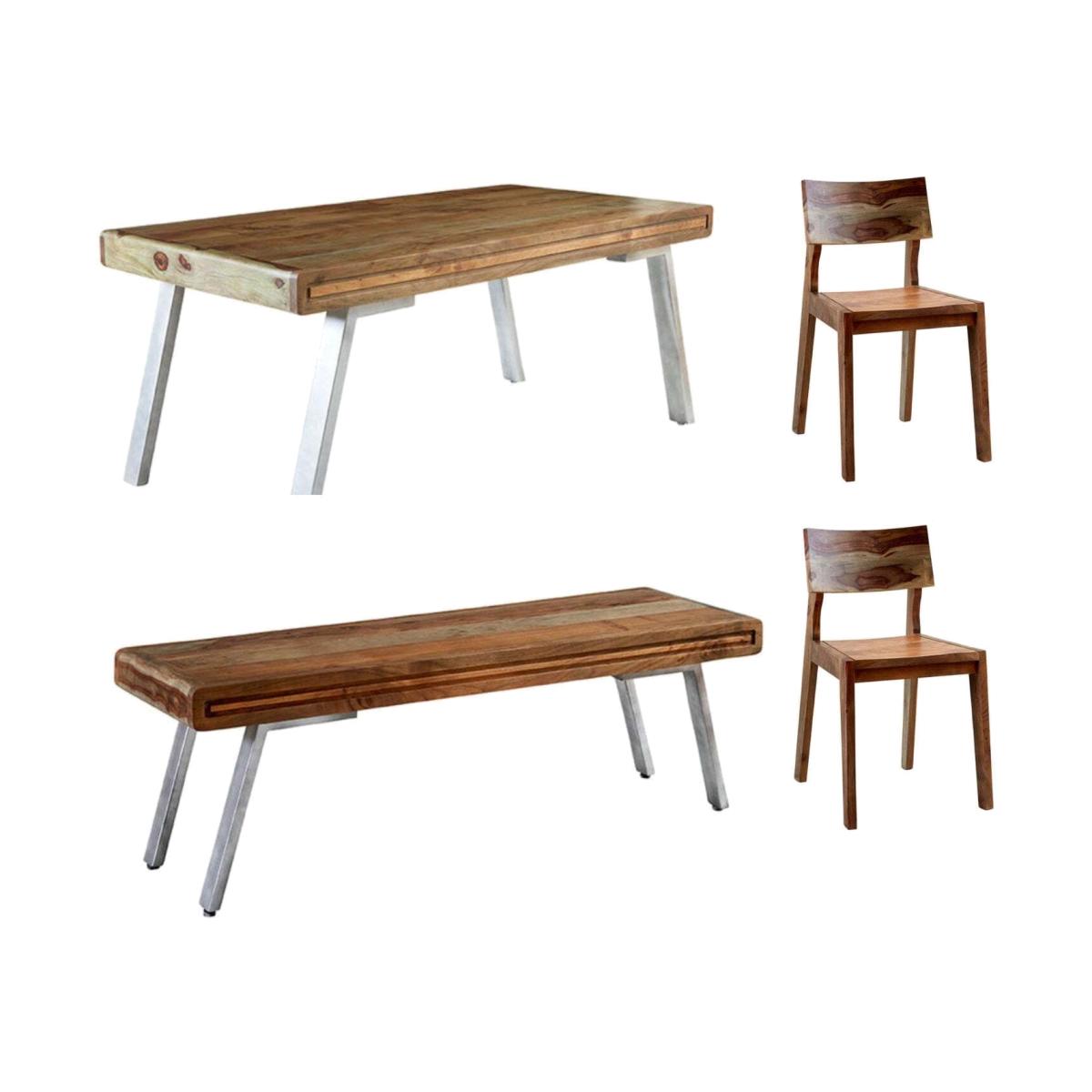 Retro Wood And Metal Medium Dining Table Set With 1 Bench And 2 Chairs - Natural Wood