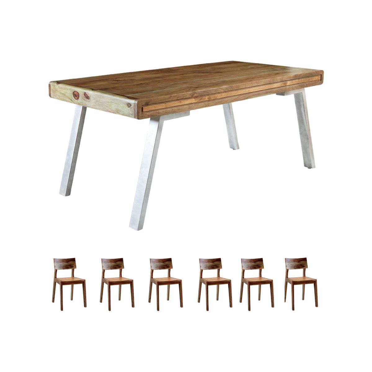 Retro Wood And Metal Medium Dining Table Set With 6 Chairs - Natural Wood