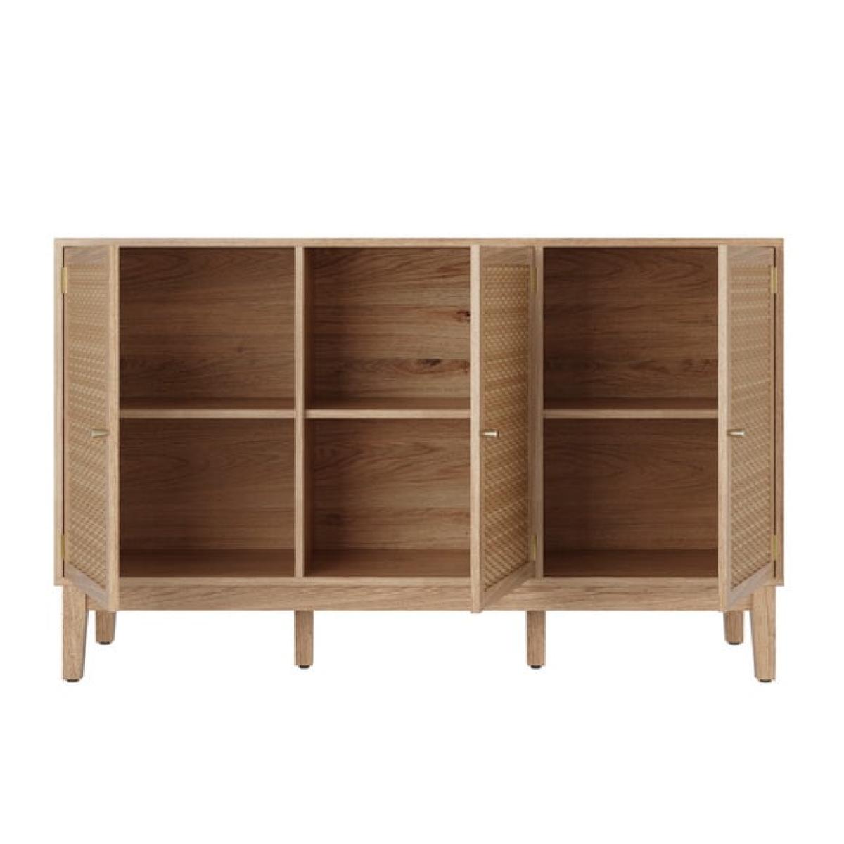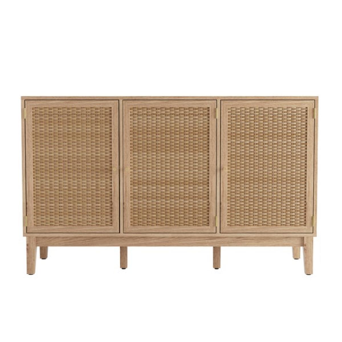 This product is priced at 10% less than a brand new model. Brand new price is £269. Returned product price is £242.10. Saving of £26.90. This is a returned item. It has previously been ordered, dispatched, cancelled and collected from our customers and then fully checked by our expert team to ensure that it is in 100% tip top condition and fully packaged. It was cancelled upon delivery and has therefore never been used. However, because this line is not strictly 'new', we have discounted it to clear! * Large sideboard * 3 cupboards * Rattan fronts * Gold effect fittings and handles * Modern, boho vibe Keep your home organised and get rid of clutter with this beautiful sideboard. The Alexander large sideboard is an eye-catching addition to any dining room or lounge. Featuring rattan fronts, this stylish piece adds a boho feel to its surroundings as well as plenty of storage for your dining ware and decorations.