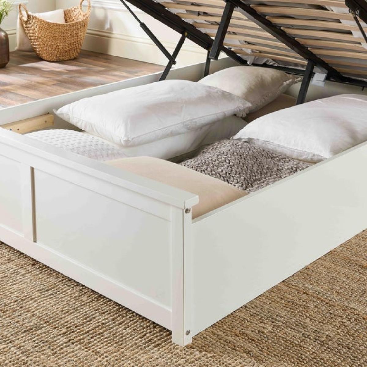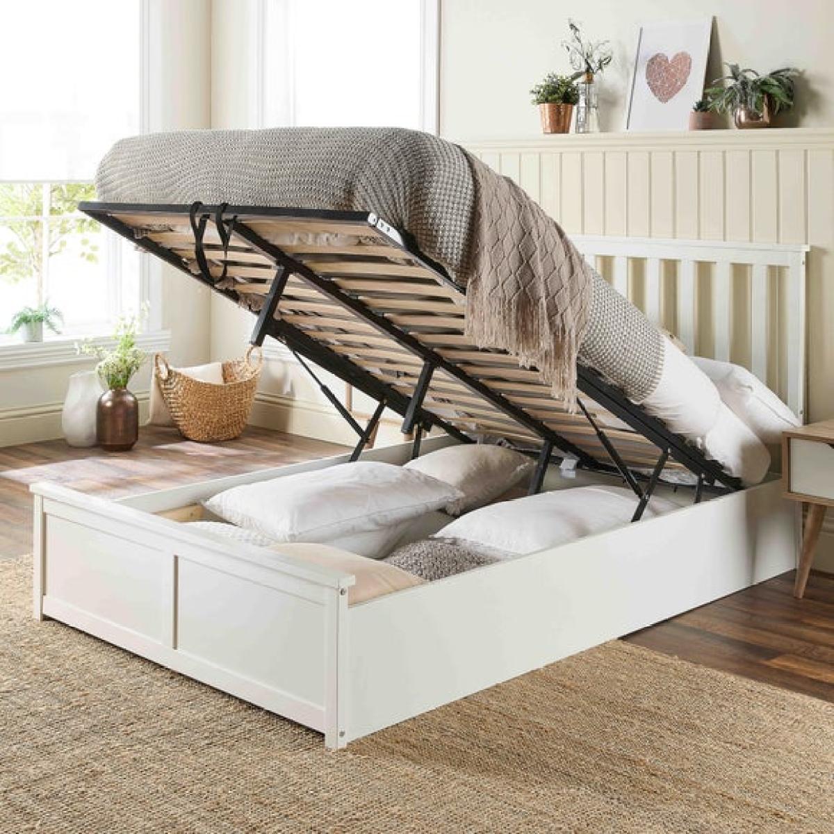 This product is priced at 10% less than a brand new model. Brand new price is £299. Returned product price is £269.10. Saving of £29.90. This is a returned item. It has previously been ordered, dispatched, cancelled and collected from our customers and then fully checked by our expert team to ensure that it is in 100% tip top condition and fully packaged. It was cancelled upon delivery and has therefore never been used. However, because this line is not strictly 'new', we have discounted it to clear! * Wooden frame * Shaker style * Large storage area * Sprung slatted base This ottoman bed is finished in a crisp white paint or a natural look, combining classic shaker design with modern functionality to elevate any bedroom. Its elegant headboard and clean lines bring timeless sophistication, while the ottoman feature offers a clever storage solution—simply lift the mattress for easy access to a spacious compartment perfect for stowing away bedding, pillows, or seasonal items.
