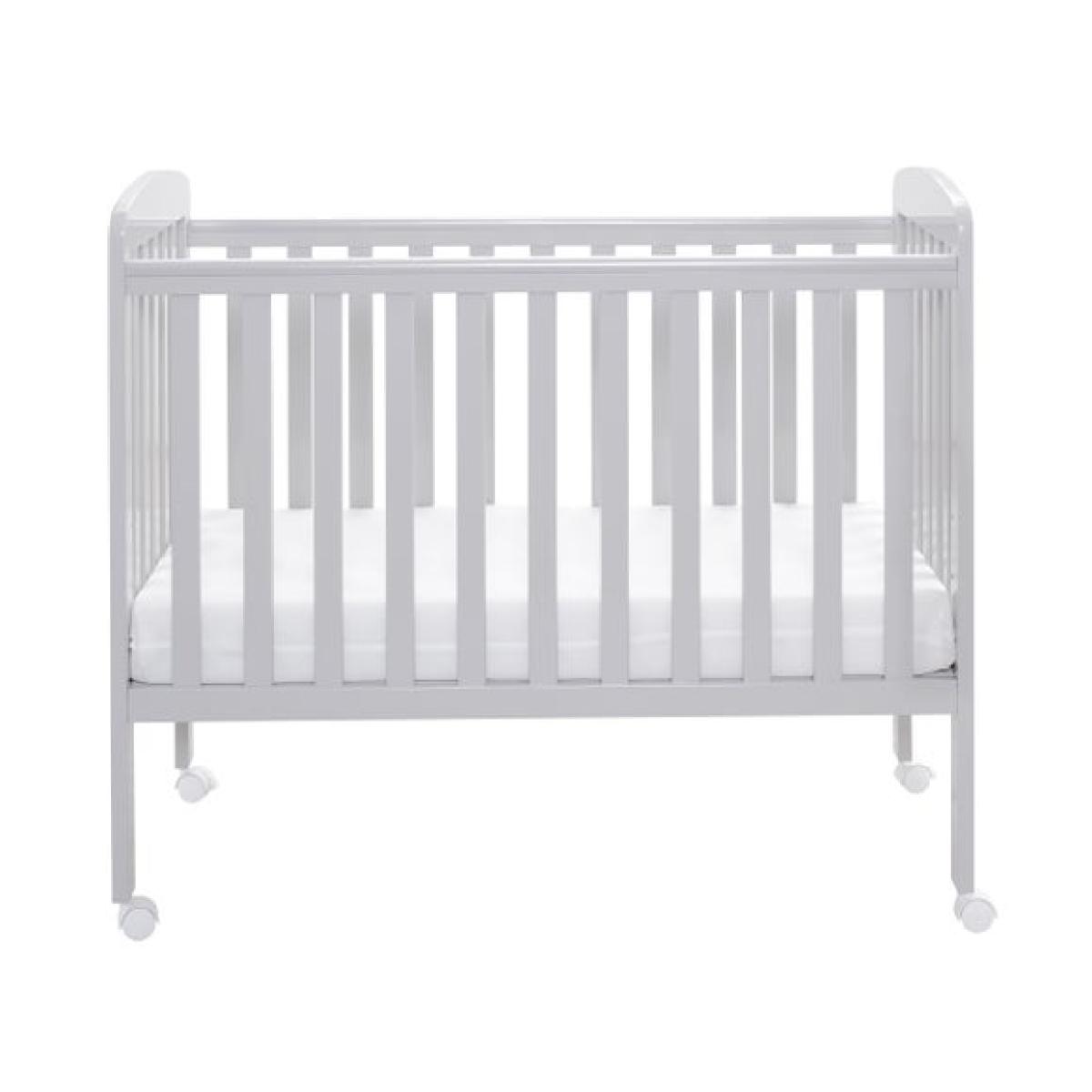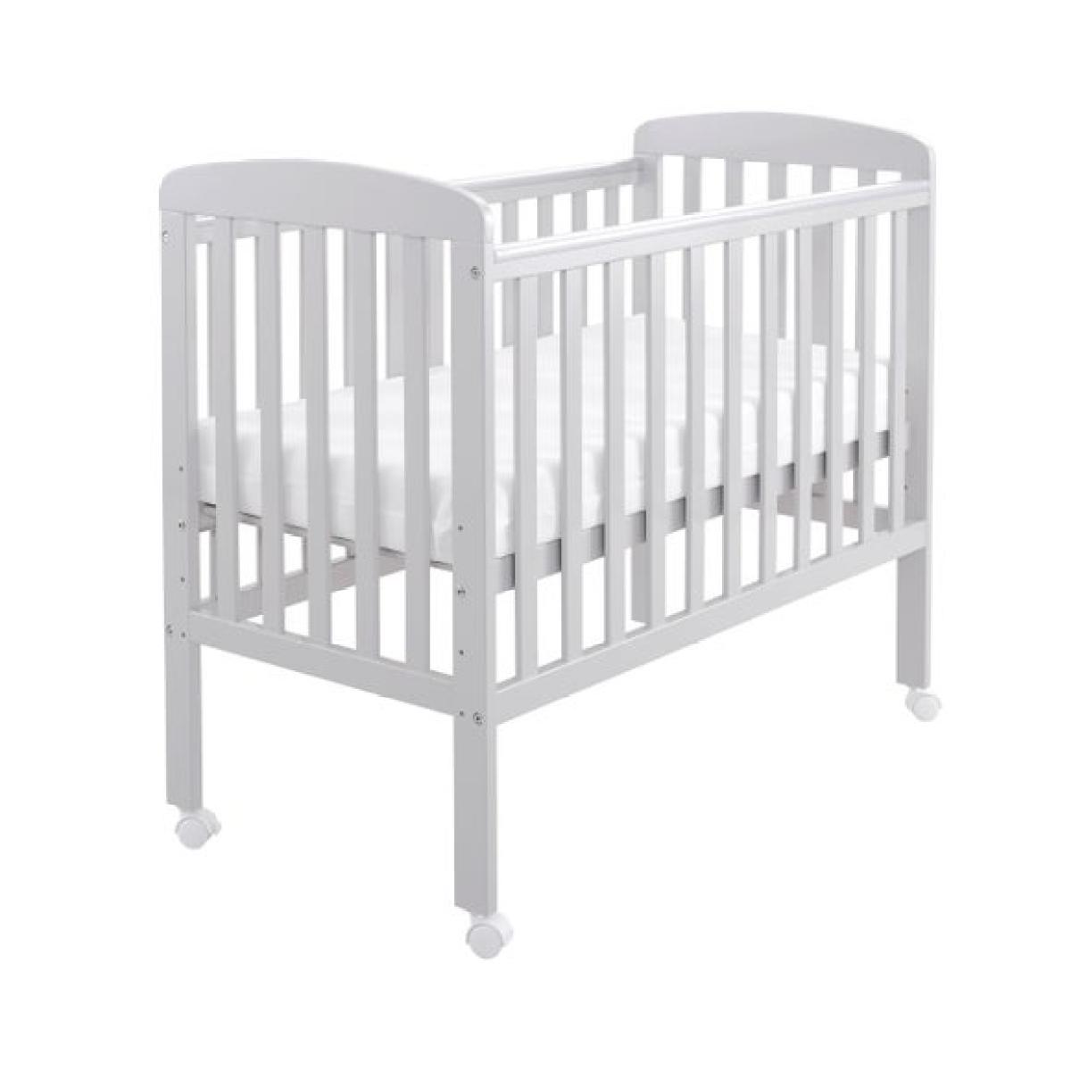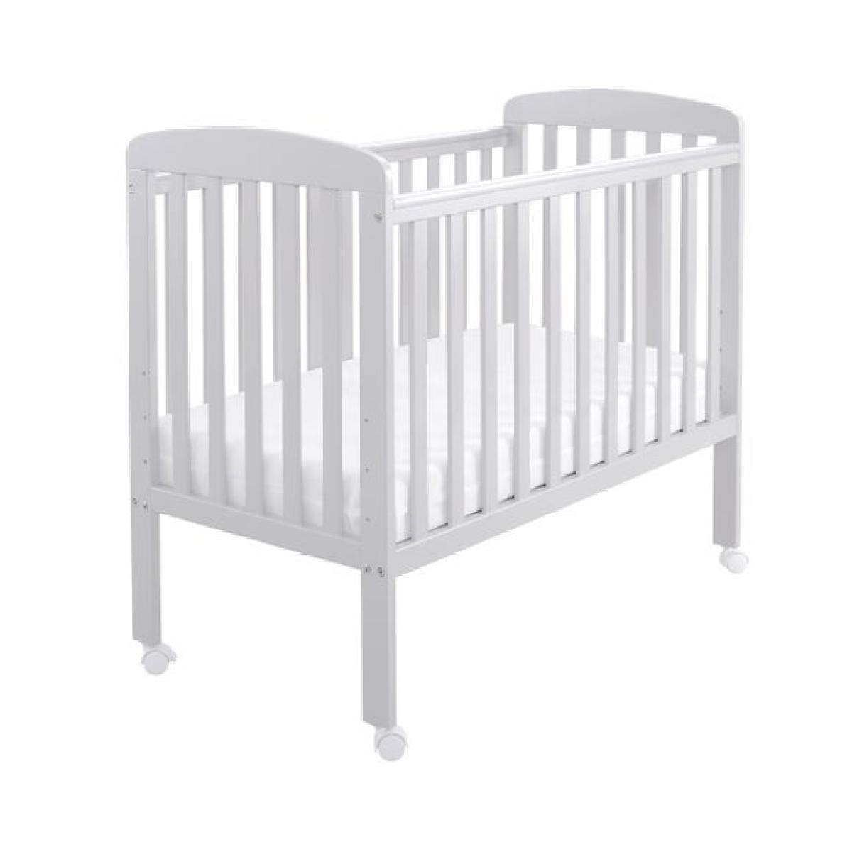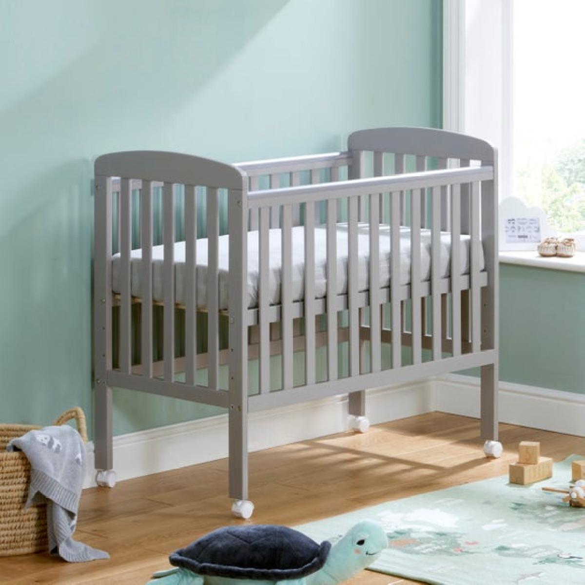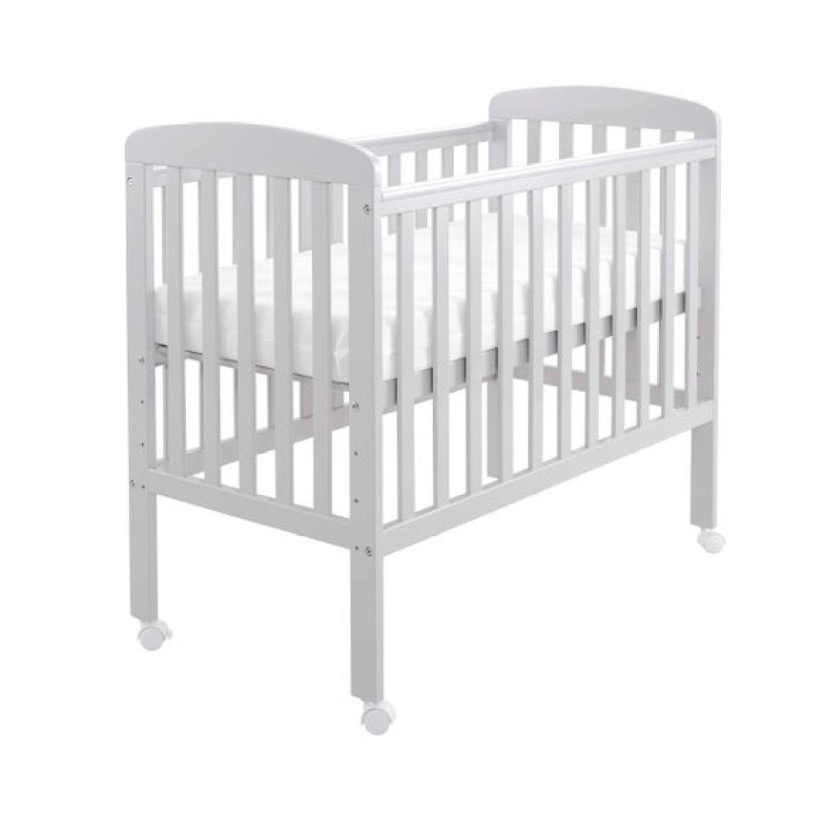 This product is priced at 10% less than a brand new model. Brand new price is £119. Returned product price is £107.10. Saving of £11.90. This is a returned item. It has previously been ordered, dispatched, cancelled and collected from our customers and then fully checked by our expert team to ensure that it is in 100% tip top condition and fully packaged. It was cancelled upon delivery and has therefore never been used. However, because this line is not strictly 'new', we have discounted it to clear! * Space saver cot * Includes: 2 x removable wheels (lockable) * Suitable from newborn to (approx) 12 months old * Four adjustable mattress base positions * Protective teething rail on top of both sides * Complies with safety standards * Compatible with mattress size 100 x 50cm (sold separately) * Available in a white or grey colour option Designed for smaller spaces, Babymore’s Space Saver Cot is made for those who want all the benefits of a solid cot but without the bulk. Perfect for placing in most parent’s bedrooms, this cot has the benefit of lasting around 12 months and the four different mattress positions allow you to adjust the base as your baby grows. The option of adding lockable wheels on the cot allows easy movement around your space. A protective teething rail is fitted along both sides to protect the wood from nibbling and teething marks and comes with a 6 month guarantee from date of purchase, which can be extended to 12 months if the product is registered online with Babymore within 28 days of receiving the item.*Not Compatible with the Babymore Cot Top Changer.