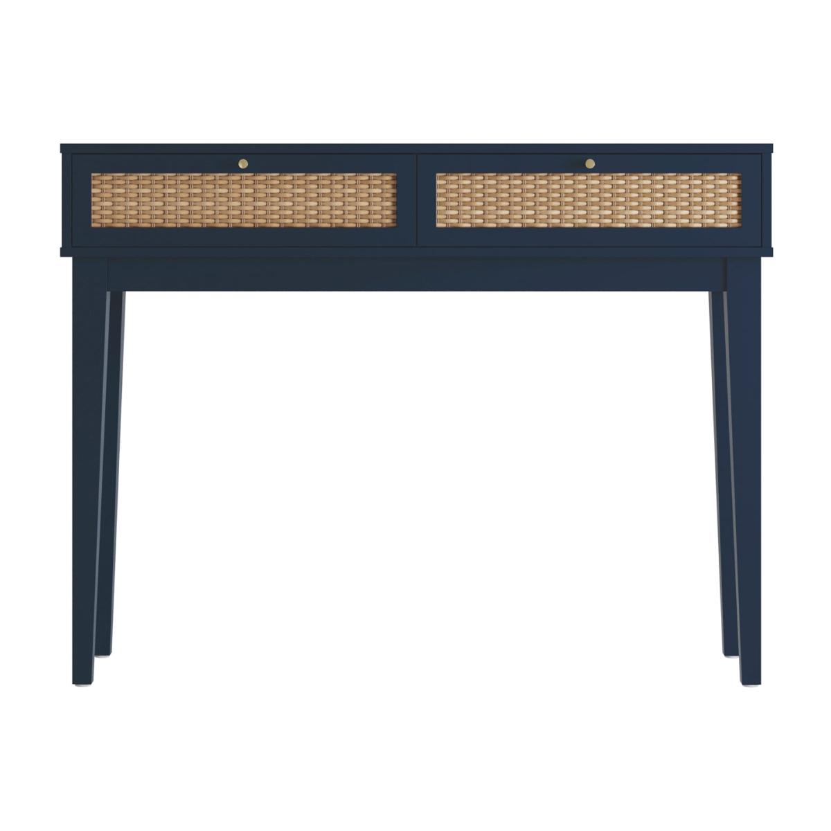 This product is priced at 10% less than a brand new model. Brand new price is £189. Returned product price is £170.10 Saving of £18.90. This is a returned item. It has previously been ordered, dispatched, cancelled and collected from our customers and then fully checked by our expert team to ensure that it is in 100% tip top condition and fully packaged. It was cancelled upon delivery and has therefore never been used. However, because this line is not strictly 'new', we have discounted it to clear! * On-trend rattan * Gold fittings and handles * Modern design * Blue frame * Contemporary The Bordeaux Dressing Table incorporates on-trend rattan with gold fittings and handles. Its modern design and blue frame create a contemporary piece. This elegant dressing table brings a stylish element to your bedroom decor.