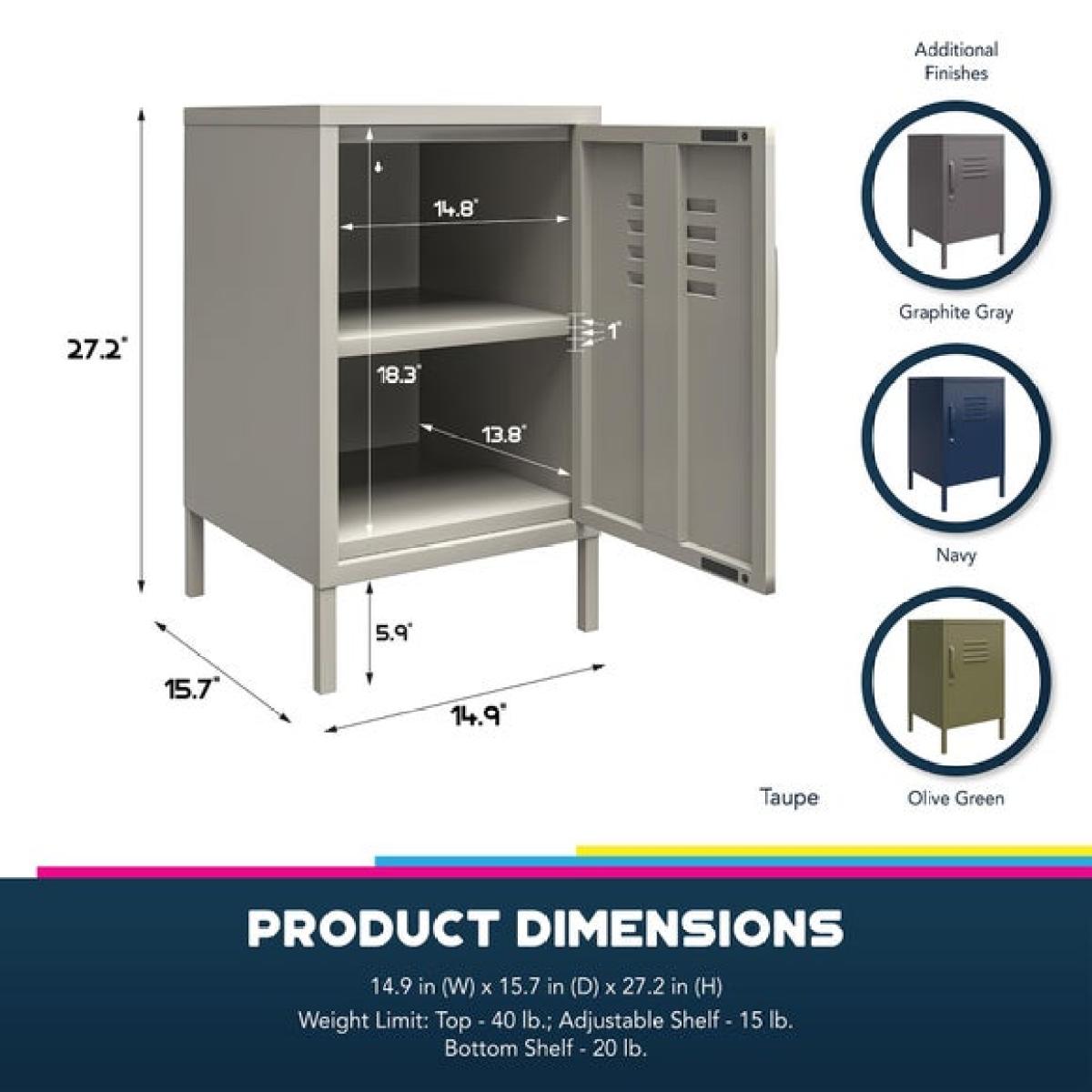 This product is priced at 10% less than a brand new model. Brand new price is £99. Returned product price is £89.10. Saving of £9.90. This is a returned item. It has previously been ordered, dispatched, cancelled and collected from our customers and then fully checked by our expert team to ensure that it is in 100% tip top condition and fully packaged. It was cancelled upon delivery and has therefore never been used. However, because this line is not strictly 'new', we have discounted it to clear! * Powder coated finish in a choice of colours * Self assembly required * Single cupboard with two internal shelves * Perfect for adding a pop of colour to your space * Matching furniture items also available Let's take your living room from basic to fabulous with the high-end Bradford Metal Locker End Table. Your living space is an expression of who you are, and this end table perfectly showcases your unique flair. With its fun and funky locker-style design, it's sure to be a hit and adds that extra touch of personality that you deserve.
