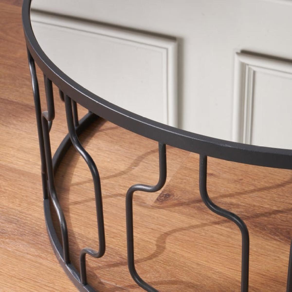 I love this coffee table for its sleek, modern look and versatile appeal. The mirrored glass top adds a touch of sophistication and can help make smaller spaces feel more open, making it ideal for contemporary and minimalist interiors. The black metal base features an open, geometric design that brings visual interest without overwhelming the space. It's practical too-perfect for displaying decorative items or magazines, while also being durable enough for everyday use. To style it, consider pairing with neutral or monochrome soft furnishings, using small plants or candles on top for a cosy feel, or layering with textured textiles to soften the overall look. It works especially well in modern living rooms or spaces with a touch of luxe.