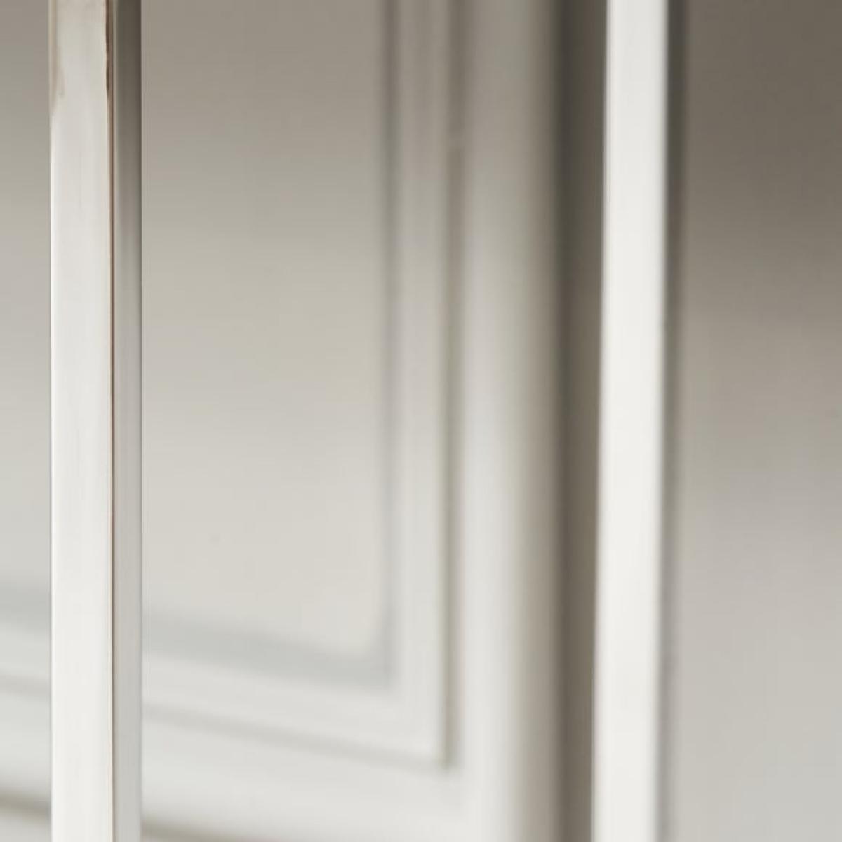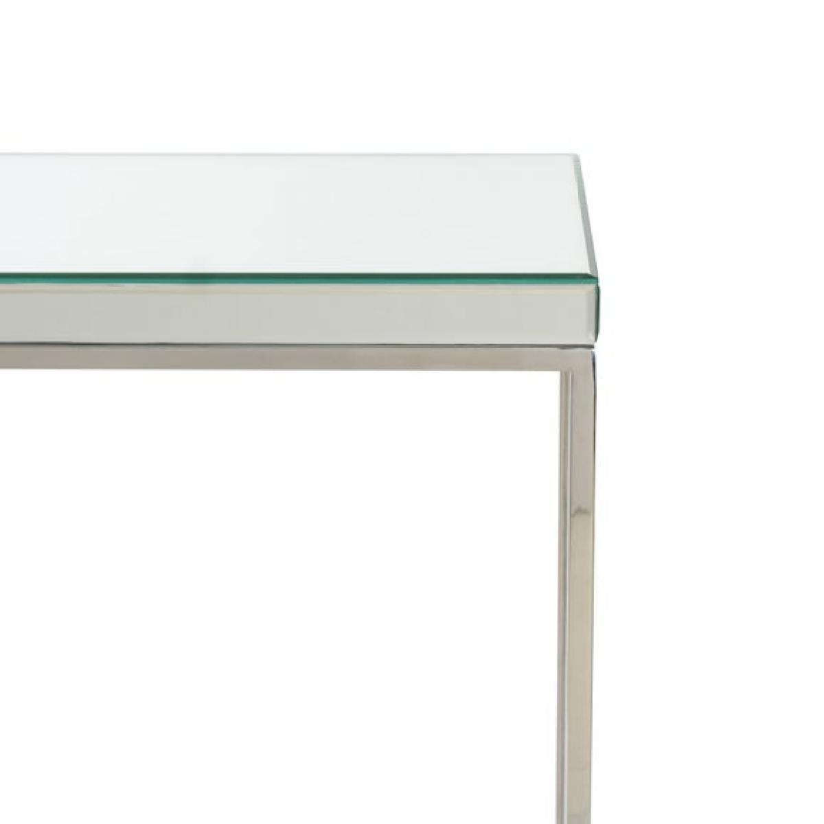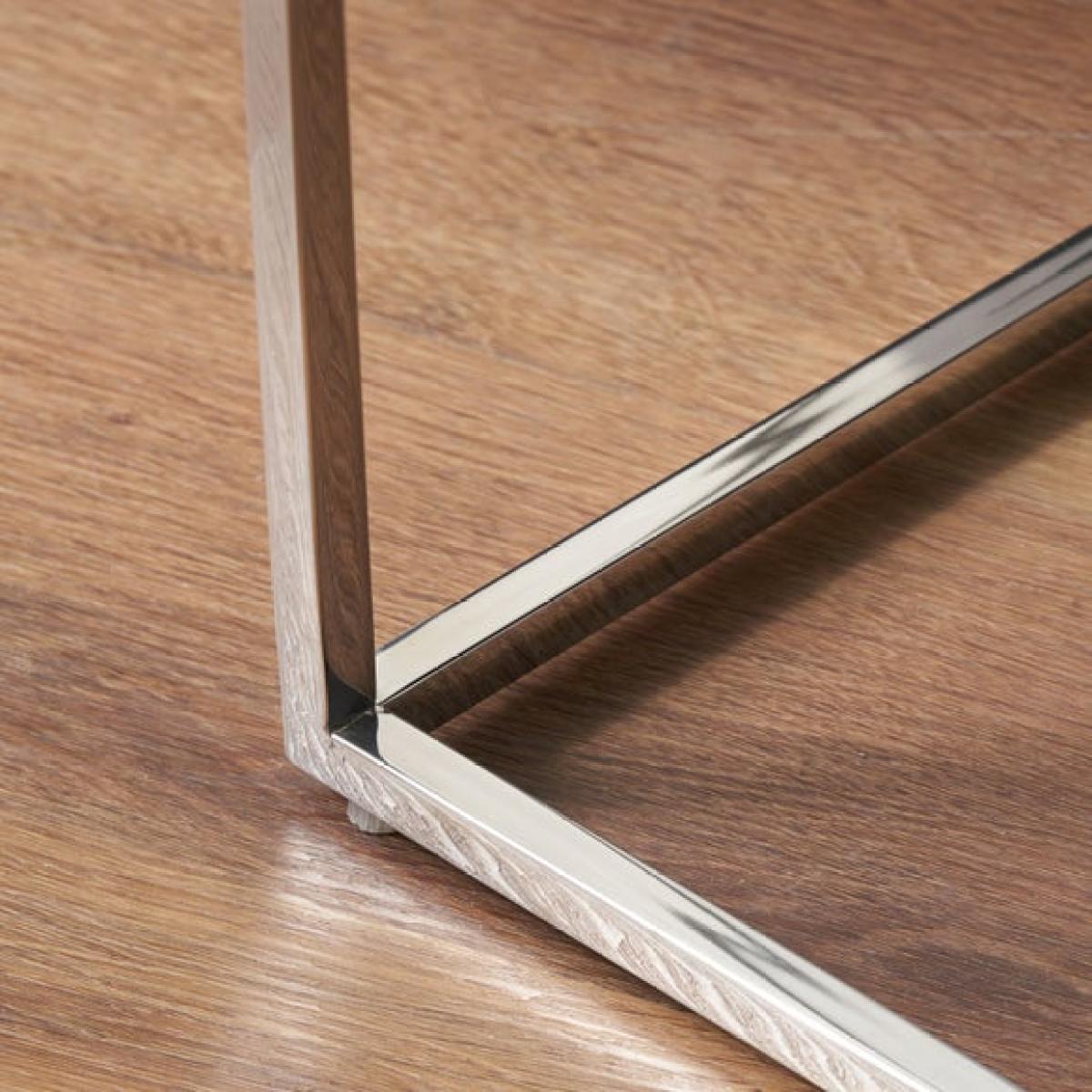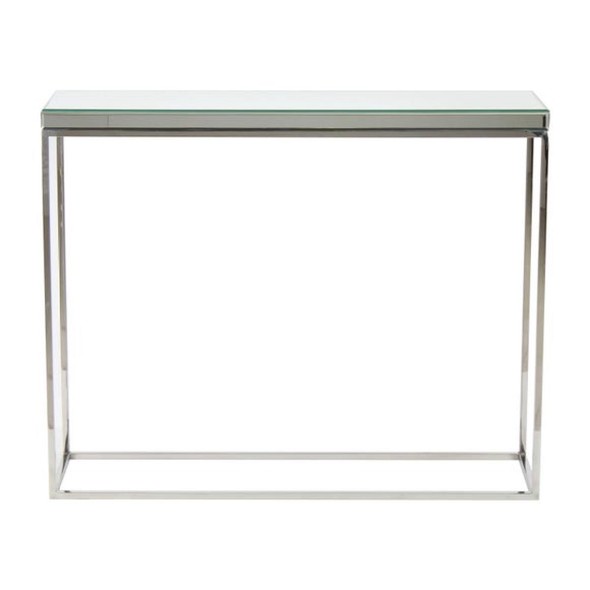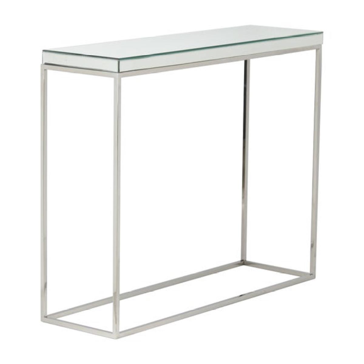 This product is priced at 10% less than a brand new model. Brand new price is £409. Returned product price is £368.10. Saving of £40.90. This is a returned item. It has previously been ordered, dispatched, cancelled and collected from our customers and then fully checked by our expert team to ensure that it is in 100% tip top condition and fully packaged. It was cancelled upon delivery and has therefore never been used. However, because this line is not strictly 'new', we have discounted it to clear! * Mirrored surface * Bevel edged * Stainless steel frame * Hand crafted Crafted in India, this console table features a glass surface with bevel-edged detailing and shiny silver metal legs, adding a touch of elegance to your space. This console table not only offers a practical surface for your decorative items but also enhances the overall aesthetic of your home with its luxurious design and high-quality craftsmanship.