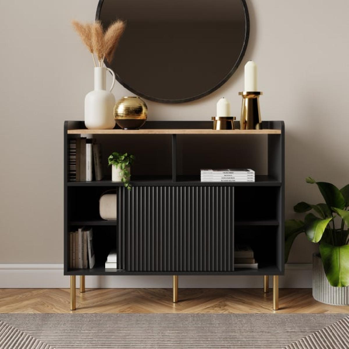 This product is priced at 10% less than a brand new model. Brand new price is £249. Returned product price is £224.10. Saving of £24.90. This is a returned item. It has previously been ordered, dispatched, cancelled and collected from our customers and then fully checked by our expert team to ensure that it is in 100% tip top condition and fully packaged. It was cancelled upon delivery and has therefore never been used. However, because this line is not strictly 'new', we have discounted it to clear! * Ribbed detail design * Softly rounded edges * Subtle matte gold finish legs * Spacious cupboards * Full assembly required This stylish console table effortlessly combines functionality with refined design, making it a versatile addition to any entryway, hallway, or living space. Crafted with a high-quality finish, the tabletop provides the perfect surface to display decorative pieces, photos, or everyday essentials. Its slim profile allows the table to sit neatly against walls without taking up too much space, making it an excellent choice for narrow or compact areas.