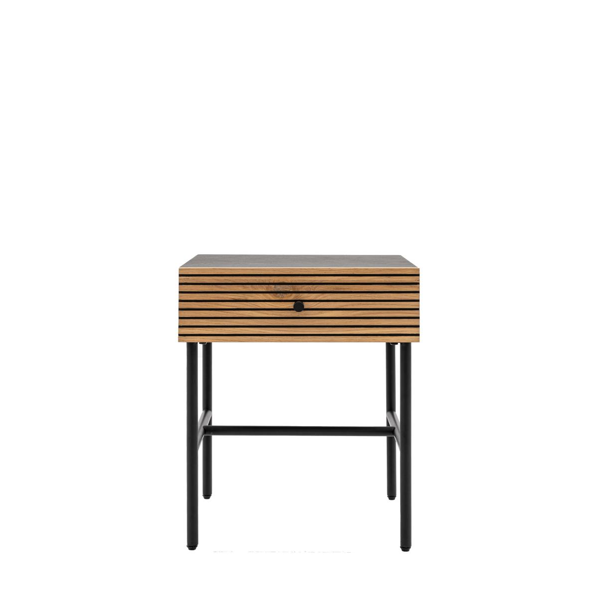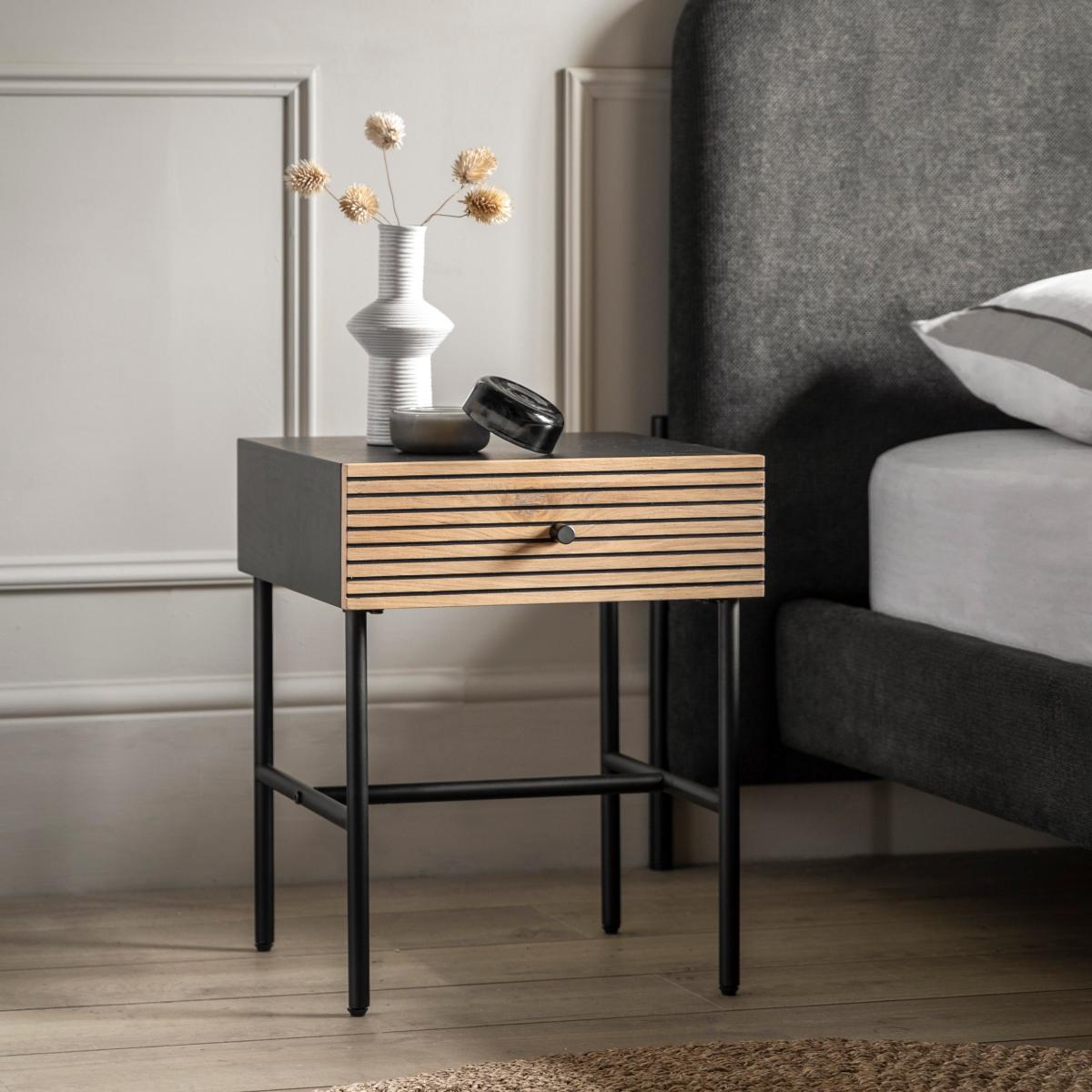 This product is priced at 10% less than a brand new model. Brand new price is £119. Returned product price is £107.10. Saving of £11.90. This is a returned item. It has previously been ordered, dispatched, cancelled and collected from our customers and then fully checked by our expert team to ensure that it is in 100% tip top condition and fully packaged. It was cancelled upon delivery and has therefore never been used. However, because this line is not strictly 'new', we have discounted it to clear! * Contemporary Design* 1 Large Drawer* Easy to Assemble Designed to complement modern interiors, this bedside piece offers both elegance and practicality. Its sleek carcase boasts a black finish with a pressed woodgrain effect, creating a luxurious look and feel. The drawer fascia features real oak woodgrain veneer adorned with a striking black line pattern, adding a touch of sophistication to the design. Complete with a black metal underframe and drawer handle, this bedside exudes modern flair.