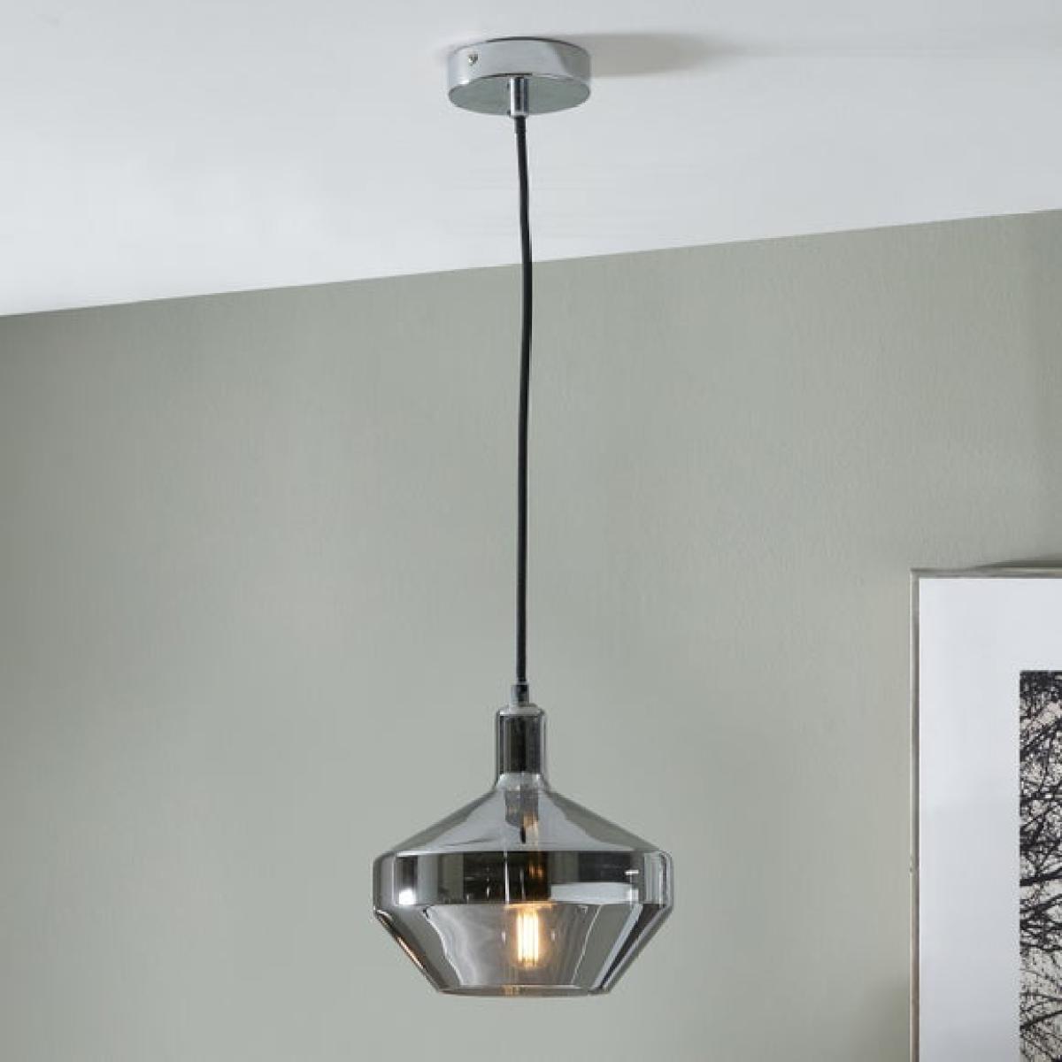 This product is priced at 10% less than a brand new model. Brand new price is £69. Returned product price is £62.10. Saving of £6.90. This is a returned item. It has previously been ordered, dispatched, cancelled and collected from our customers and then fully checked by our expert team to ensure that it is in 100% tip top condition and fully packaged. It was cancelled upon delivery and has therefore never been used. However, because this line is not strictly 'new', we have discounted it to clear! * Statement light fitting * Wide shape * Blown glass pendant * Fabric flex * Adjustable height * Chrome metalwork Turn your old ordinary light fitting into a spectacular view with this statement and smoke glass pendant light fitting. Offering a modern look to your ceiling, this light fitting brings light and decoration with chrome metalwork and a blown glass pendant.