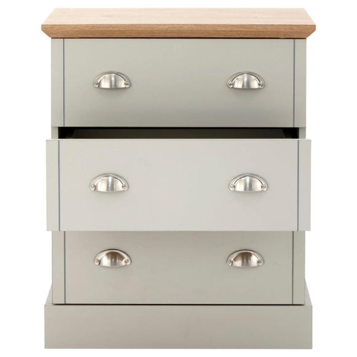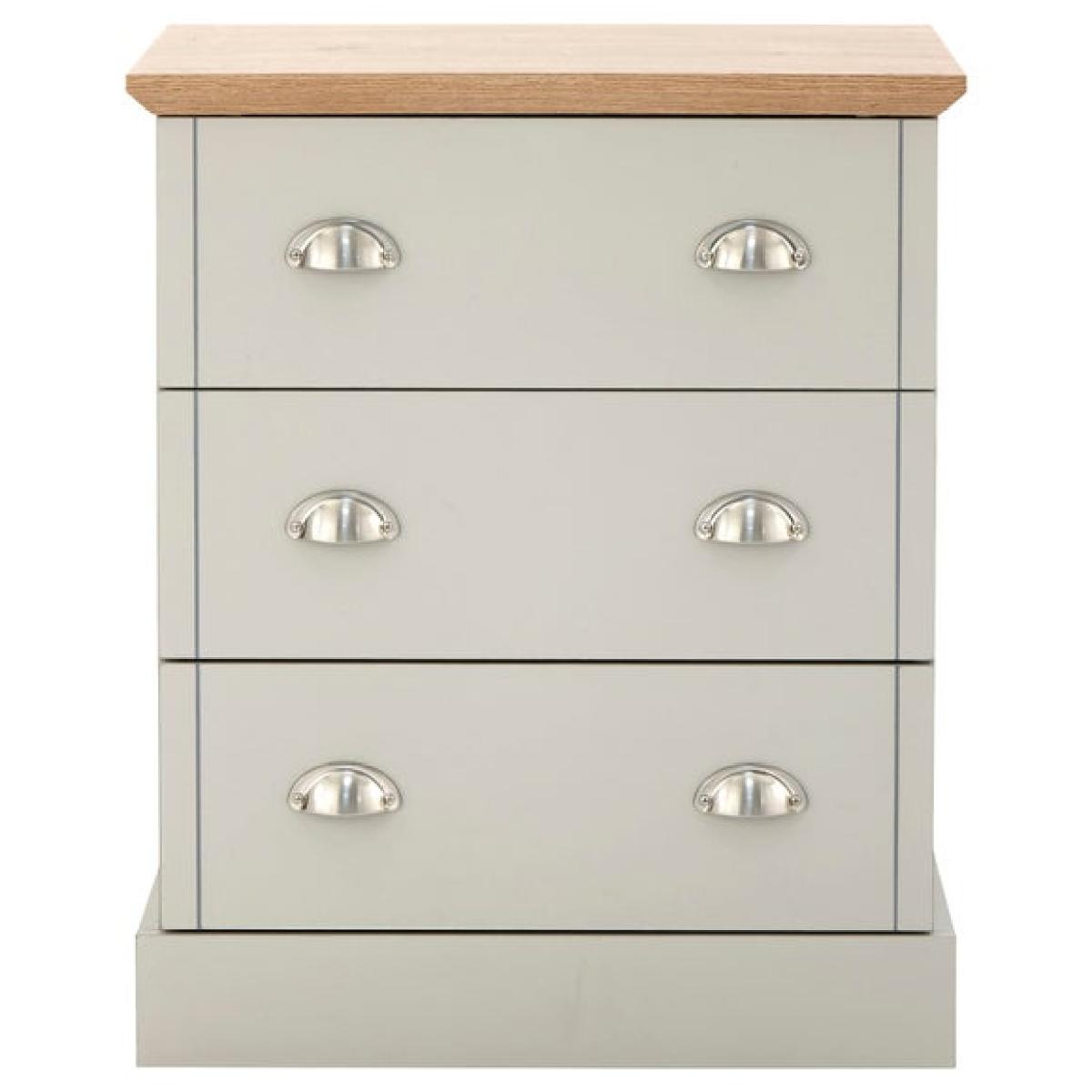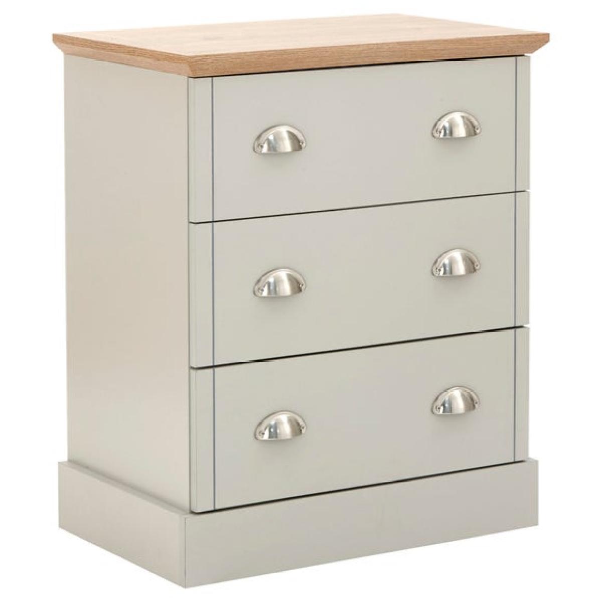 This product is priced at 10% less than a brand new model. Brand new price is £119. Returned product price is £107.10. Saving of £11.90. This is a returned item. It has previously been ordered, dispatched, cancelled and collected from our customers and then fully checked by our expert team to ensure that it is in 100% tip top condition and fully packaged. It was cancelled upon delivery and has therefore never been used. However, because this line is not strictly 'new', we have discounted it to clear!Finished in a grey colourway with a contrasting bevelled edge oak-effect top and brushed steel cup handles, the Kendal 3 drawer chest has a design that would suit any classic or contemporary bedroom. Mounted on a deep base plinth, this self-assembly chest of drawers features three evenly sized drawers with plenty of storage space. Please note, unfortunately we cannot deliver this item to the Channel Islands.