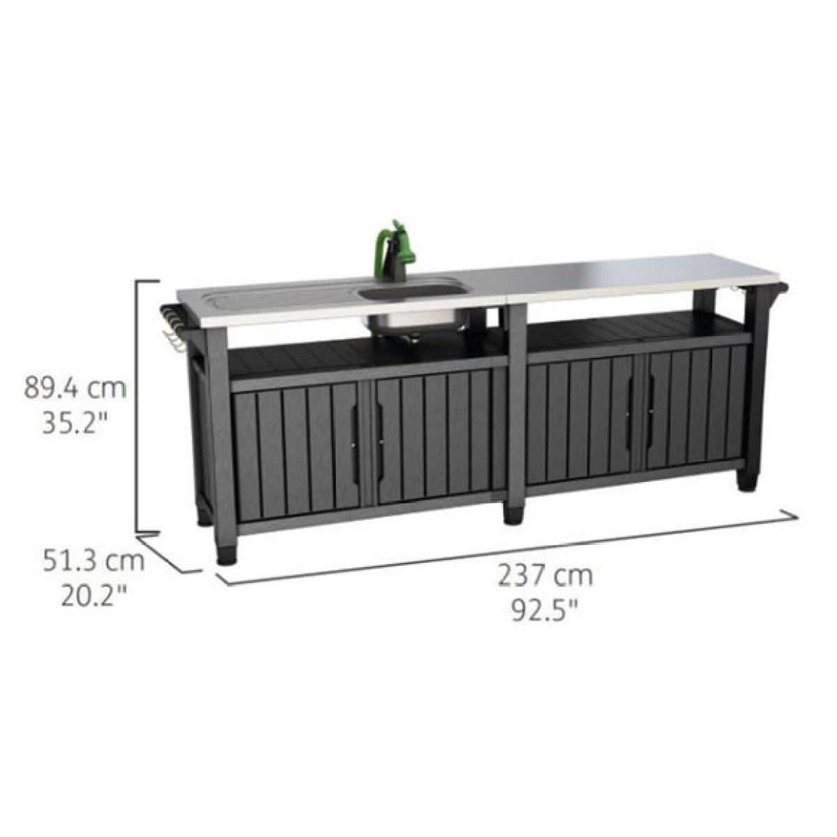 This product is priced at 10% less than a brand new model. Brand new price is £599. Returned product price is £539.10. Saving of £59.90. This is a returned item. It has previously been ordered, dispatched, cancelled and collected from our customers and then fully checked by our expert team to ensure that it is in 100% tip top condition and fully packaged. It was cancelled upon delivery and has therefore never been used. However, because this line is not strictly 'new', we have discounted it to clear! * Water resistant * Durable surface for cooking and serving * Steel top and Resin surface * Strong moulded resin with a textured wood look finish * Sink just needs a hose attaching (tap and hose not included) * Easy to assemble Picture this: the sun is shining, birds are singing, and you're cooking up a delicious meal in your garden with the Keter Large Utility Outdoor Chef Kitchen! With its water-resistant design, you don't have to worry about any unexpected rain showers spoiling your outdoor feast. And with a durable surface for cooking and serving, this kitchen is built to last. You'll be able to cook all your favourite dishes outdoors, from burgers to kebabs and everything in between!The Keter Large Utility Outdoor Chef Kitchen comes with a sink that just needs a hose attaching, so you can easily clean up after your culinary creations. You could always fix a tap to the sink (not included) for an even more finished look. With its strong moulded resin construction and textured wood look, this outdoor kitchen will add a touch of elegance to any garden. But don't worry, just because it's stylish doesn't mean it's difficult to put together! The Keter Large Utility Outdoor Chef Kitchen is easy to assemble, so you'll have it up and running in no time.
