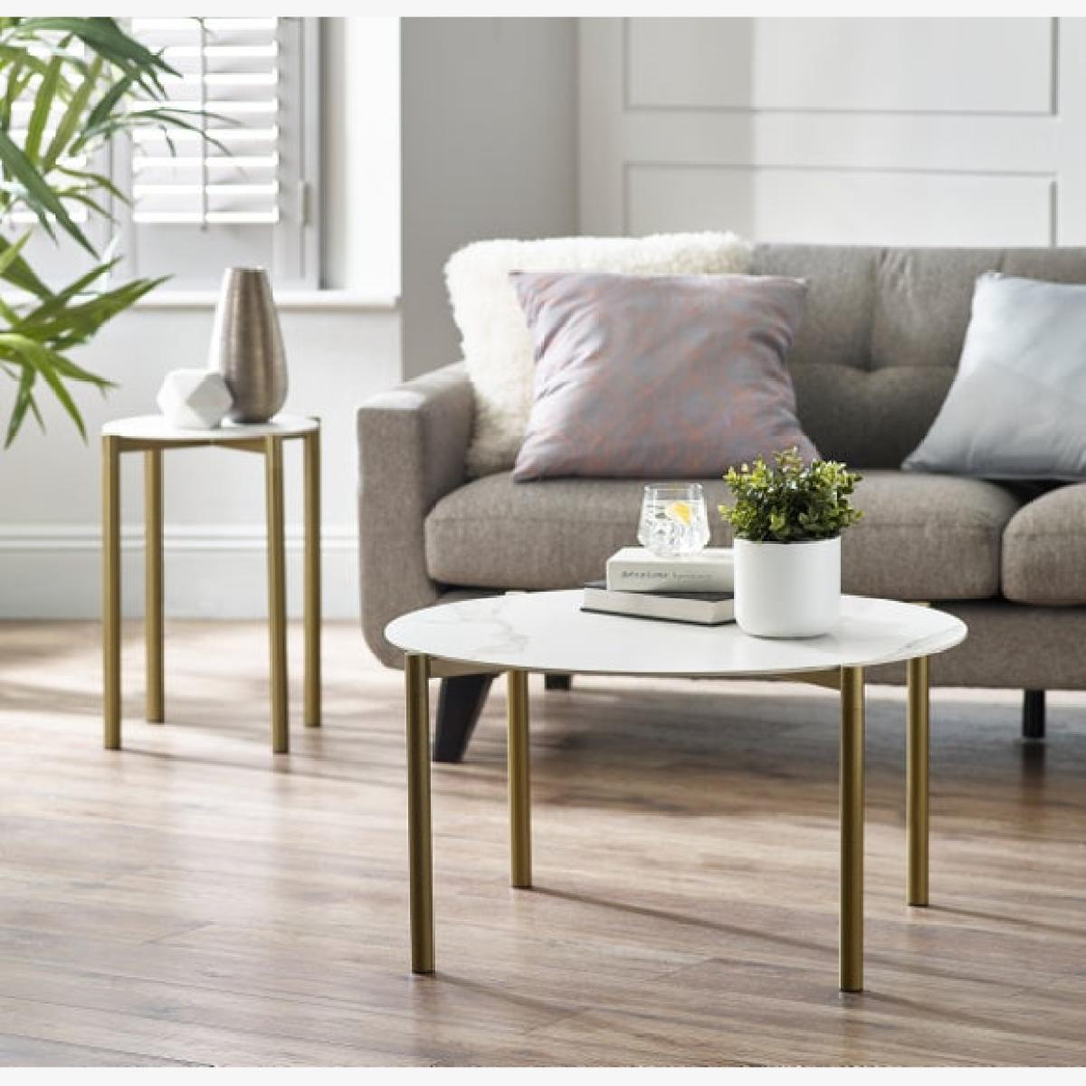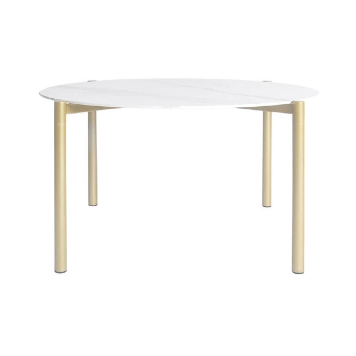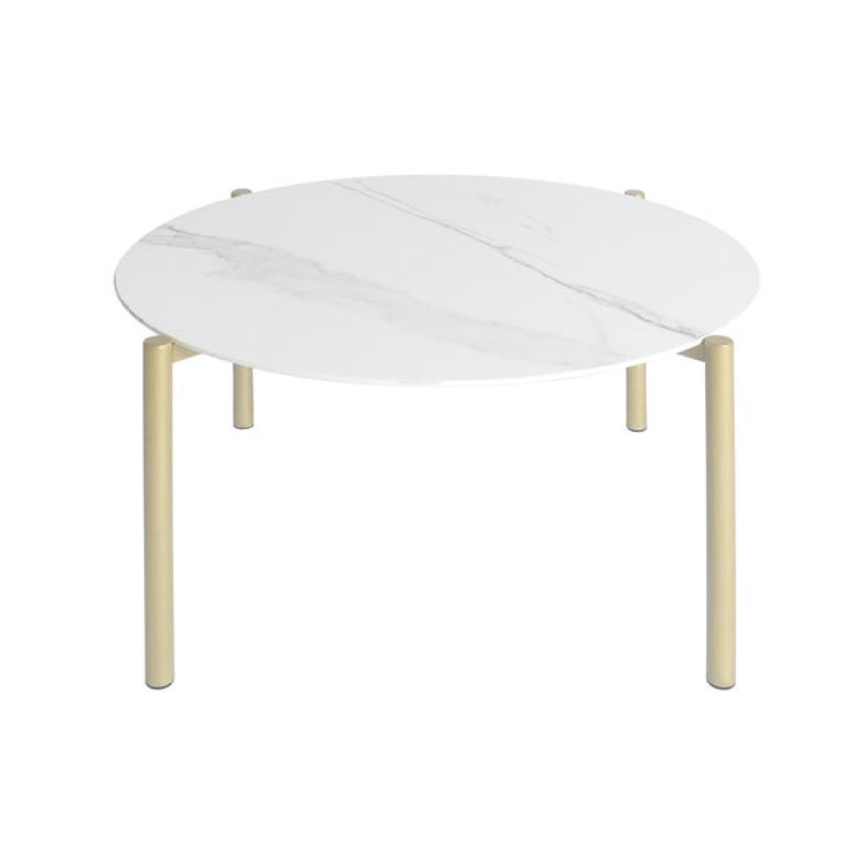 This product is priced at 10% less than a brand new model. Brand new price is £129. Returned product price is £116.10. Saving of £12.90. This is a returned item. It has previously been ordered, dispatched, cancelled and collected from our customers and then fully checked by our expert team to ensure that it is in 100% tip top condition and fully packaged. It was cancelled upon delivery and has therefore never been used. However, because this line is not strictly 'new', we have discounted it to clear! * Large round top * Marble ceramic * Metal Legs Whether you're enjoying a morning coffee or hosting a gathering with friends, this table adds a touch of sophistication to any room. With its large round top crafted from stylish marble ceramic material and elegant metal legs, this coffee table is not only visually striking but also highly practical.