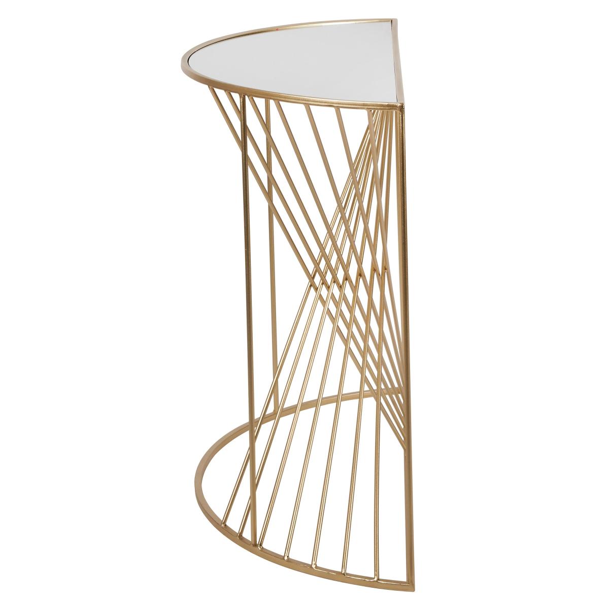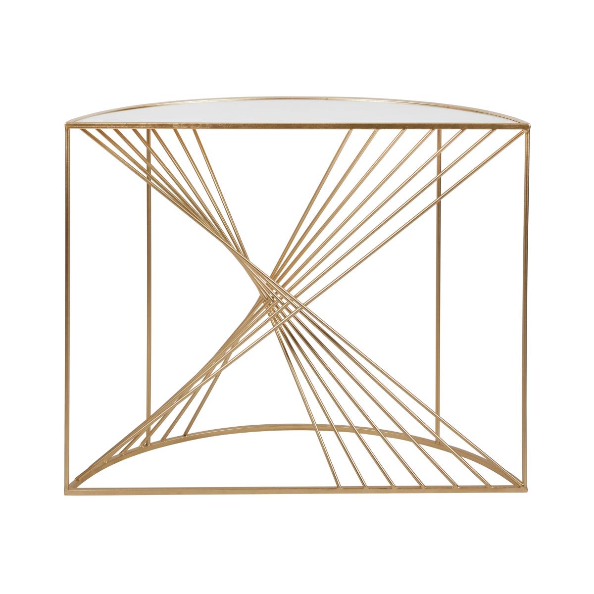This product is priced at 10% less than a brand new model. Brand new price is £249. Returned product price is £224.10. Saving of £24.90. This is a returned item. It has previously been ordered, dispatched, cancelled and collected from our customers and then fully checked by our expert team to ensure that it is in 100% tip top condition and fully packaged. It was cancelled upon delivery and has therefore never been used. However, because this line is not strictly 'new', we have discounted it to clear! * Fabulous elaborate twisted design * Glass-topped * Stylish and Functional The Liberty Glass and Gold Half Moon Console Table boasts a fabulous elaborate twisted design with a glass-topped surface, offering both style and functionality. Its sleek silhouette and gold accents add a touch of elegance to any space, making it a stunning centerpiece for entryways, living rooms, or hallways.