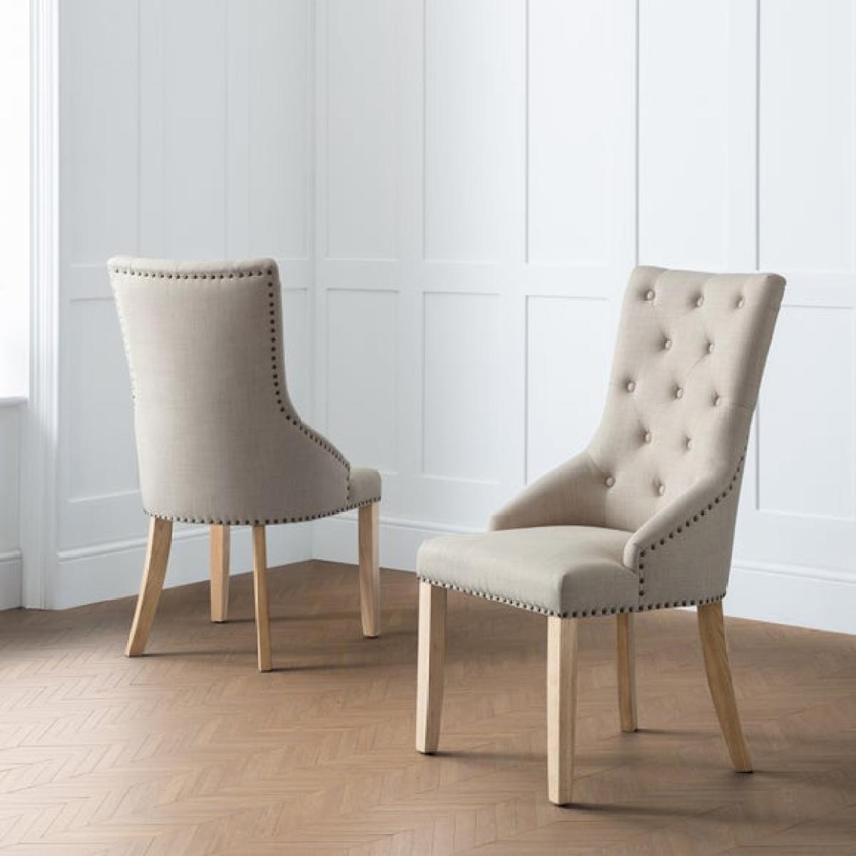 This product is priced at 10% less than a brand new model. Brand new price is £319. Returned product price is £287.10. Saving of £31.90. This is a returned item. It has previously been ordered, dispatched, cancelled and collected from our customers and then fully checked by our expert team to ensure that it is in 100% tip top condition and fully packaged. It was cancelled upon delivery and has therefore never been used. However, because this line is not strictly 'new', we have discounted it to clear! * 2 x Dining Chairs * Deep buttoned and metal stud trim * Natural lacquered legs Featuring elegant deep buttoning and a metal stud trim, these chairs exude timeless charm. The sturdy natural lacquered legs provide stability, while the plush upholstery ensures comfort during long meals. Whether used as standalone pieces or as part of a dining set, the Loire Chairs make a stylish statement in any home decor.