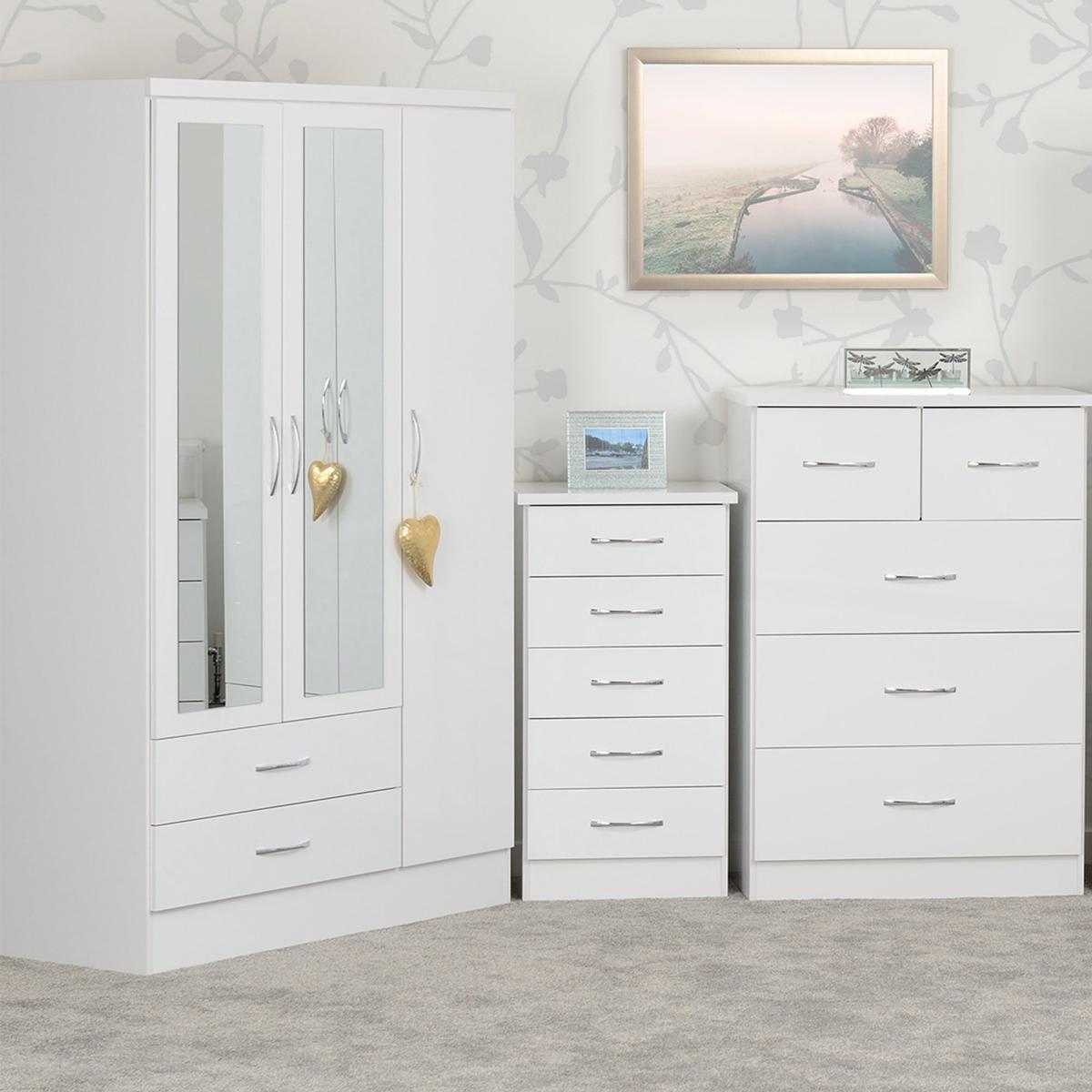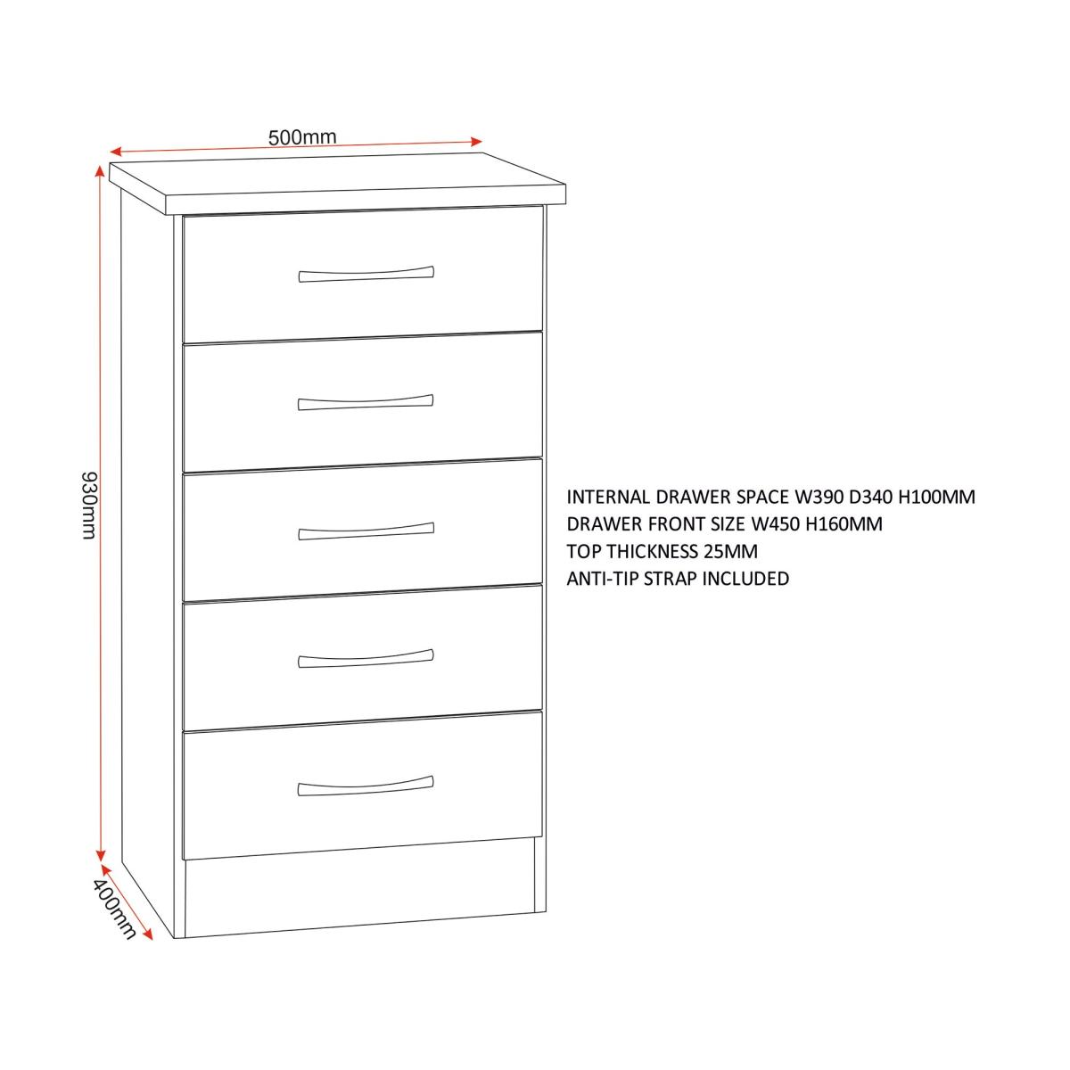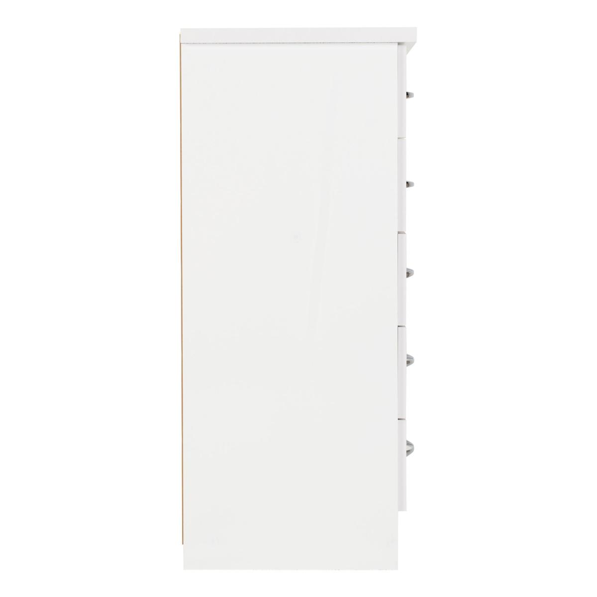 The Nevada 5 Drawer Narrow Chest features a contemporary design owing to the gloss finished front which contrasts perfectly with the light oak veneers. The Nevada has your storage needs covered thanks to the ample drawer space which sits on sturdy metal runners.
