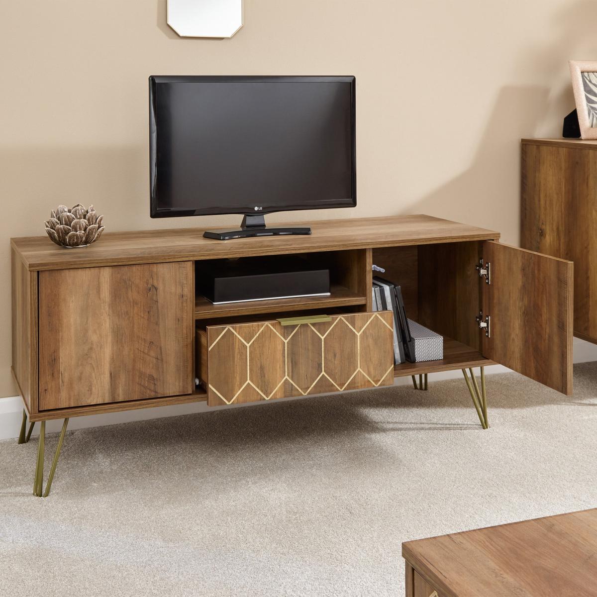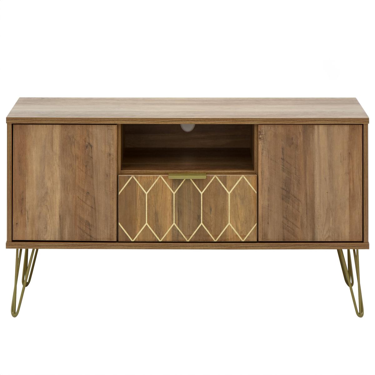 This product is priced at 10% less than a brand new model. Brand new price is £129. Returned product price is £116.10. Saving of £12.90. This is a returned item. It has previously been ordered, dispatched, cancelled and collected from our customers and then fully checked by our expert team to ensure that it is in 100% tip top condition and fully packaged. It was cancelled upon delivery and has therefore never been used. However, because this line is not strictly 'new', we have discounted it to clear!Add a touch of understated glamour to your living space with the retro-inspired Orleans TV Stand. The simple mango-effect construction creates a warm, neutral palette that’s enhanced by delicate engraved metallic detail in a modern geometric design. The central drawer is accessorised with neat gold-coloured drawer pulls that perfectly complements the elegant hairpin legs. Complete with two push-to-open cupboards that create a clean look and an open shelf with cable access for any media devices or consoles, this stunning TV unit would make a stylish and practical solution to your home. Do not use solvent based cleaners or detergents as they can bleach or damage the product.