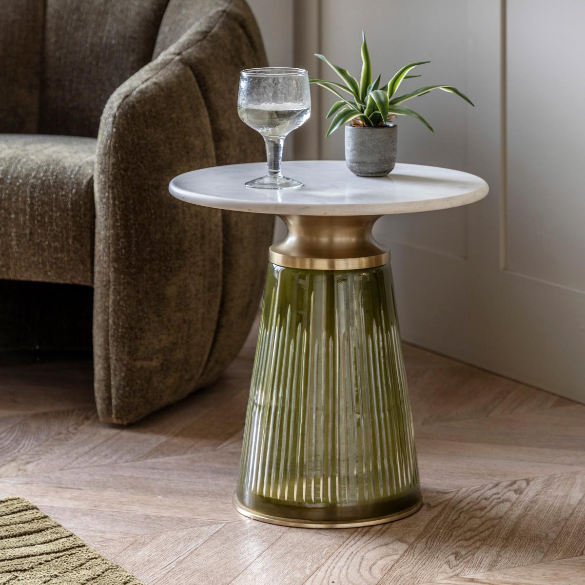 * Unique design with a stunning glass base * Metal collars and white marble tabletop * Available in a choice of colours Add some luxe to your room with The Sanday Side Table, featuring an incredibly stunning glass base with liner striations and a white marble tabletop. Available in a choice of colours, it adds elegance and sophistication to any interior.