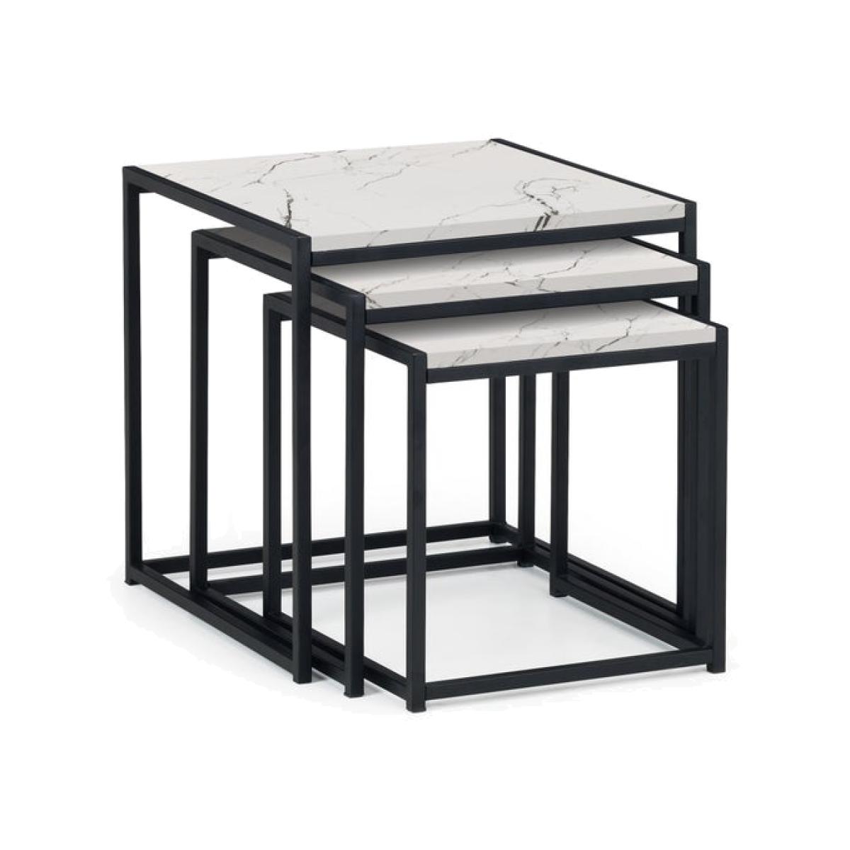 This product is priced at 10% less than a brand new model. Brand new price is £109. Returned product price is £98.10 Saving of £10.90. This is a returned item. It has previously been ordered, dispatched, cancelled and collected from our customers and then fully checked by our expert team to ensure that it is in 100% tip top condition and fully packaged. It was cancelled upon delivery and has therefore never been used. However, because this line is not strictly 'new', we have discounted it to clear!Designed with a White Marble effect, this nest of tables is perfect for displaying all your ornaments, magazine or flowers. With a black coated metal frame this nest of tables is the perfect combination of modern and classic.