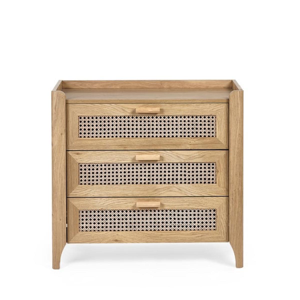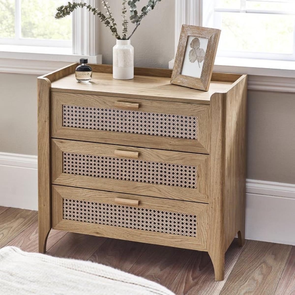 This product is priced at 10% less than a brand new model. Brand new price is £119. Returned product price is £107.10. Saving of £11.90. This is a returned item. It has previously been ordered, dispatched, cancelled and collected from our customers and then fully checked by our expert team to ensure that it is in 100% tip top condition and fully packaged. It was cancelled upon delivery and has therefore never been used. However, because this line is not strictly 'new', we have discounted it to clear! * Rattan design* Curved edges* Oak Frame Combining a sleek design with a bohemian feel, this chest offers practical storage with three drawers. The curved edges and rattan-effect sticker front add a distinctive touch, while the natural oak effect finish enhances the overall look of your bedroom. This piece provides ample storage space for your essentials and creates a warm, airy atmosphere in your home, blending style with functionality.