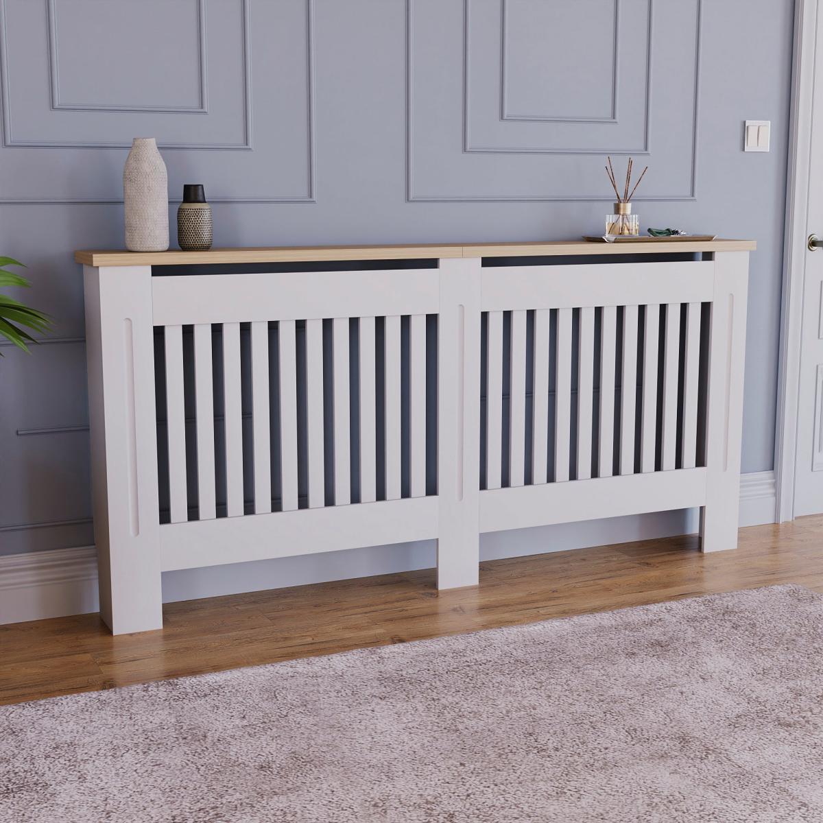 I love this radiator cover because it combines functionality with a clean, modern look that can complement a variety of interiors. Its large size makes it a versatile piece for wider spaces, and the white finish ensures it remains neutral, allowing it to blend seamlessly with both contemporary and traditional décors. It's particularly effective in living rooms or hallways where you want to conceal a radiator while providing extra surface area for decorative objects like vases, picture frames, or lamps. Practical styling tips include layering items of different heights to add visual interest or keeping the top surface clear for daily essentials. It also works well in schemes that favour a minimalist or coastal aesthetic, thanks to its simple design and crisp colour.