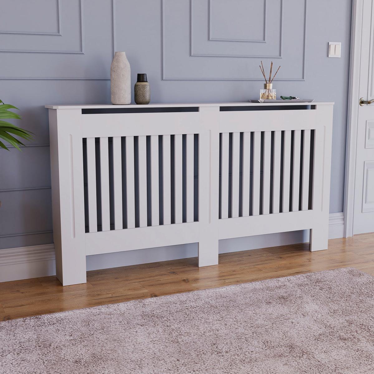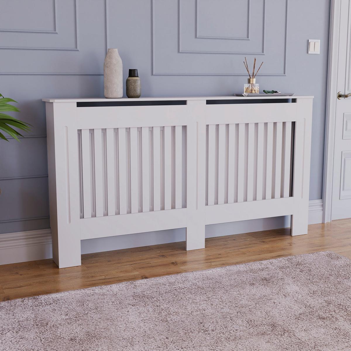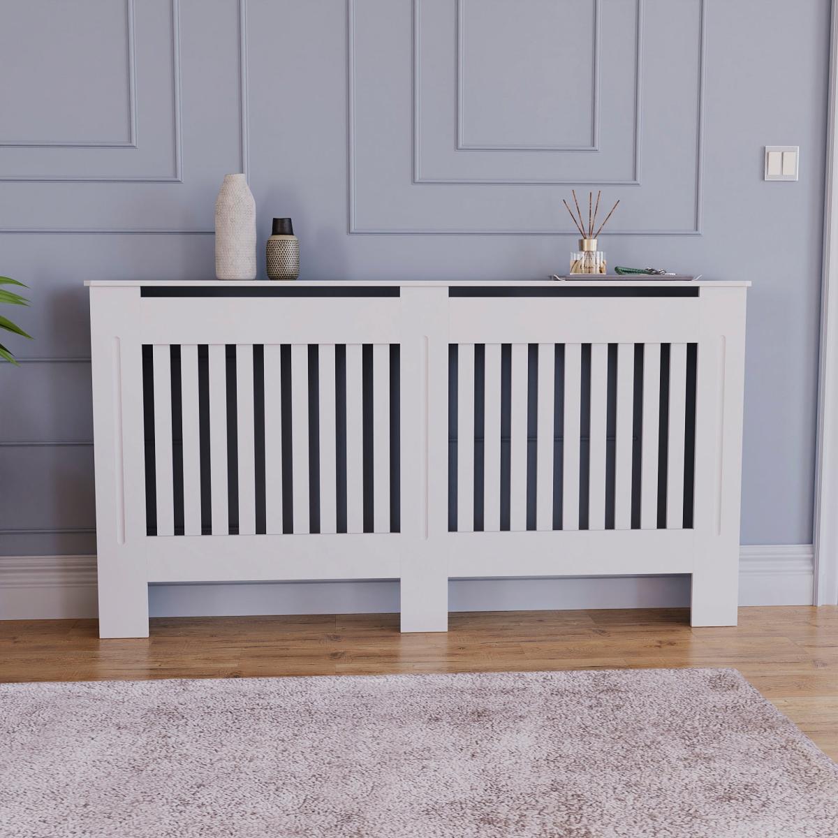 This product is priced at 10% less than a brand new model. Brand new price is £50. Returned product price is £45. Saving of £5. This is a returned item. It has previously been ordered, dispatched, cancelled and collected from our customers and then fully checked by our expert team to ensure that it is in 100% tip top condition and fully packaged. It was cancelled upon delivery and has therefore never been used. However, because this line is not strictly 'new', we have discounted it to clear! * 5kg Max. Load Tested Weight * Durable and Sturdy Build * Versatile Storage Solution * Elegant design * Easy Assembly The Chelsea Radiator Cover offers both style and function, featuring a sleek vertical slat design that adds sophistication to any room while concealing radiators. Engineered for optimal heat flow, it ensures warmth is distributed evenly without sacrificing efficiency. Perfect for families, this cover acts as a safety barrier, protecting children and pets from hot surfaces. With a sturdy build and easy assembly, it promises durability and minimal maintenance. Plus, its flat top serves as a convenient display shelf, enhancing both the look and practicality of your living space.