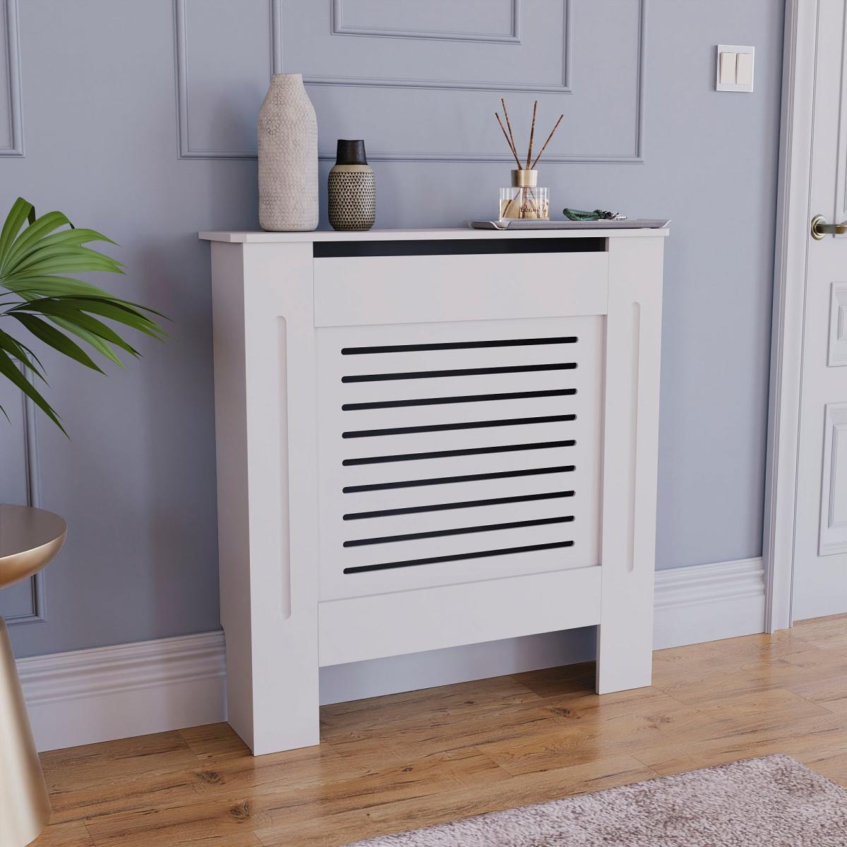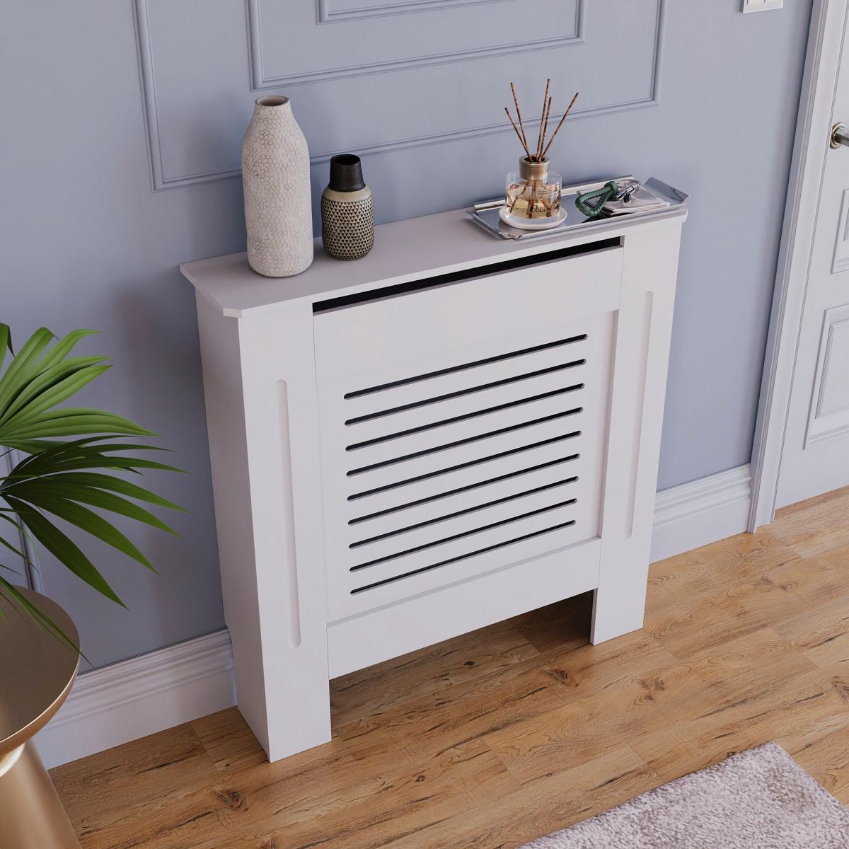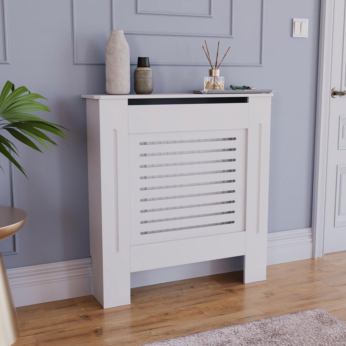 I love this slimline white radiator cover for its clean, versatile look that easily adapts to various interiors, from cosy cottages to modern apartments. It’s particularly effective in spaces where you want to conceal unsightly radiators while creating a surface for decorative accessories. The small size makes it perfect for narrow hallways or side entrances, giving you extra surface space without overwhelming the area. Practical styling tips include adding a few favourite ornaments or a small lamp on top, as well as using it to support plants or picture frames to personalise the space. Its simple design lends itself well to both contemporary minimalism and more traditional schemes, making it a smart and functional addition to any room.