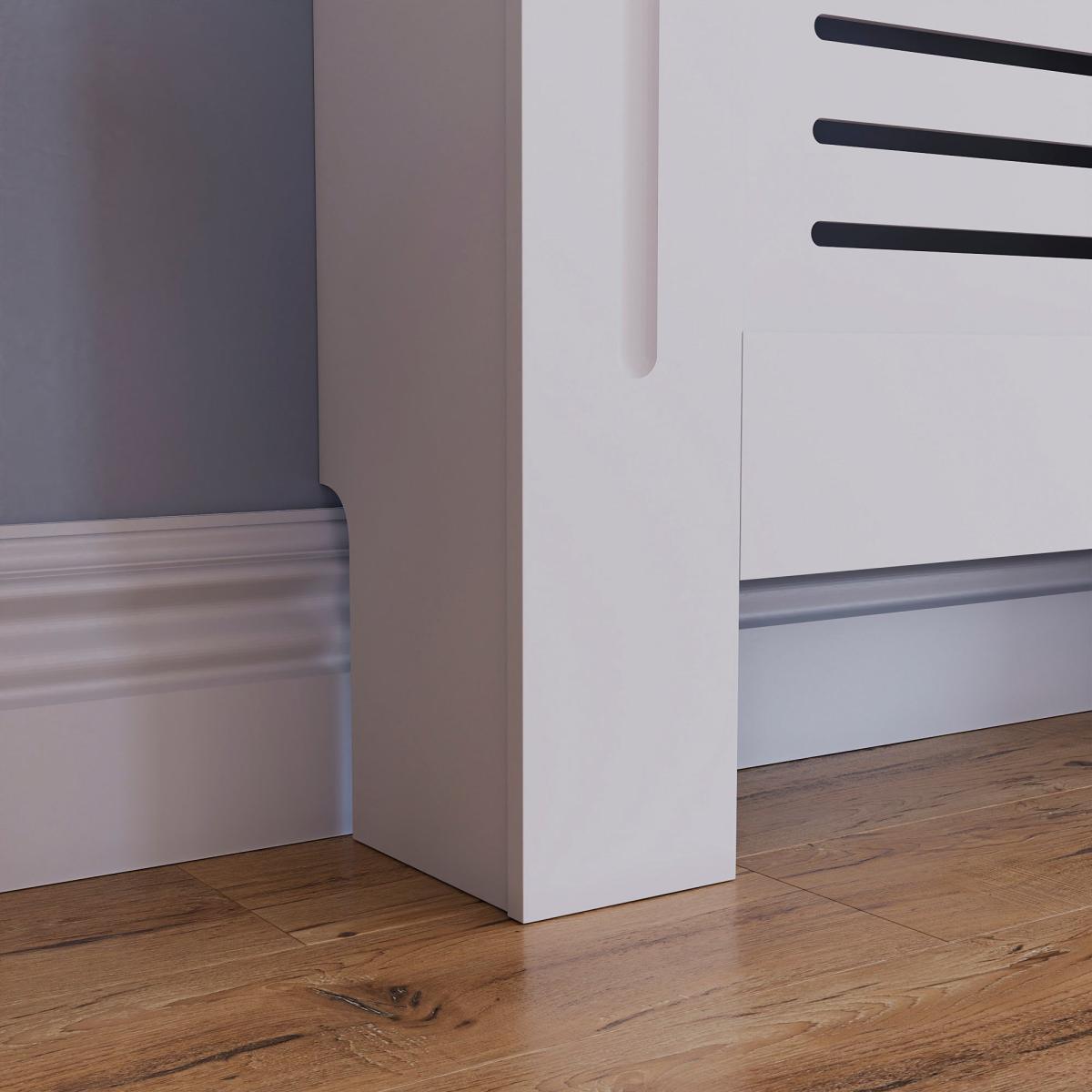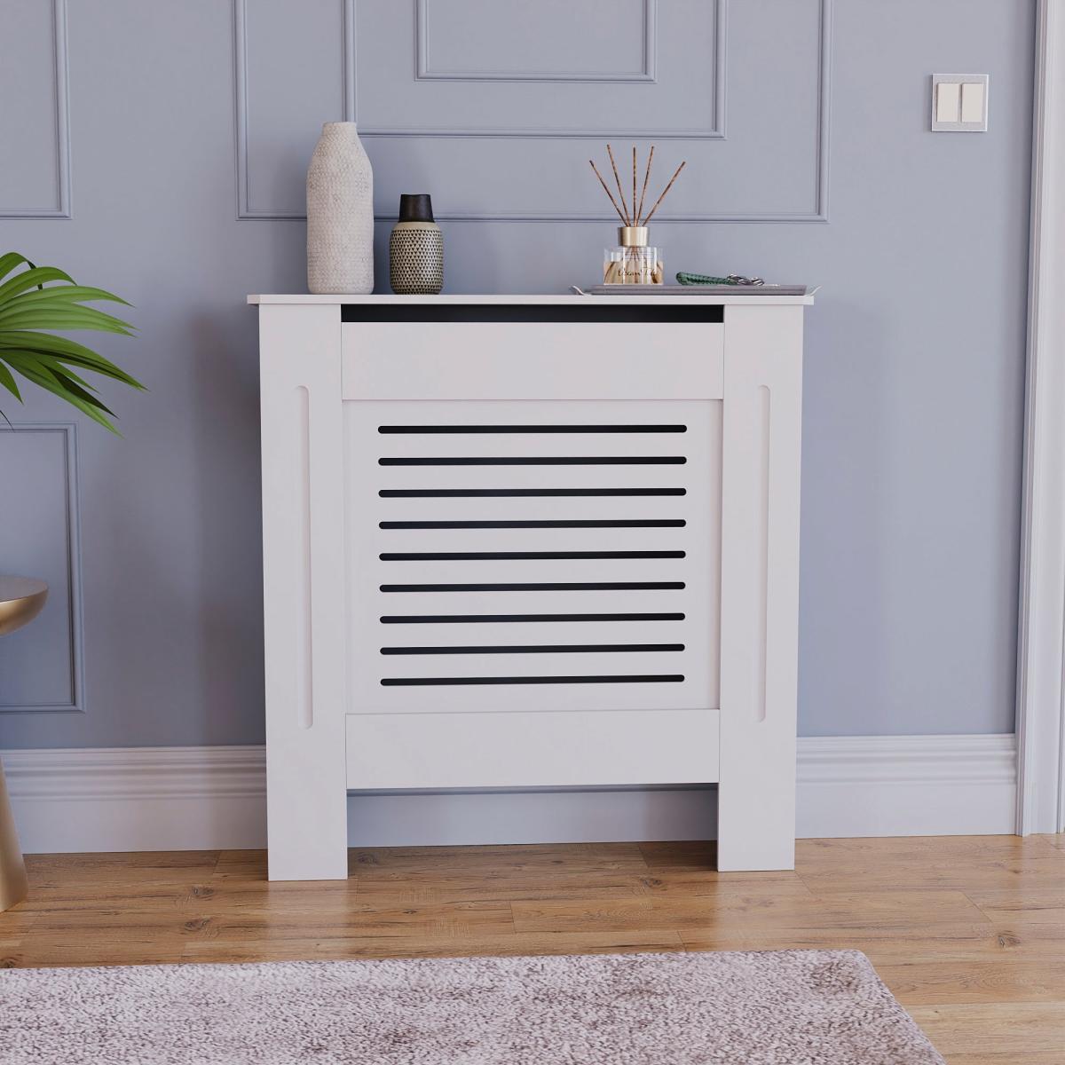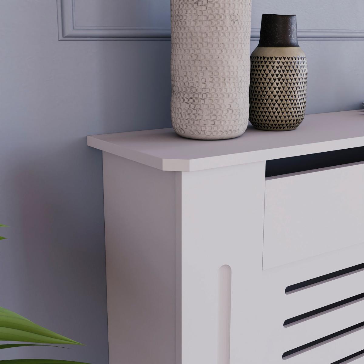 I love this slimline white radiator cover for its clean, versatile look that easily adapts to various interiors, from cosy cottages to modern apartments. It’s particularly effective in spaces where you want to conceal unsightly radiators while creating a surface for decorative accessories. The small size makes it perfect for narrow hallways or side entrances, giving you extra surface space without overwhelming the area. Practical styling tips include adding a few favourite ornaments or a small lamp on top, as well as using it to support plants or picture frames to personalise the space. Its simple design lends itself well to both contemporary minimalism and more traditional schemes, making it a smart and functional addition to any room.