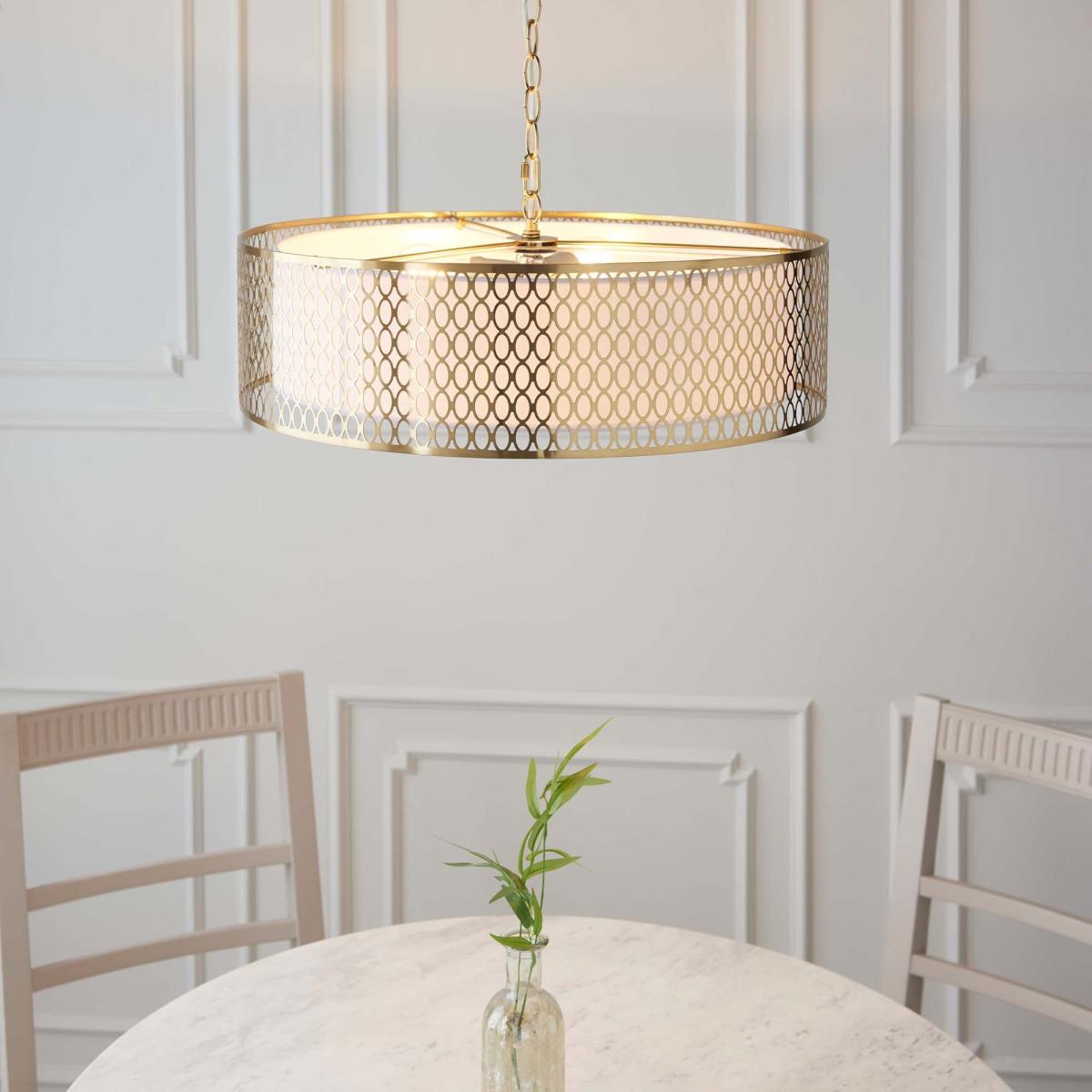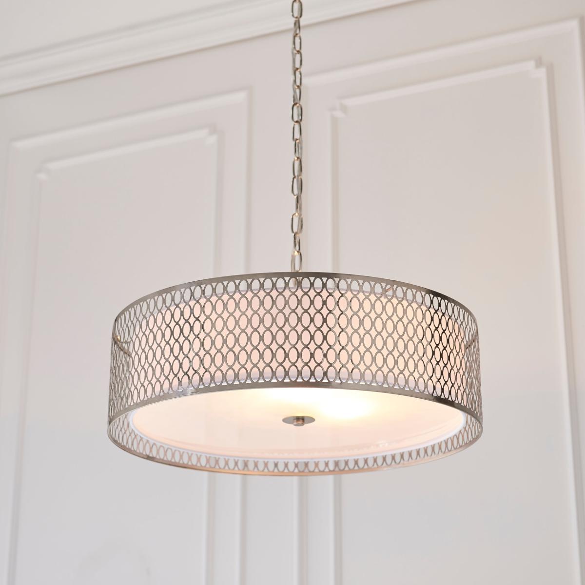 * Satin plated finish * Inner metal framework * Lower frosted glass diffuser * Compatible with a dimmer switch * Bulbs not included A beacon of sophistication for discerning modern homes. The Toina pendant light adds a touch of sleekness to the intricately detailed metal framework, elegantly framing the inner white fabric shade. The lower frosted glass diffuser not only enhances the overall aesthetic but also ensures a soft, ambient glow that radiates timeless charm. Compatible with a dimmer switch for customisable illumination, this pendant seamlessly marries classic and contemporary elements.