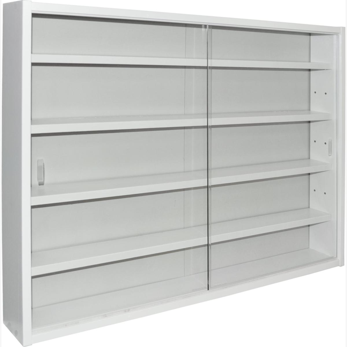 Stylish 5 tier wall mountable crisp white finished display unit with pale grey painted backboard and four adjustable shelves and double sliding tempered glass doors. Ideal for showing off your collectables from ornaments to model cars and trains. Shelves are 6.5cm deep x 77cm wide and when evenly spaced are 10cm apart.