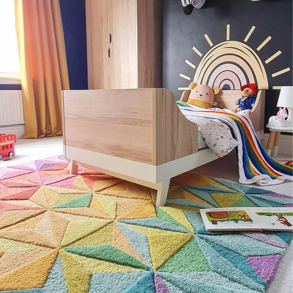 Make a statement with the Reverie rug. Pairing a striking kaleidoscope design with statement shades of every colour. Hand-crafted by skilled rug artisans, the Reverie rug is made of 100% wool to maximise natural warmth and sound insulating qualities. Hand-finished using cut and loop techniques to add dimension to the tessellating geometric design. Use the multi-coloured Reverie rug to define a statement area to sink your feet into. Don't forget to buy our handy anti-slip mat,[here,](https://www. dunelm. default Sku Id=30132247) available in a range of sizes. Rug pictured is 160cm x 230cm. This is a dense hand-made rug. When opening, re-roll your rug pile out and leave in a warm room for 24 hours before putting in place, this will help to reduce wrinkles and curling from packing. Do not pull any loose threads, please cut them carefully with scissors to remove. Avoid prolonged exposure to direct sunlight as this may cause fading of the colour. Turn your rug regularly to ensure even wear and to reduce pressure marks from furniture. Wool fibres may shed when new and during use, this is a characteristic of this product and is not a defect and should reduce with normal use and regular vacuuming. Before using any cleaning products on your rug, test on an inconspicuous area first to ensure it does not affect the colour. Clean spills immediately by blotting with a clean dry white cloth - do not rub as this may stain the fibres. Vacuum your rug regularly to remove everyday dirt, we recommend the use of a suction type vacuum cleaner as a rotating vacuum brush can cause damage to the pile surface. We recommend the use of an anti-slip mat beneath your rug to prevent it from slipping and sliding out of place. Latex is used on the back of this rug. Please do not leave babies or young children unsupervised on this rug.