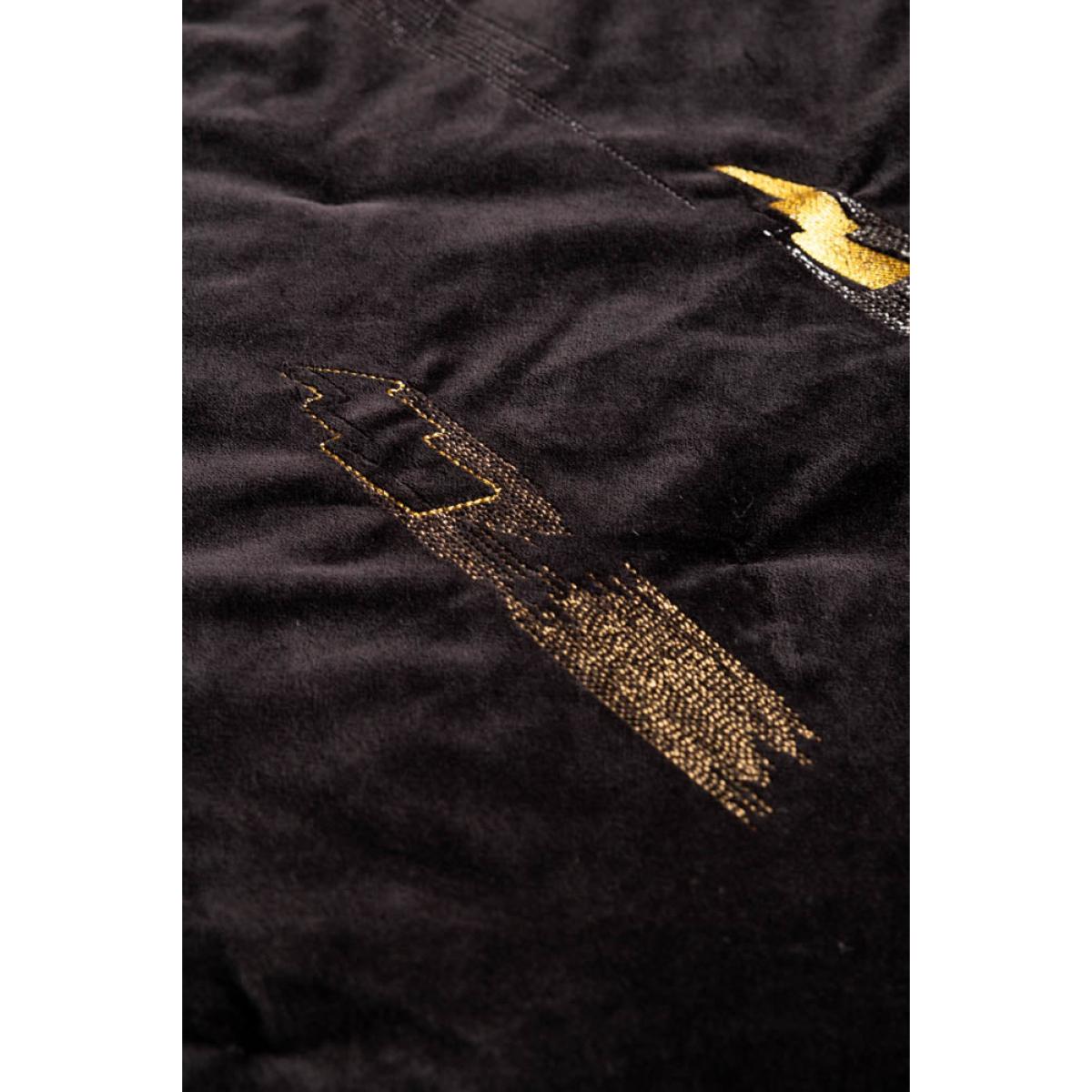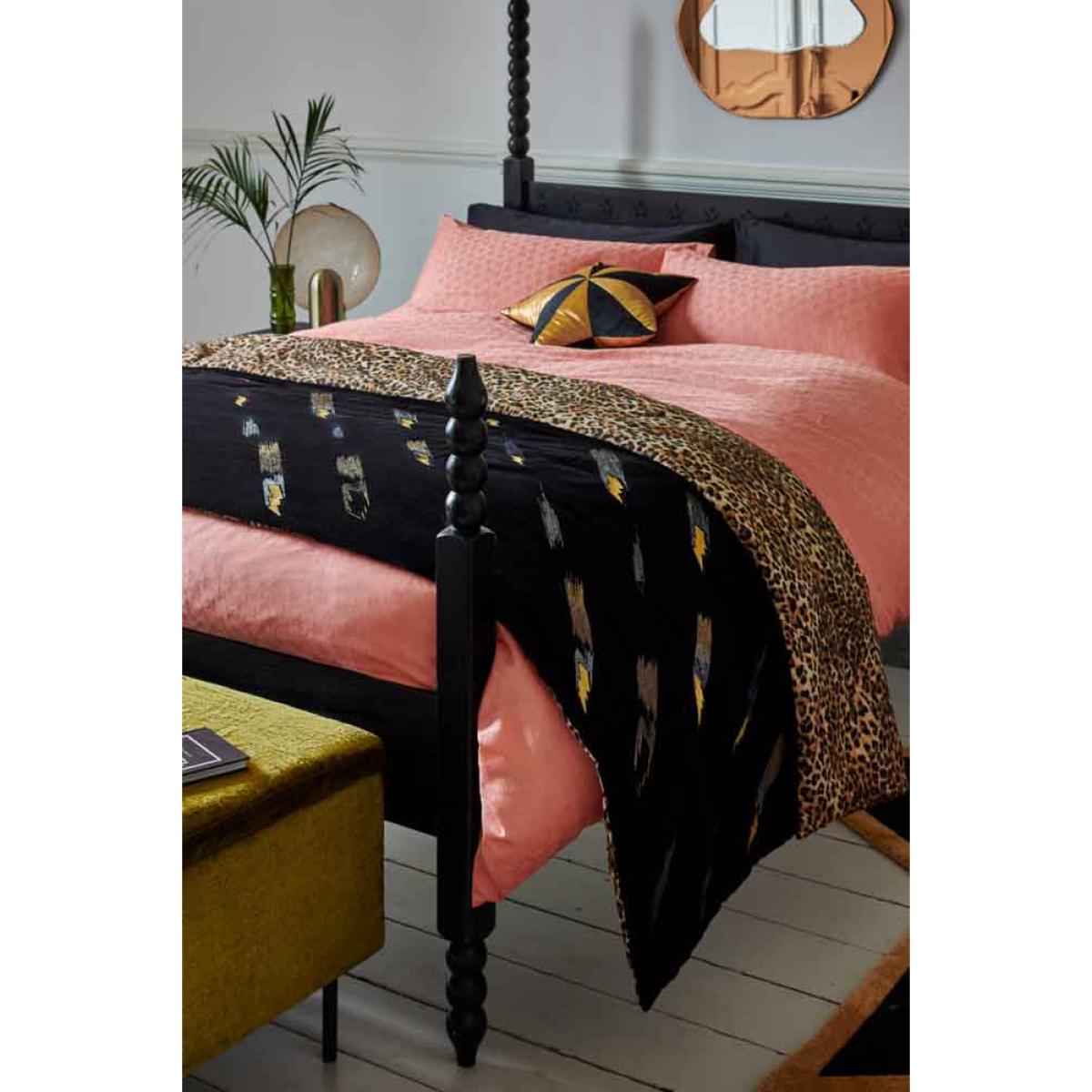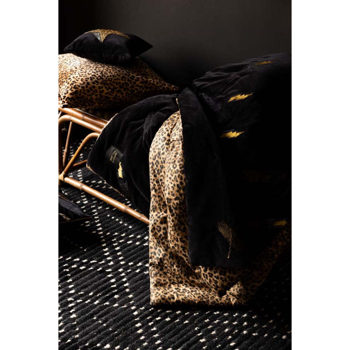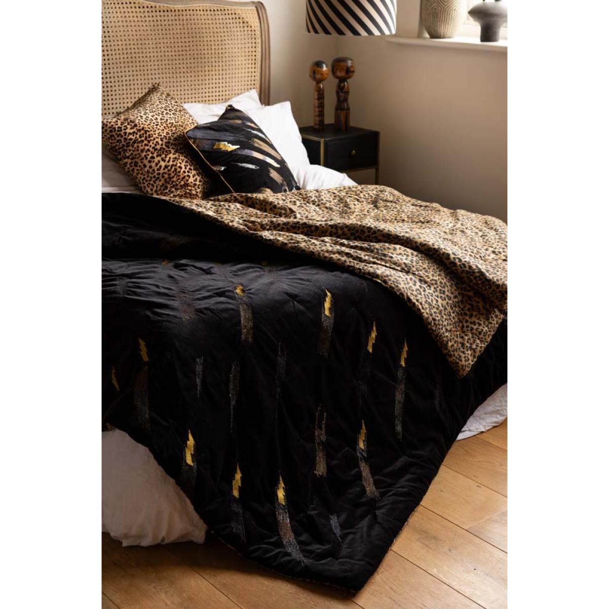 Embolden your home decor with our luxurious velvet Lovestruck throw, adorned on one side with striking gold lightning bolts that shimmer and shine and a daring leopard print pattern on the other. This elegant piece is super-versatile, and combines style and comfort to add a sprinkle of sophistication to your home. Whether it graces your sofa or your bed, embrace the luxury and elevate your home with this fearless throw and celebrate your own eclectic style and individuality. The soft, cool cotton is breathable in summer and cosy in winter, making this truly a throw for all seasons, and a stunning piece that you’ll treasure for years. - Reversible Black Lovestruck & Leopard Print Throw- Measures: 220cm x 240cm - Rockett St George Exclusive Design - Material: 100% Cotton and Velvet - Velvet is dry clean only - As a raised pile fabric, velvet can show subtle crushing lines and bruising from the manufacturing process - this is not considered a flaw. - Please note that this throw features hand-dyed velvet and artisan block printed fabric, with variation in colour and print to be expected.