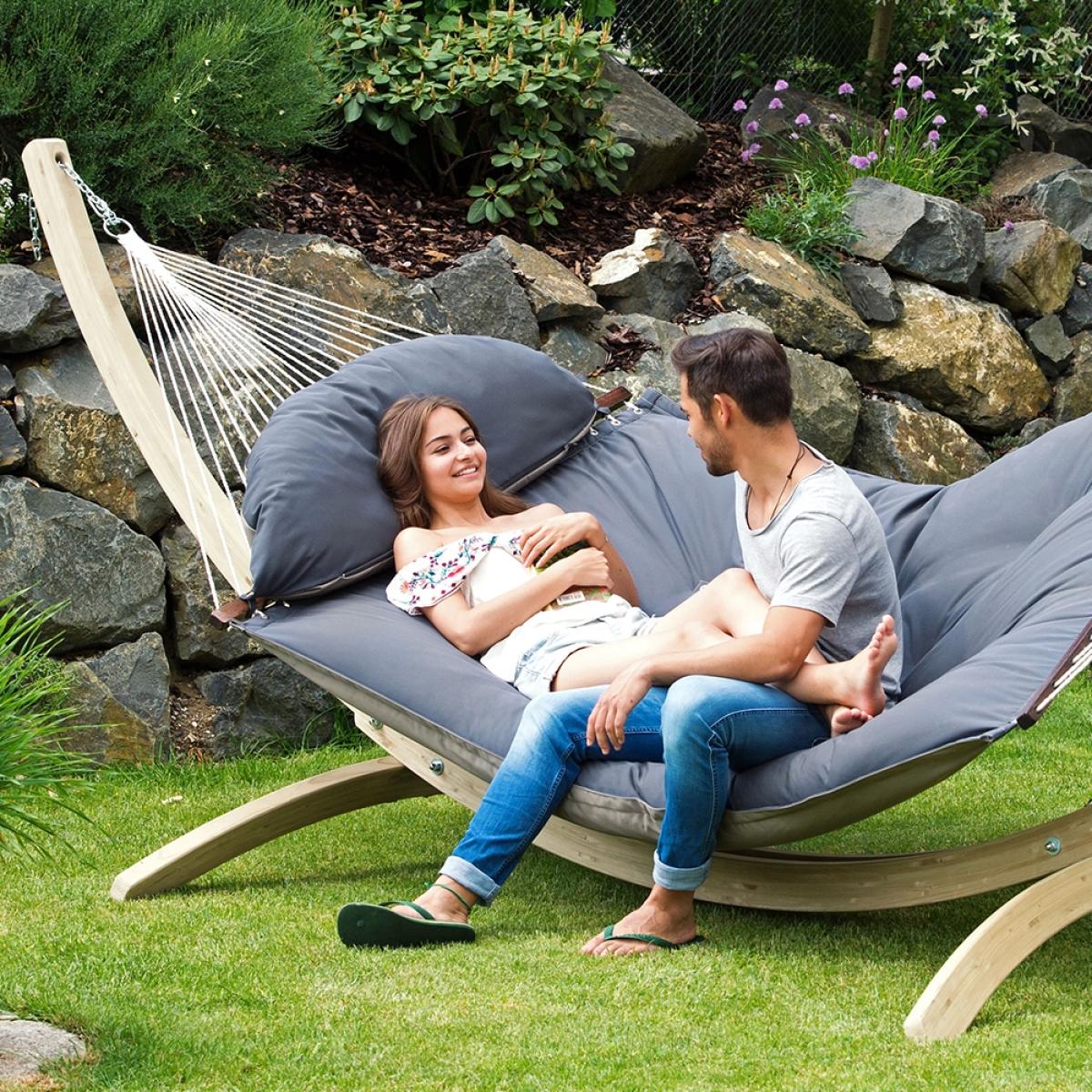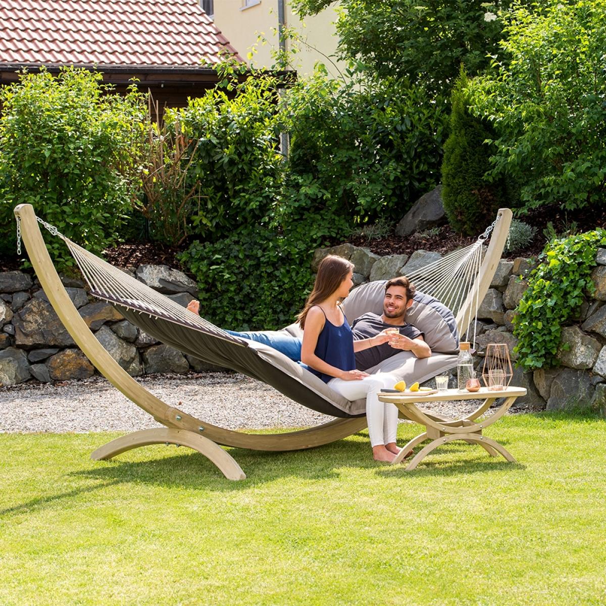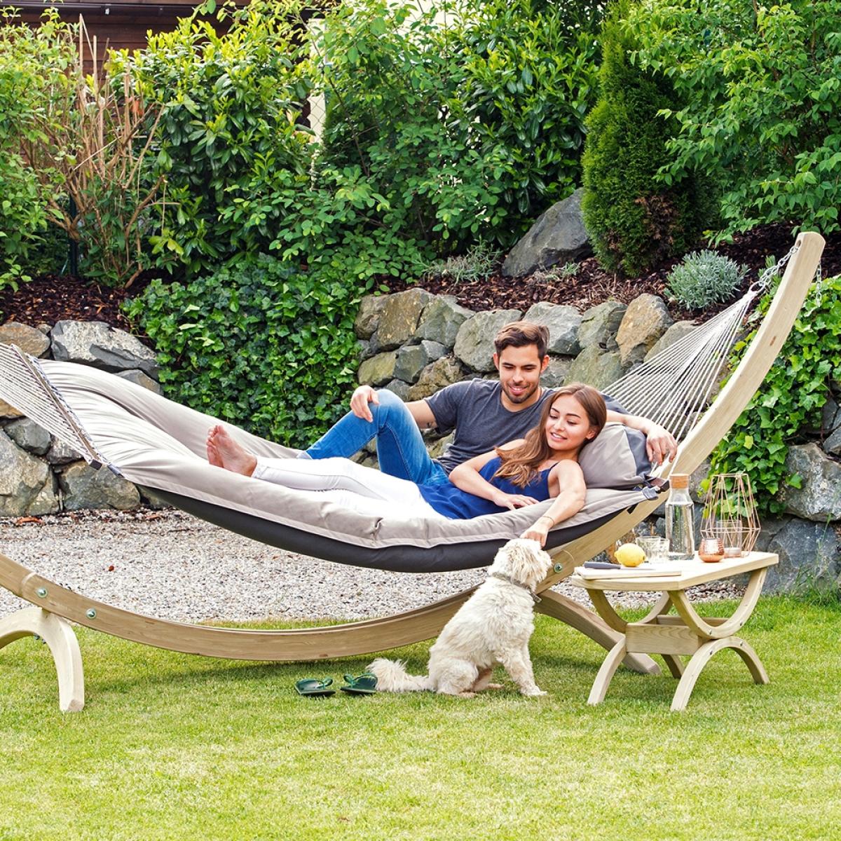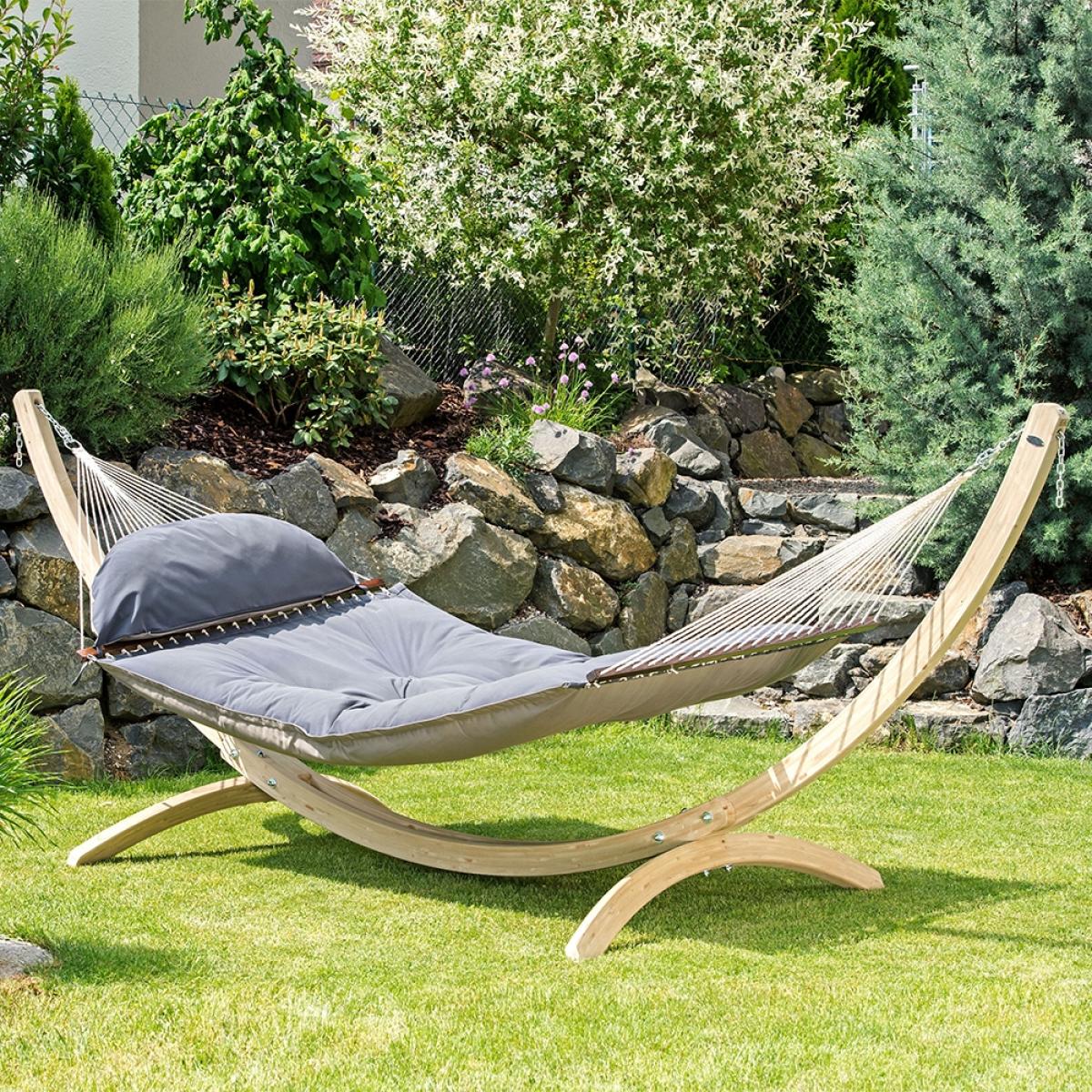 Possibly the most luxurious hammock you'll ever lay on, the Reversible Fat Hammock from Amazonas will leave you feeling completely rested and relaxed. Especially designed with a thick cushioned filling, a large removable pillow and a spreader bar at either end, snuggle into the soft fabric and enjoy the glorious summer sunshine in pure comfort. With the option to flip the bed over; choose from two gorgeous colours, Anthracite grey or taupe. Made from a solution dyed acrylic to protect against staining, the weatherproof fabric and padding ensure your hammock is protected whatever the weather! Not just for outside, bring your hammock indoors and enjoy swinging at any time of day. With the option to attach to a wall, secure between two trees or pair with the Olymp stand, hanging your hammock has never been simpler. With so much to offer, you'll wonder why it took you so long to invest in an Amazonas hammock!.