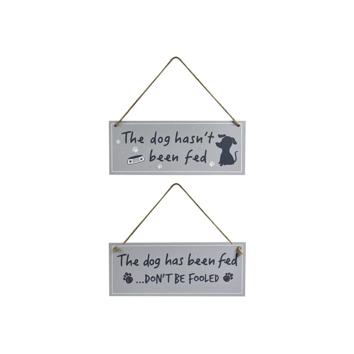 The Reversible Hanging Dog Food Sign is a fun novelty home accessory for any dog owner. The sign has two sides: on one side, it reads, 'The dog hasn't been fed', and on the other, it says, 'The dog has been fed...don't be fooled.' The plaque is perfect for hanging near your dog's food bowl, so the family always know whether the dog needs feeding or is just trying to coax more food from you. It's accented with paw prints and has a subtle grey tone for easy coordination.