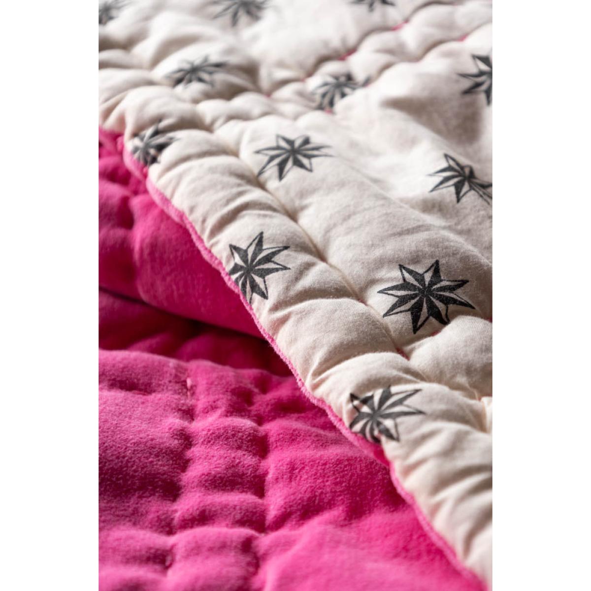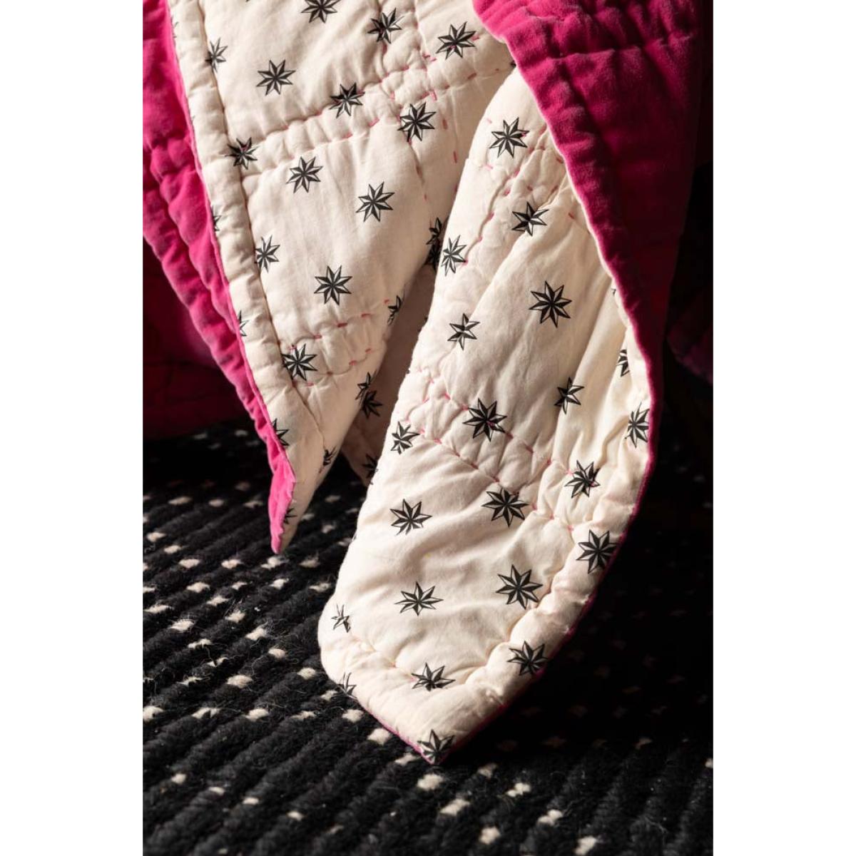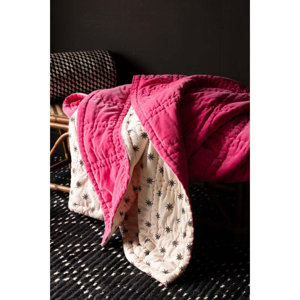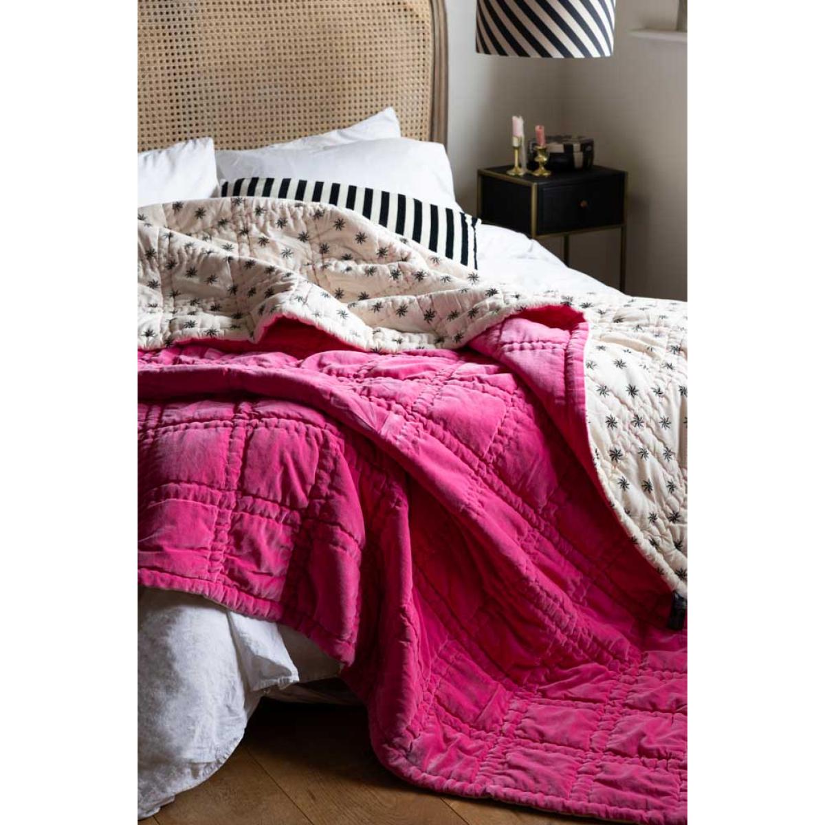 This gorgeous Pink Star Reversible Throw is designed to dazzle, captivate and comfort. Created using a confident pop of colour that’s just perfect for making everyday moments brighter, one side features an opulent confection of vibrant pink velvet to add splash of magical sophistication to any room, while the reverse consists of a chic monochrome star pattern to provide a stylish contrast. It gives you the flexibility to switch up your style with ease, whether this is your go-to piece for snuggling down with for an evening of Netflix, or using in the bedroom as a mood-boosting statement piece that ties the entire room together. - Reversible Hot Pink Star Throw- Measures: 220cm x 240cm - Rockett St George Exclusive Design - Material: 100% Cotton and Velvet - Velvet is dry clean only - As a raised pile fabric, velvet can show subtle crushing lines and bruising from the manufacturing process - this is not considered a flaw. - Please note that this throw features hand-dyed velvet and artisan block printed fabric, with variation in colour and print expected. <!--td -->