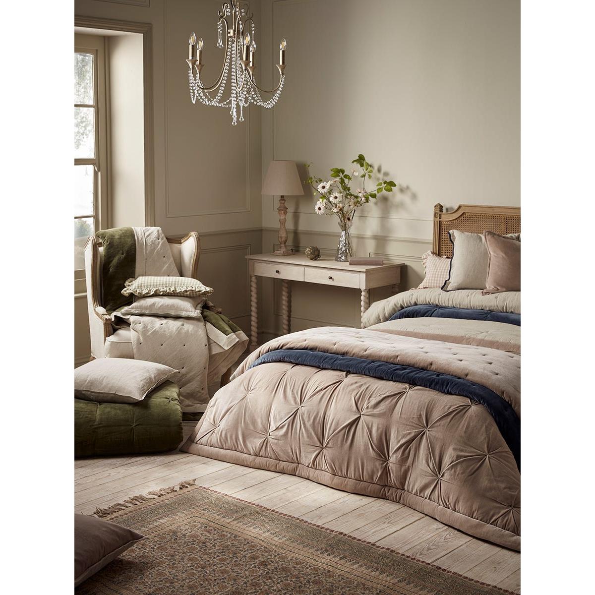 I love this reversible velvet and cotton linen quilt for adding both texture and colour to a cosy bedroom setting. Its steel blue shade is versatile and works well in both classic and contemporary interiors, especially those with muted or neutral palettes. The velvet side brings a touch of luxe, ideal for creating an inviting, plush feel, while the linen reverse offers a more relaxed, casual vibe. For styling, try layering it over crisp white or soft grey bedding to enhance its richness, and add cushions in complementary shades or fabrics to create depth. Practical tips include using the velvet side during colder months for extra warmth or flipping to linen for a breezier look in lighter, warmer seasons. It’s a particularly good choice for making a statement while maintaining a cosy, lived-in ambiance.