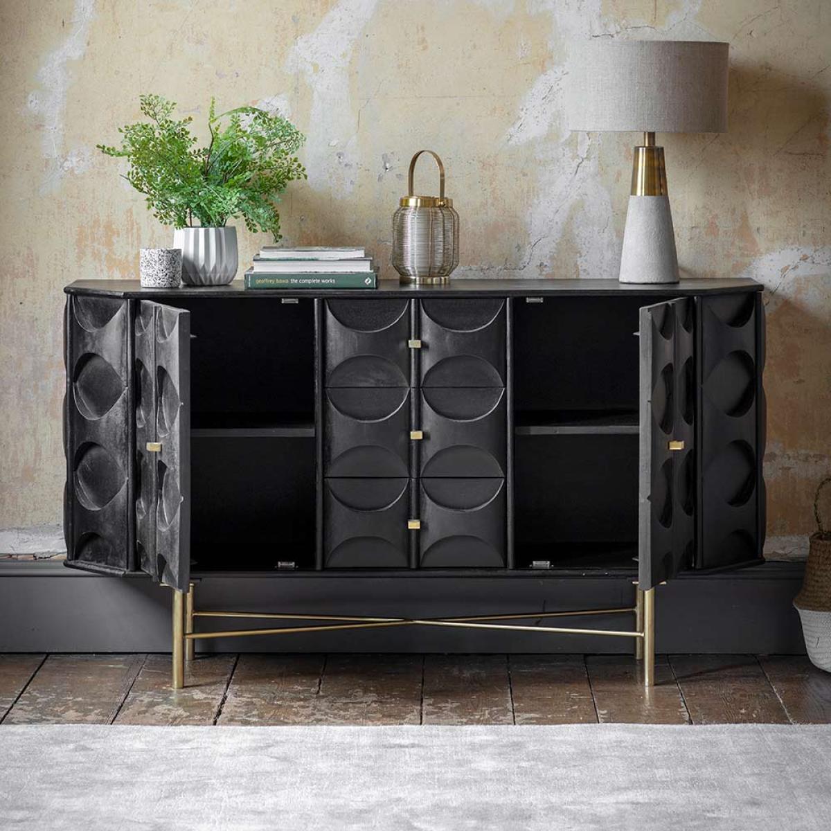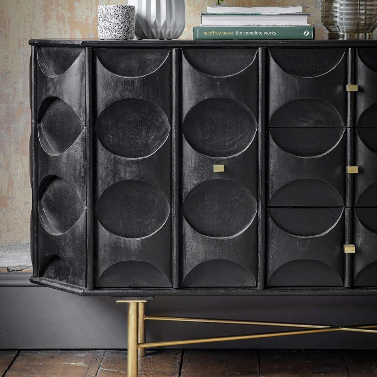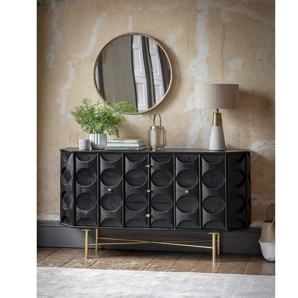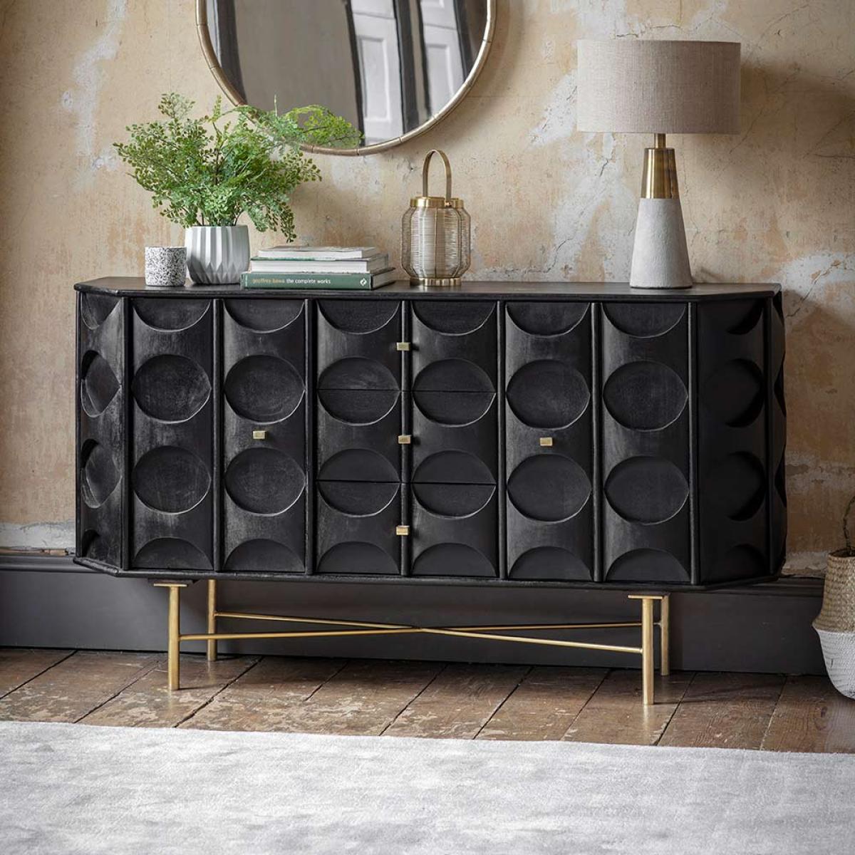 I’m a big fan of the Revo sideboard for its bold, geometric frontage and slim brass-finish legs - it instantly becomes a focal point without feeling heavy. It works brilliantly in modern, art-deco or mid-century schemes, and can ground a neutral palette or add contrast in a lighter room. For styling, keep the top relatively uncluttered: a low stack of coffee-table books, a single sculptural vase or a potted fern for height, and perhaps a small lamp off to one side. If you use it in a dining area, a round mirror or pared-back artwork above will echo those circular door patterns and help the piece sit naturally in the space.