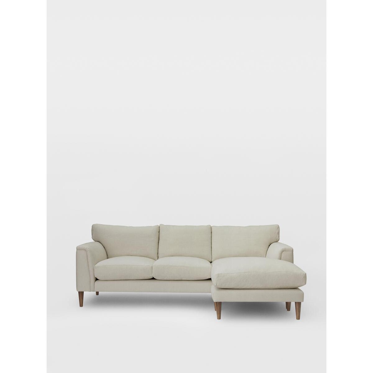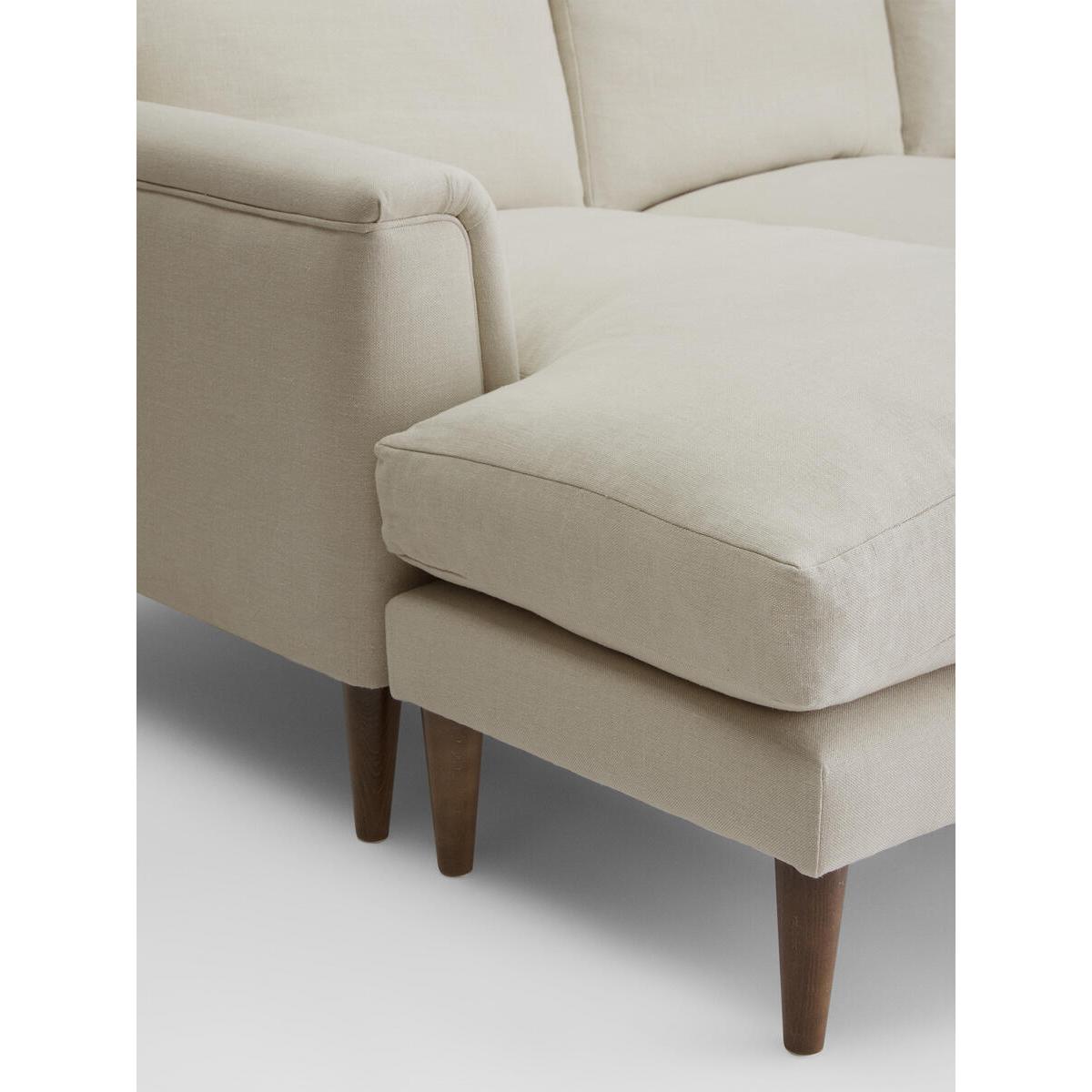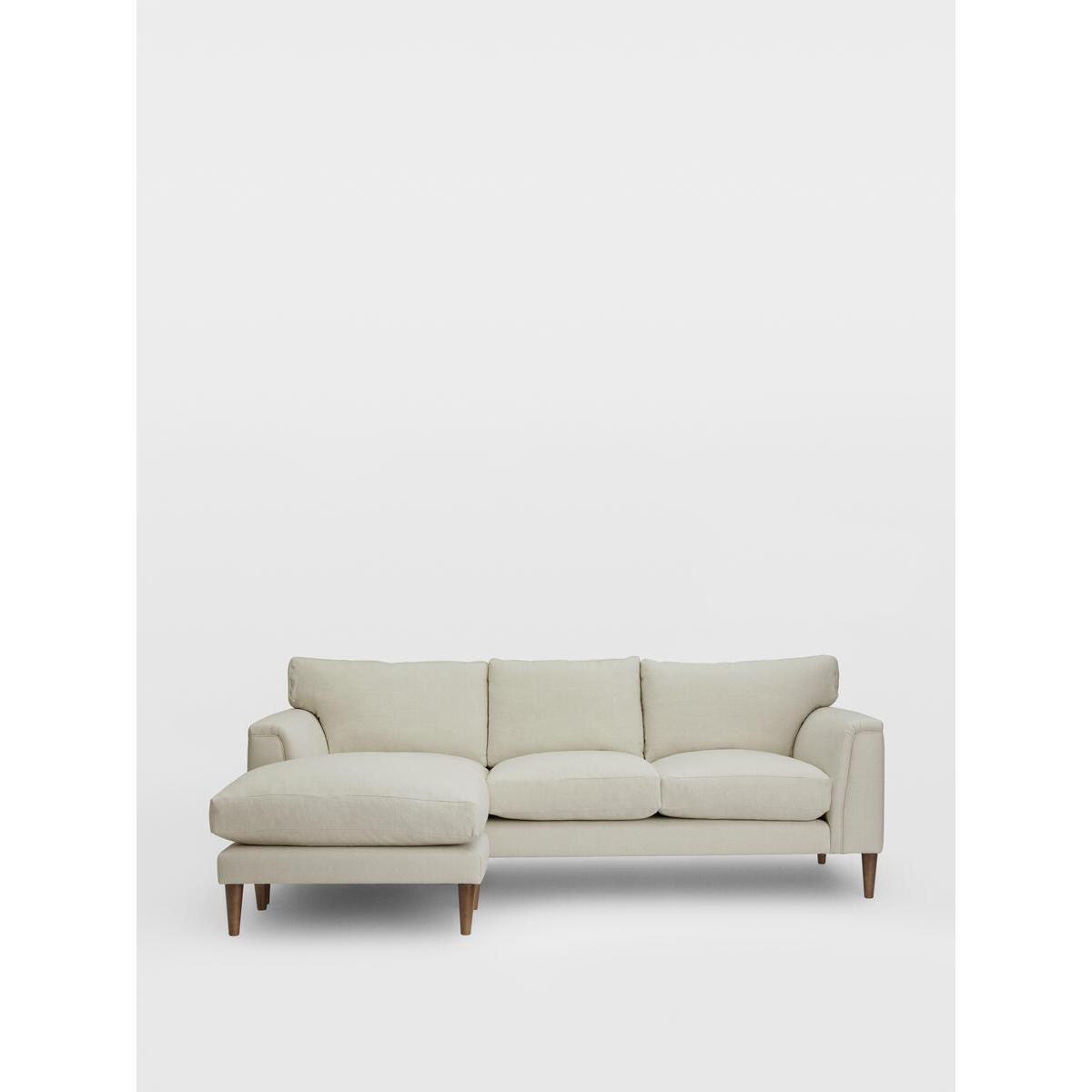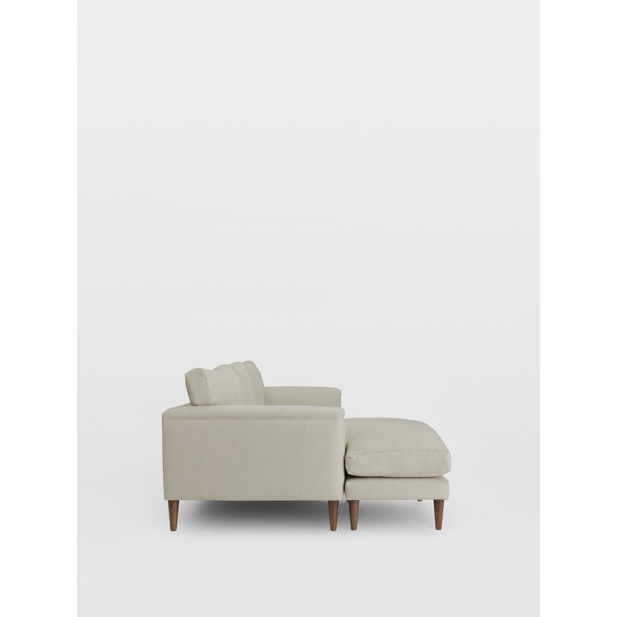 With its subtle curved corners and cushioned armrests, the linen Reya Chaise End sofa is influenced by the furniture at DUMBO Housein Brooklyn. Slender turned beech legs lift it off the floor tocreate a sense of space, while the feather and down-wrapped cushionhas a foam core for extra comfort. Each one is handcrafted in Long. Eaton, Derbyshire by a family firm of furniture makers. Flexible linen chaise end sofa with cushioned armrests. Separate ottoman with a concealed alligator clip that connects tosofa. Ottoman can be fixed to the left or right-hand side. Scandinavian birch frame. Turned solid beech legs. Handmade in England. Foam-wrapped feather and down cushions. Reversible cushions for durability and longevity. Inspired by DUMBO House.