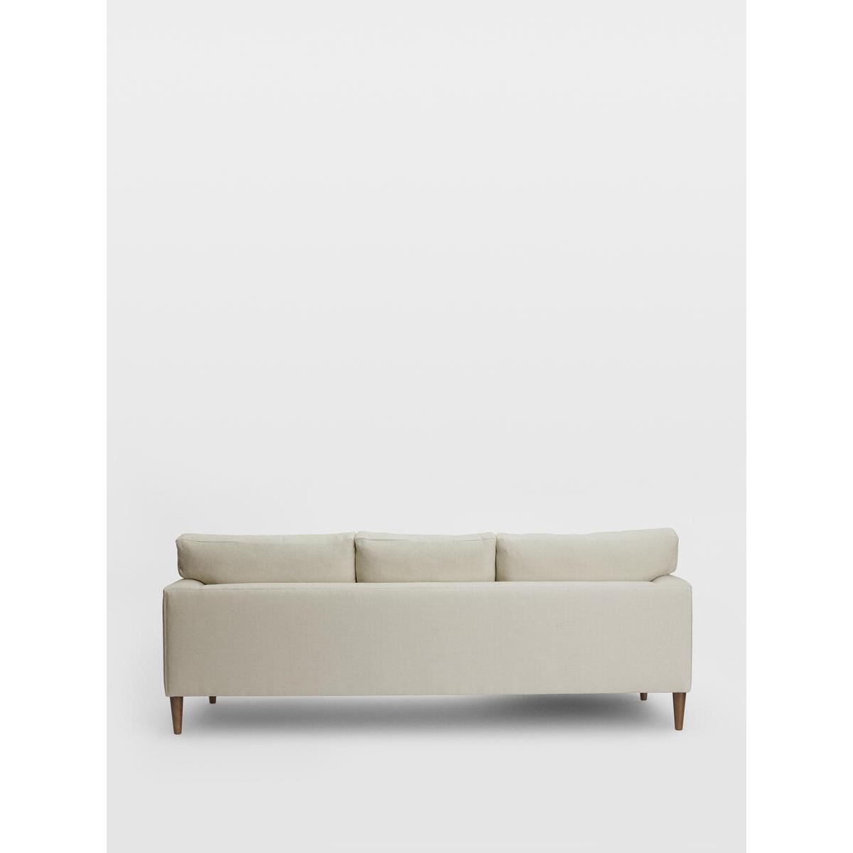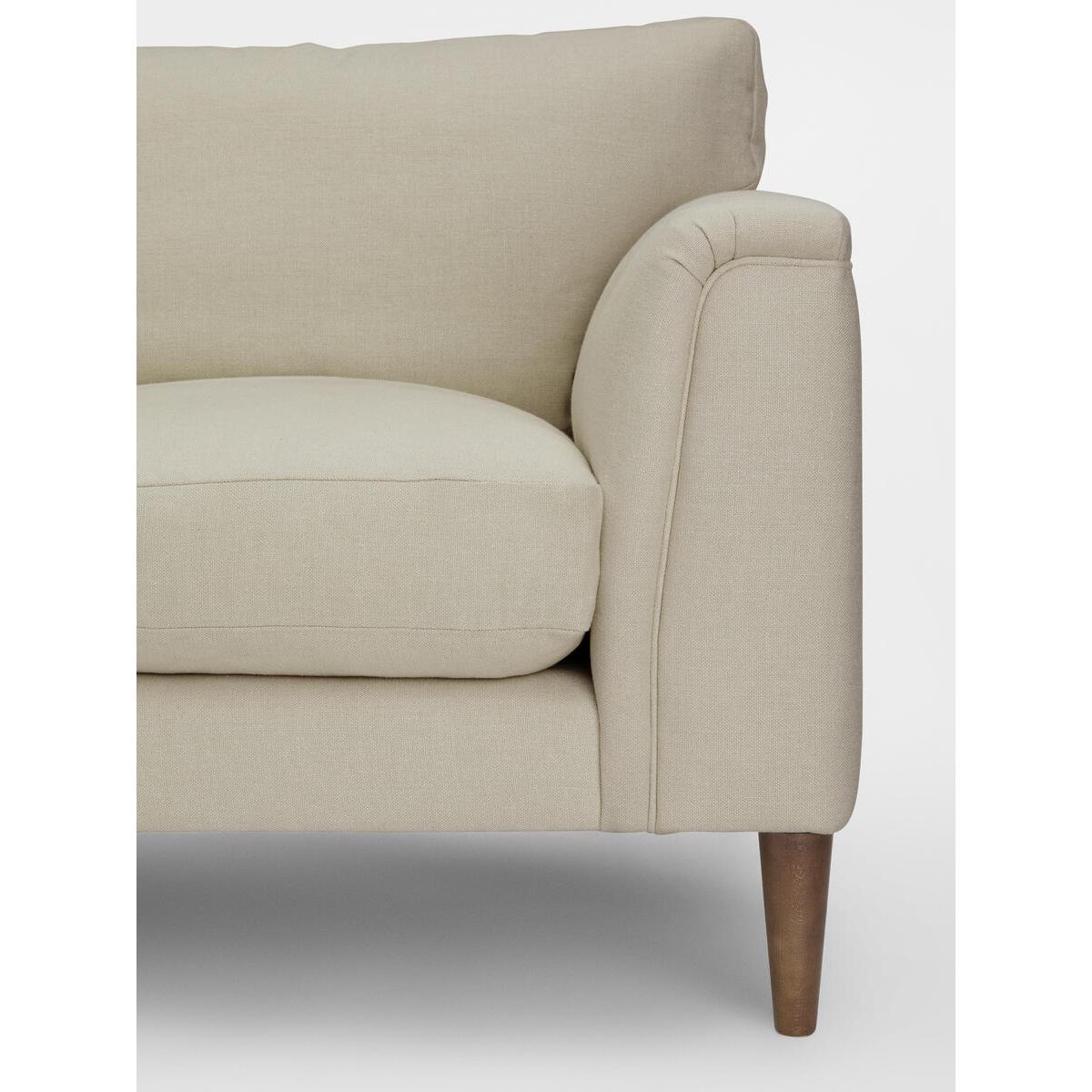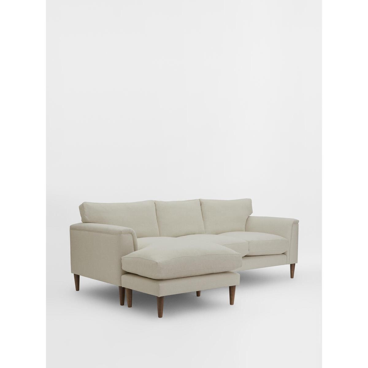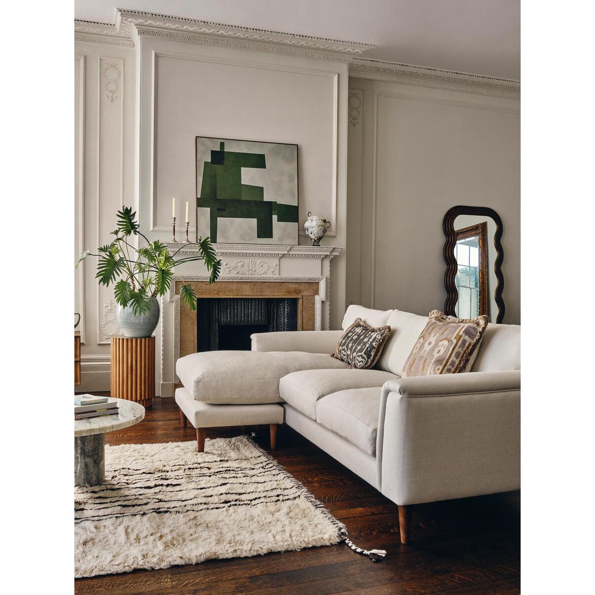 With its subtle curved corners and cushioned armrests, the linen Reya Chaise End sofa is influenced by the furniture at DUMBO Housein Brooklyn. Slender turned beech legs lift it off the floor tocreate a sense of space, while the feather and down-wrapped cushionhas a foam core for extra comfort. Each one is handcrafted in Long. Eaton, Derbyshire by a family firm of furniture makers. Flexible linen chaise end sofa with cushioned armrests. Separate ottoman with a concealed alligator clip that connects tosofa. Ottoman can be fixed to the left or right-hand side. Scandinavian birch frame. Turned solid beech legs. Handmade in England. Foam-wrapped feather and down cushions. Reversible cushions for durability and longevity. Inspired by DUMBO House.