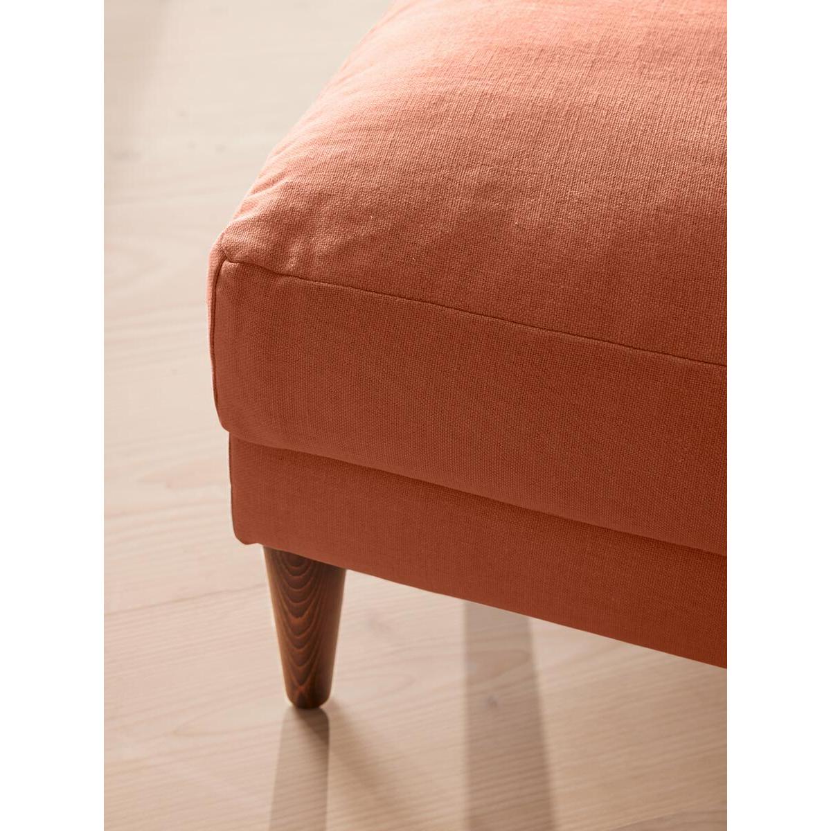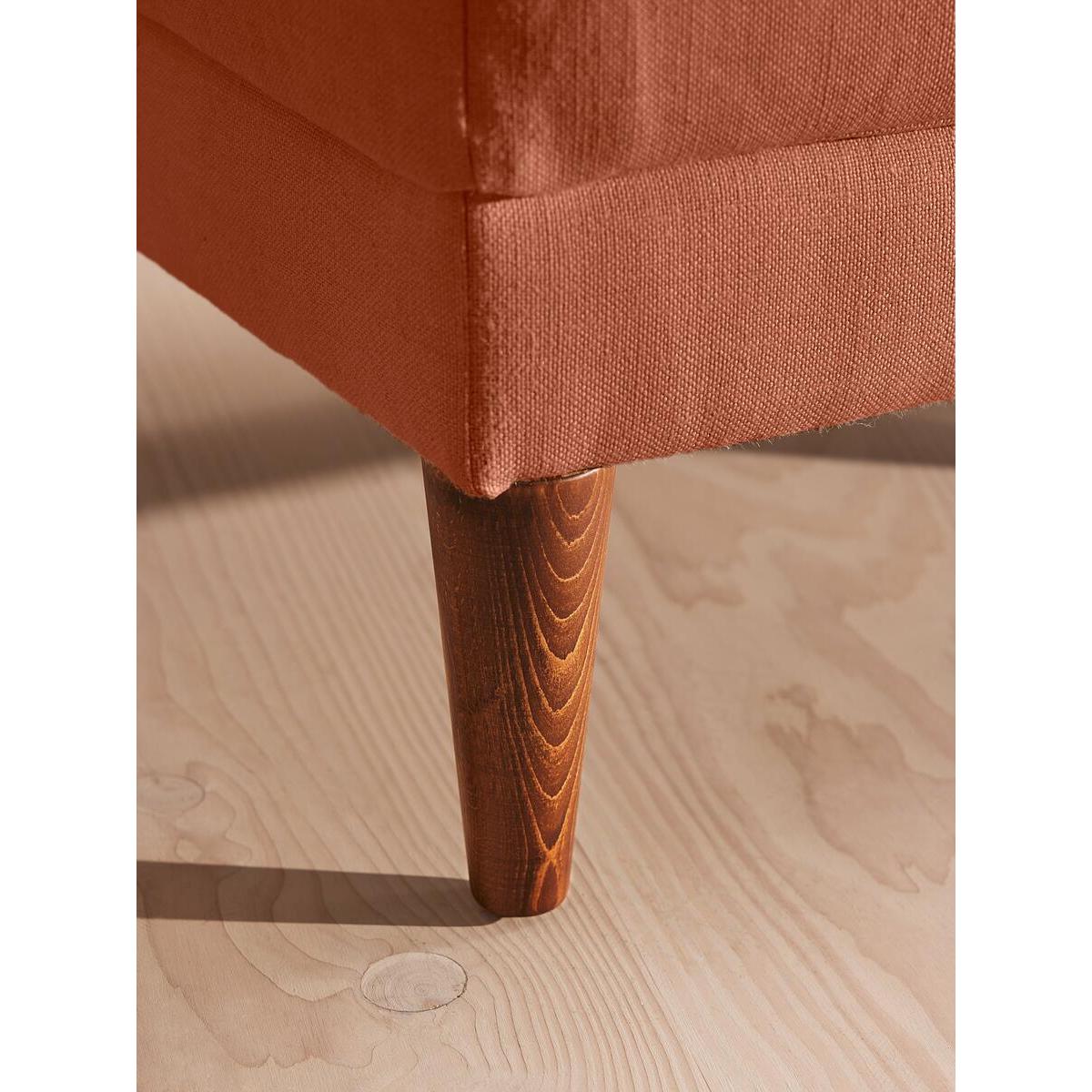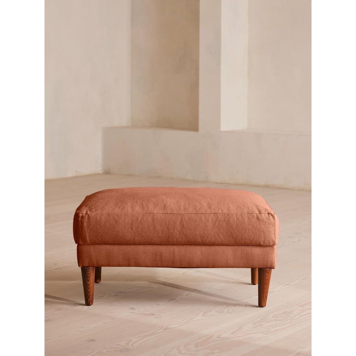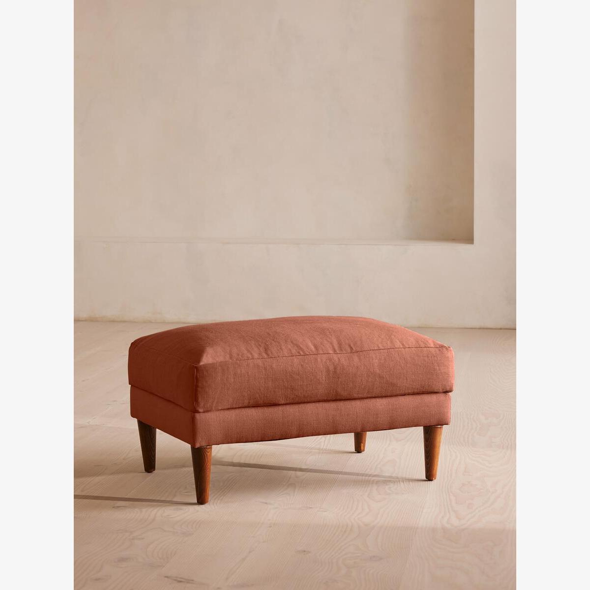 Handcrafted in North Carolina, our Reya ottoman is ideal for putting your feet up and relaxing. Inspired by the furniture at DUMBO House, Brooklyn, the foam cushioned profile is upholstered in natural linen with turned walnut legs. Use as an extra seat for guests, or as a footstool to create a cosy reading nook as we do in the Houses. Rectangle ottoman Upholstered in 100% linen Available in other colours and fabrics Plywood frame Turned solid walnut legs Handmade in North Carolina, USA Fibre-wrapped foam cushion Inspired by DUMBO House