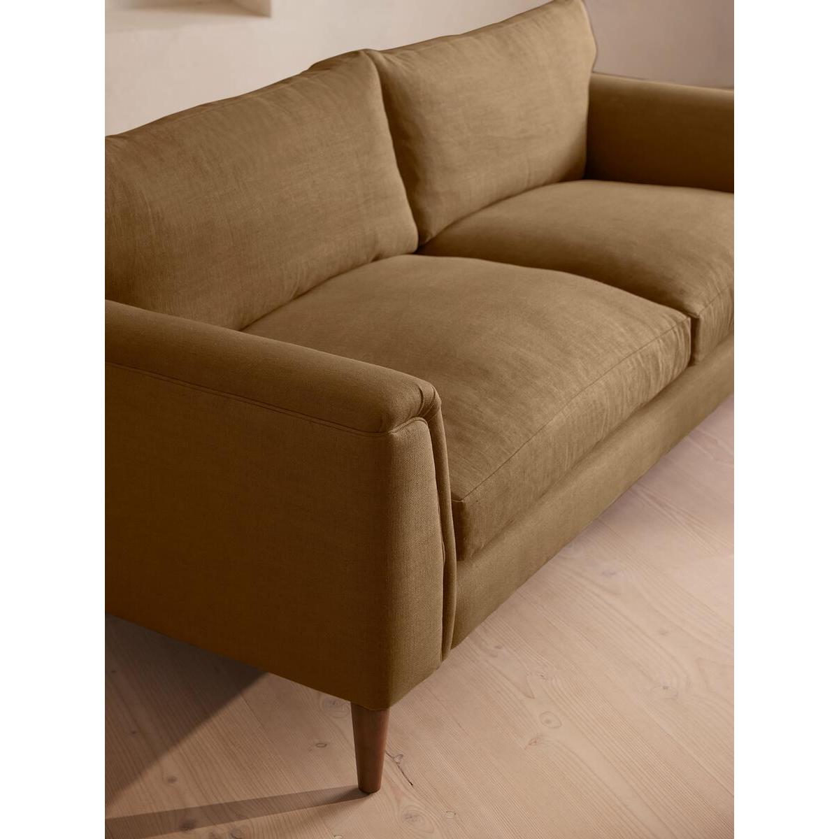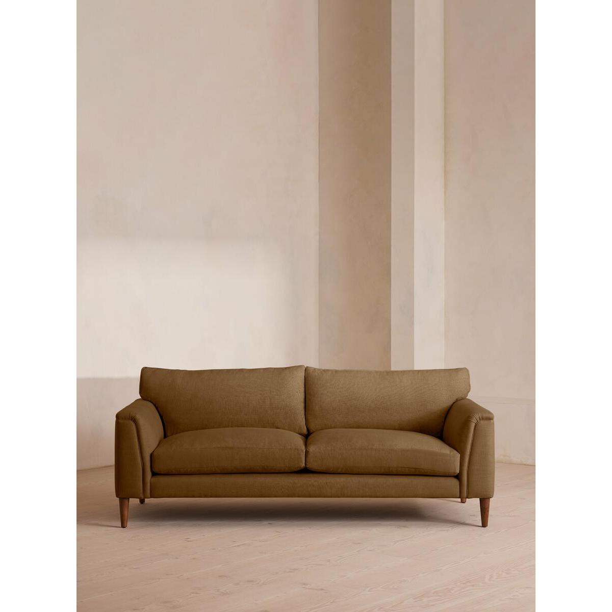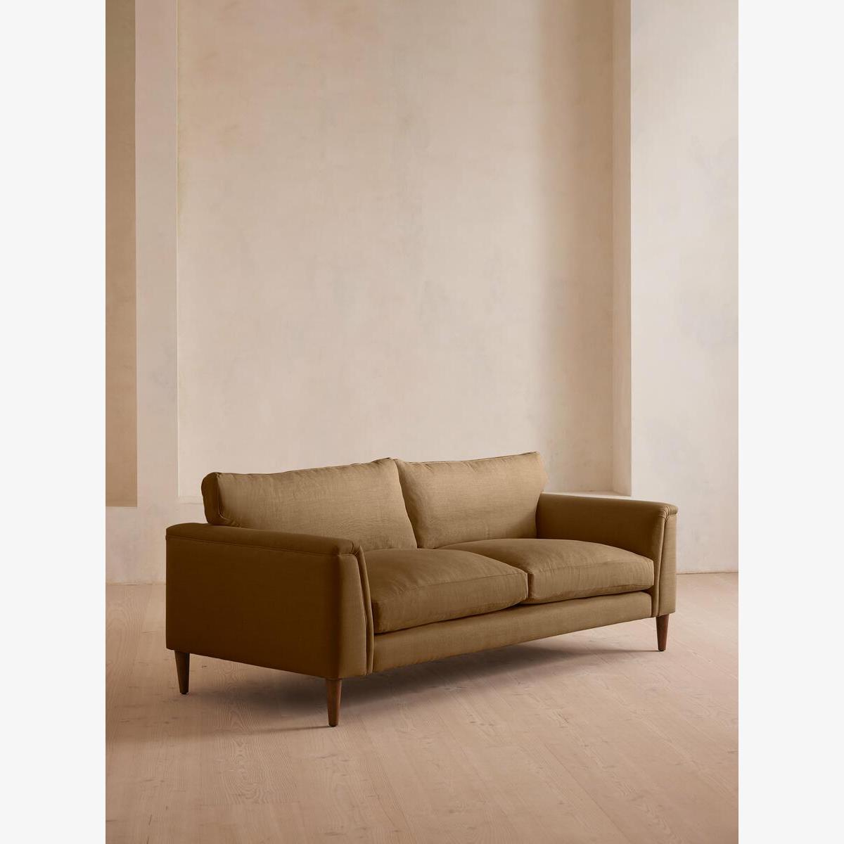 I love this three-seater sofa for its versatile and timeless appeal. The linen fabric in ochre adds warmth and a hint of colour, making it an excellent statement piece in both modern and more traditional interiors. It works well in neutral-toned living rooms, where it can be complemented with textured cushions and layered throws, or in Scandinavian-inspired spaces for a pop of earthy hue. Practical styling tips include pairing it with minimalist coffee tables and soft lighting to highlight its simple elegance. Its sleek profile and subtle wooden legs make it adaptable, ensuring it remains a focal point without overwhelming a room.