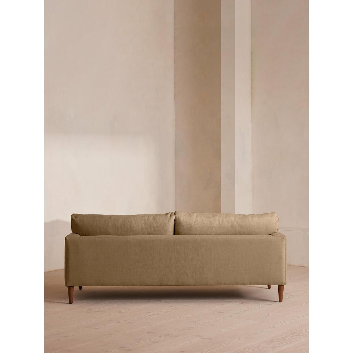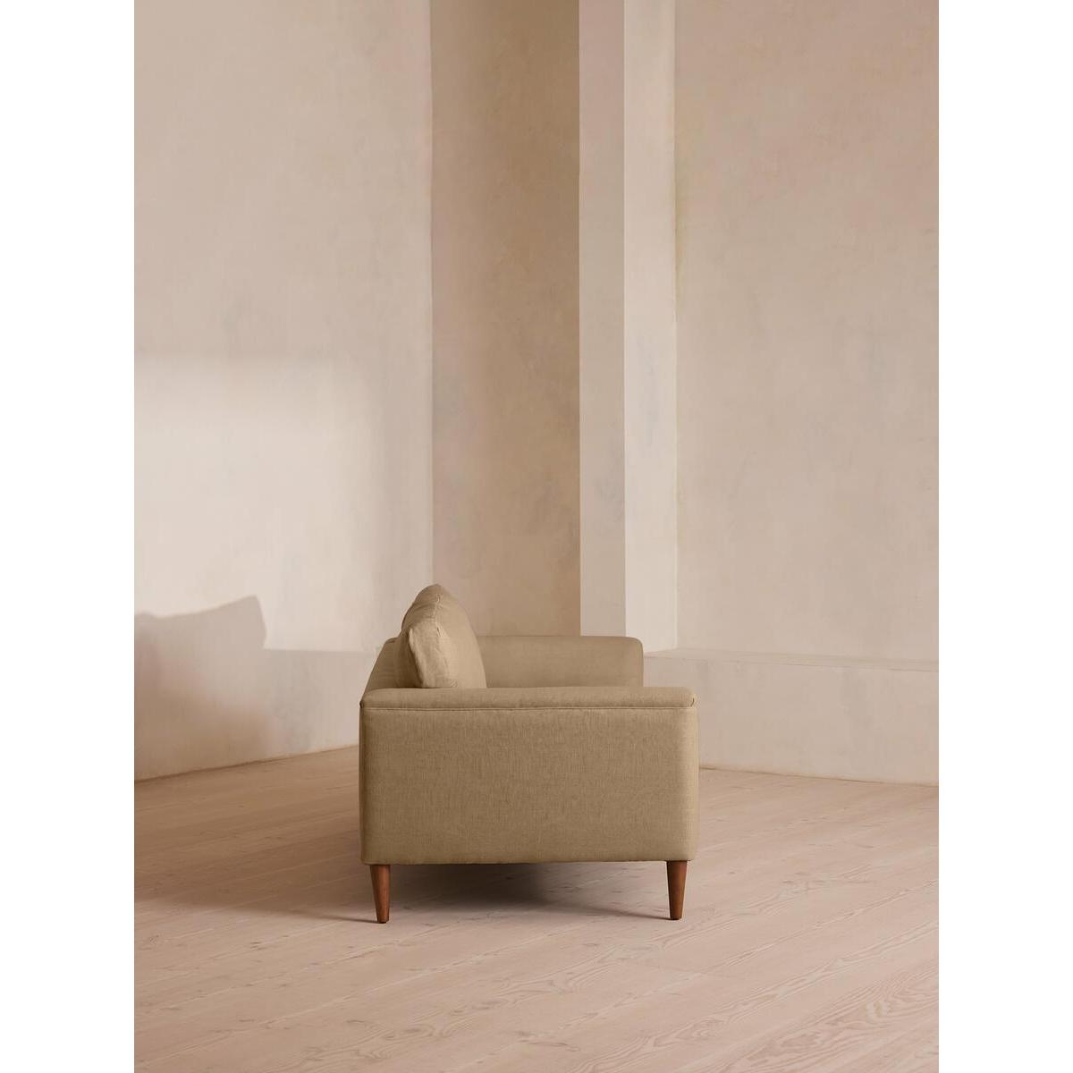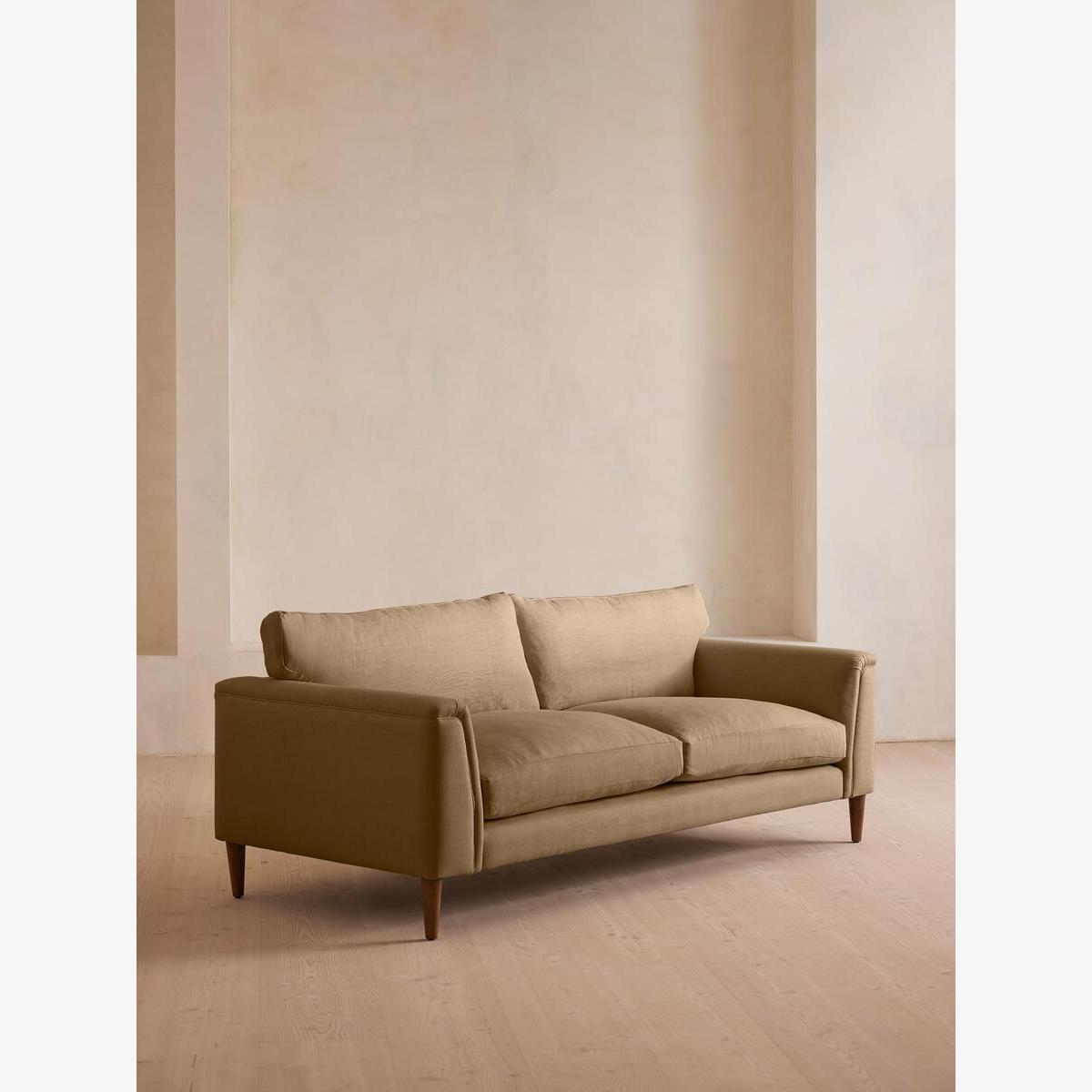 Our Reya sofa invites you to sink into its comfortable, cushioned curves for only relaxing moments in mind. The mid-century design takes inspiration from similar interiors seen throughout DUMBO House, with rich velvet upholstery and turned walnut legs that lift this sofa off the floor creating the illusion of more space. Pair with our Reya ottoman and loveseat for the full look. Three-seater sofa Upholstered in cotton velvet Available in other colours and fabrics Mid-century design Cushioned armrests Slender turned walnut legs Foam core feather-wrapped seat cushions Inspired by DUMBO House, Brooklyn