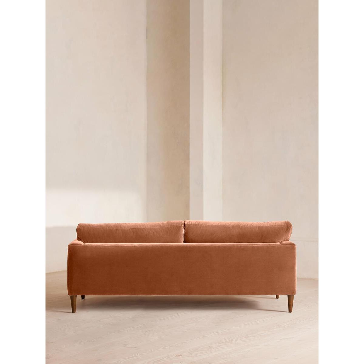 Our Reya sofa invites you to sink into its comfortable, cushioned curves for only relaxing moments in mind. The mid-century design takes inspiration from similar interiors seen throughout DUMBO House, with rich velvet upholstery and turned walnut legs that lift this sofa off the floor creating the illusion of more space. Pair with our Reya ottoman and loveseat for the full look. Three-seater sofa Upholstered in cotton velvet Available in other colours and fabrics Mid-century design Cushioned armrests Slender turned walnut legs Foam core feather-wrapped seat cushions Inspired by DUMBO House, Brooklyn