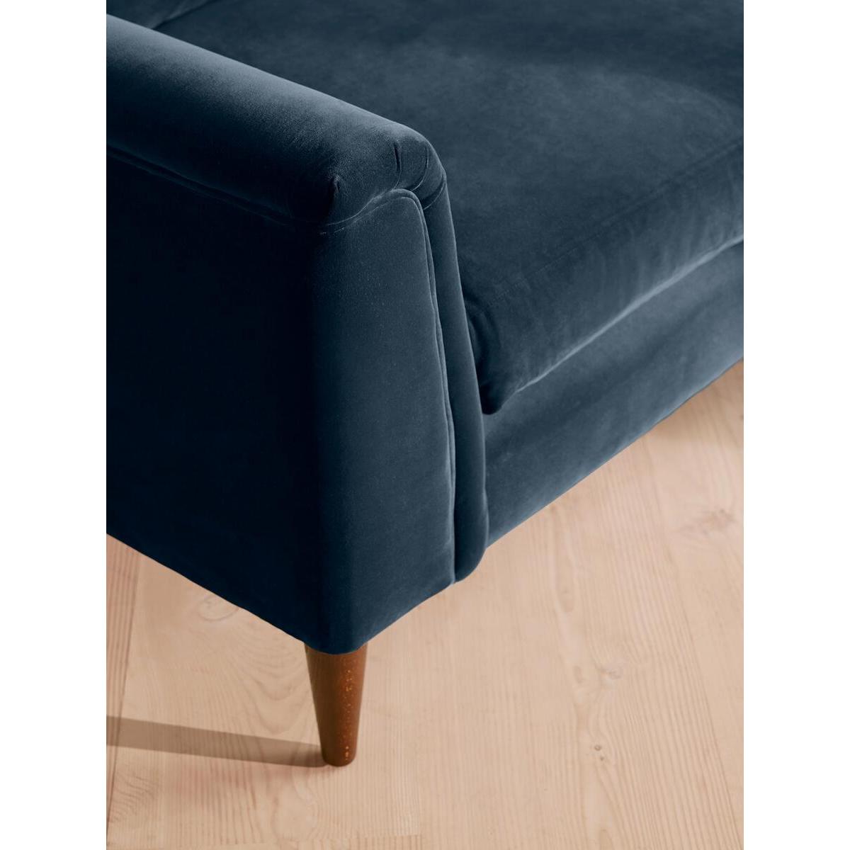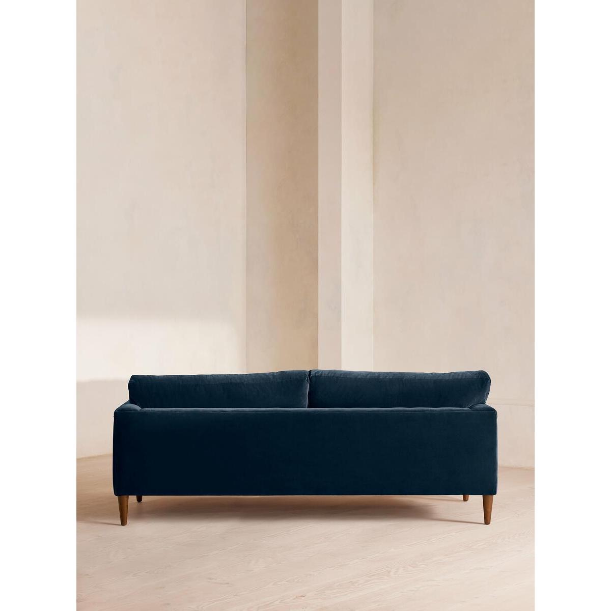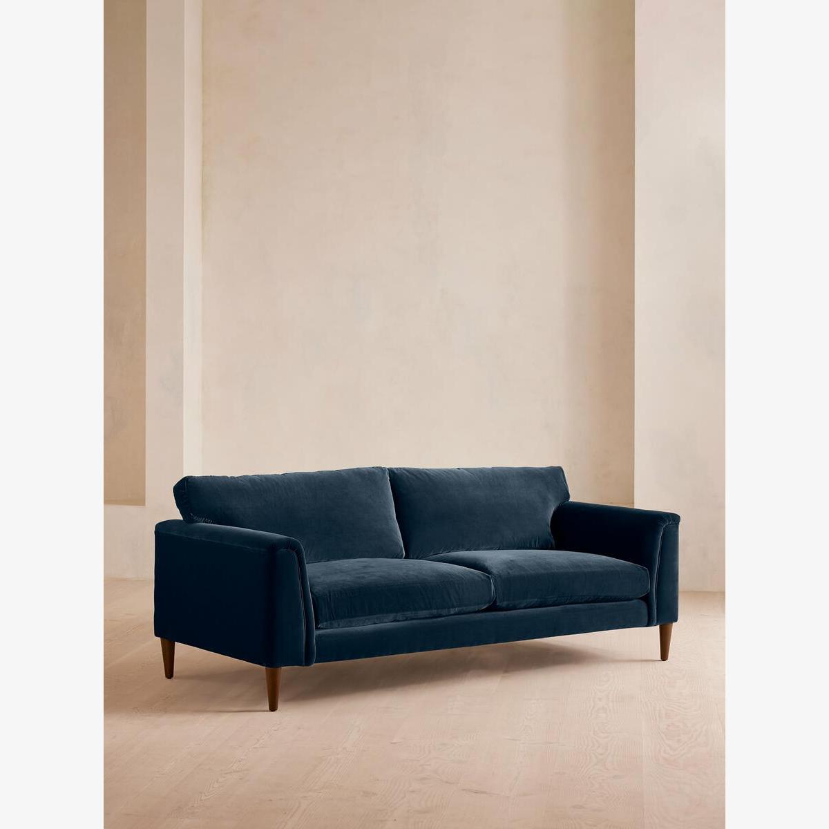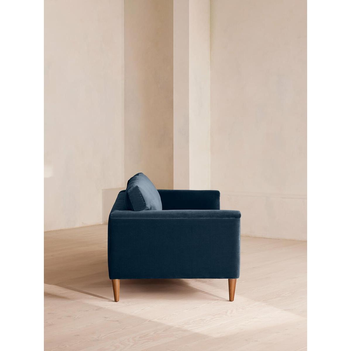 Our Reya sofa invites you to sink into its comfortable, cushioned curves for only relaxing moments in mind. The mid-century design takes inspiration from similar interiors seen throughout DUMBO House, with rich velvet upholstery and turned walnut legs that lift this sofa off the floor creating the illusion of more space. Pair with our Reya ottoman and loveseat for the full look. Three-seater sofa Upholstered in cotton velvet Available in other colours and fabrics Mid-century design Cushioned armrests Slender turned walnut legs Foam core feather-wrapped seat cushions Inspired by DUMBO House, Brooklyn