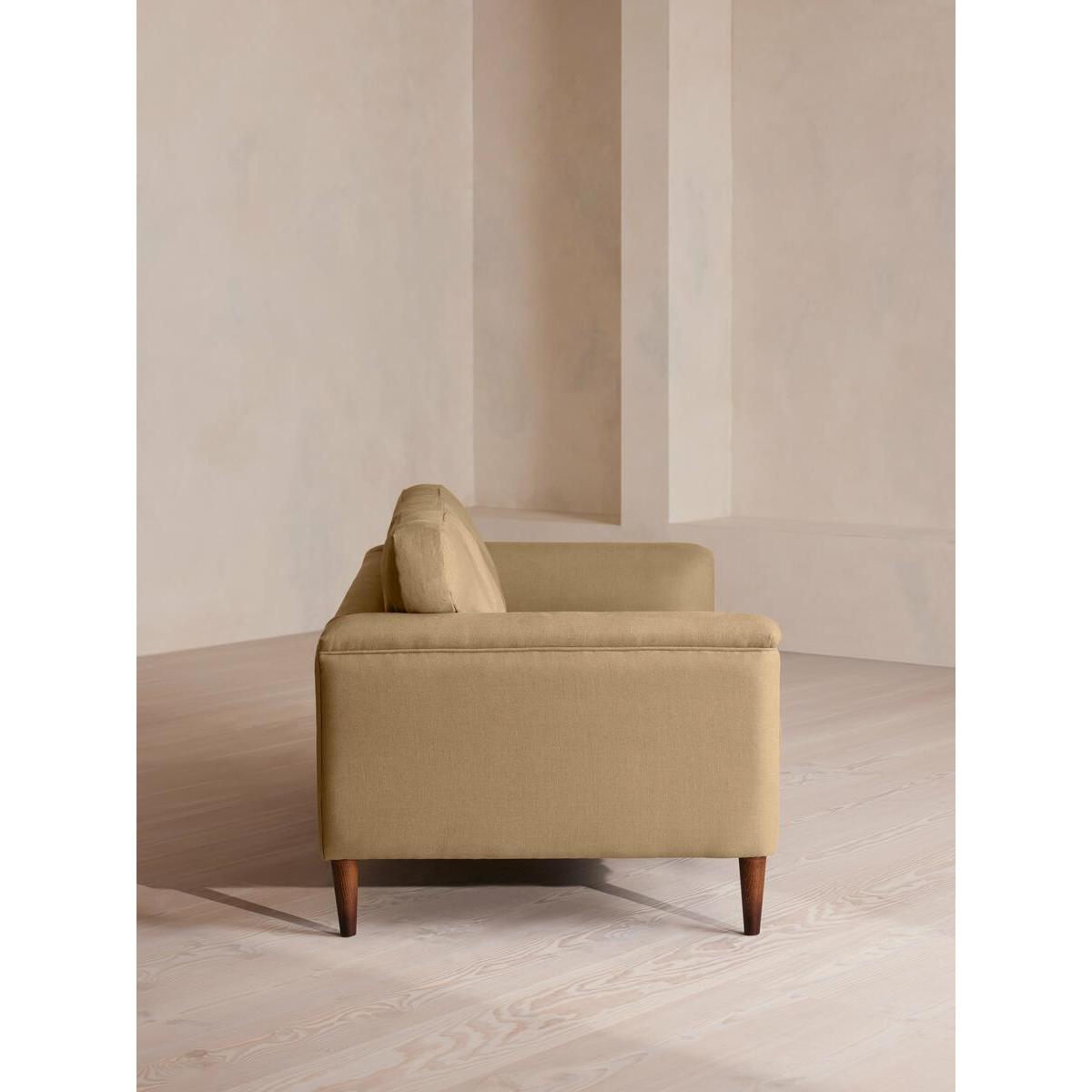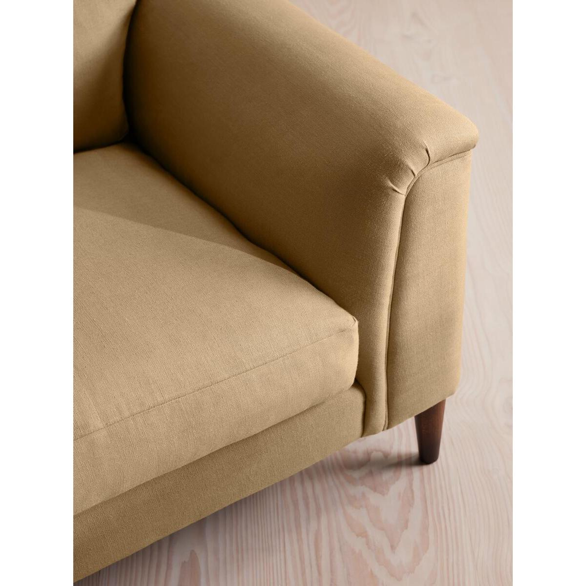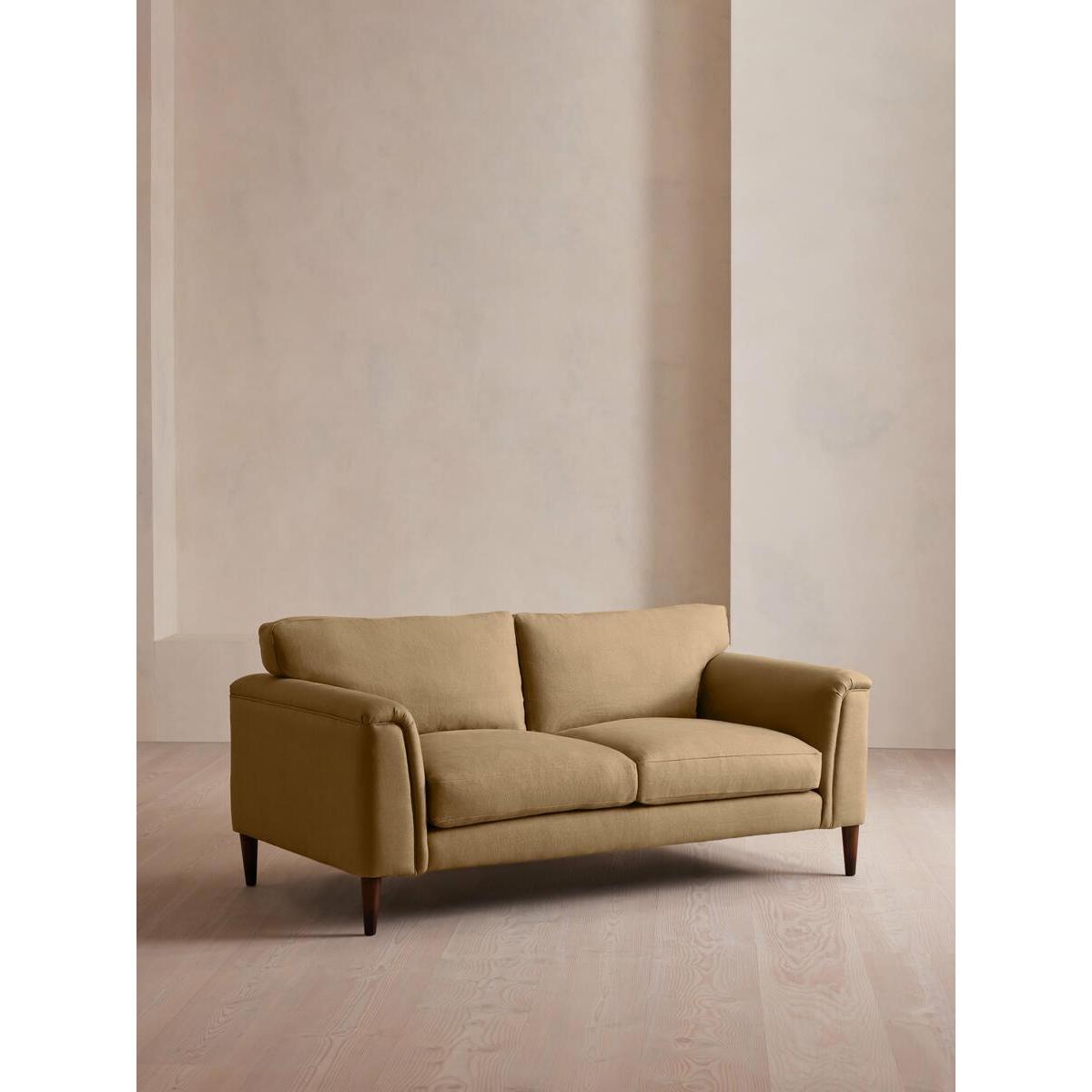 Our Reya sofa invites you to sink into its comfortable, cushioned curves for only relaxing moments in mind. The mid-century design takes inspiration from similar interiors seen throughout DUMBO House, with linen upholstery and turned walnut legs that lift this sofa off the floor creating the illusion of more space. Pair with our Reya ottoman and loveseat for the full look. Three-seater sofa Upholstered in 100% linen Available in other colours and fabrics Mid-century design Cushioned armrests Slender turned walnut legs Foam core feather-wrapped seat cushions Inspired by DUMBO House, Brooklyn