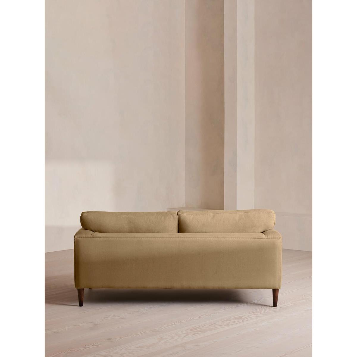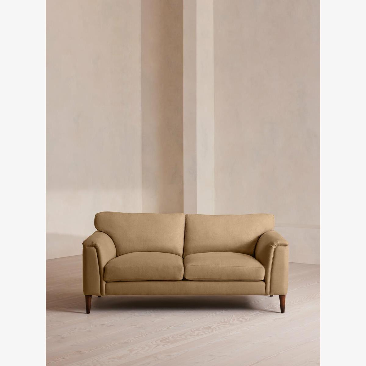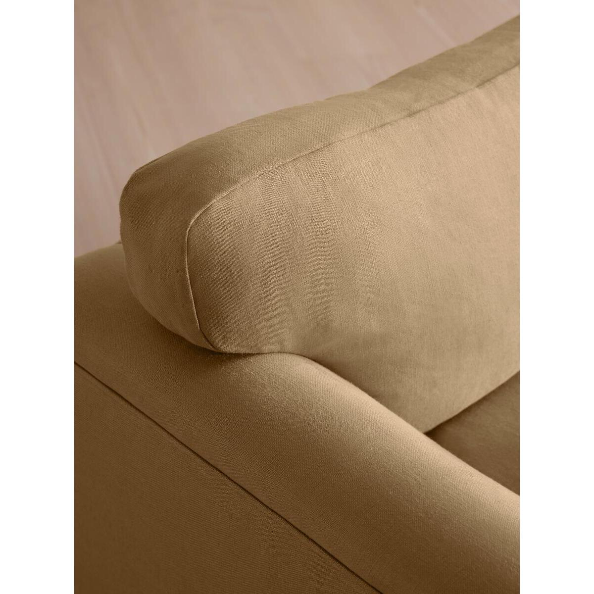 Our Reya sofa invites you to sink into its comfortable, cushioned curves for only relaxing moments in mind. The mid-century design takes inspiration from similar interiors seen throughout DUMBO House, with linen upholstery and turned walnut legs that lift this sofa off the floor creating the illusion of more space. Pair with our Reya ottoman and loveseat for the full look. Three-seater sofa Upholstered in 100% linen Available in other colours and fabrics Mid-century design Cushioned armrests Slender turned walnut legs Foam core feather-wrapped seat cushions Inspired by DUMBO House, Brooklyn